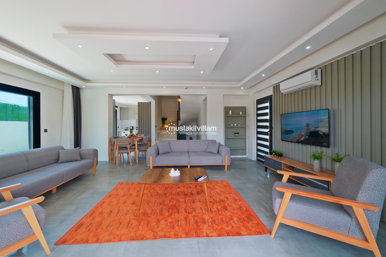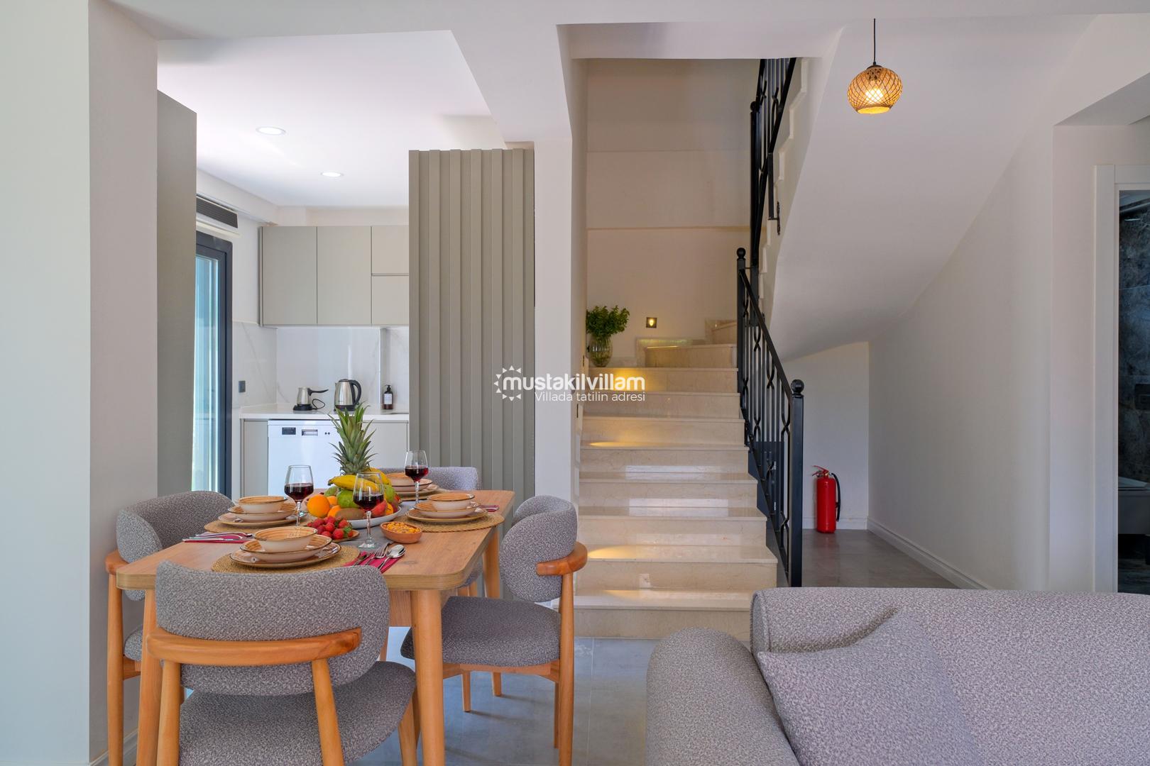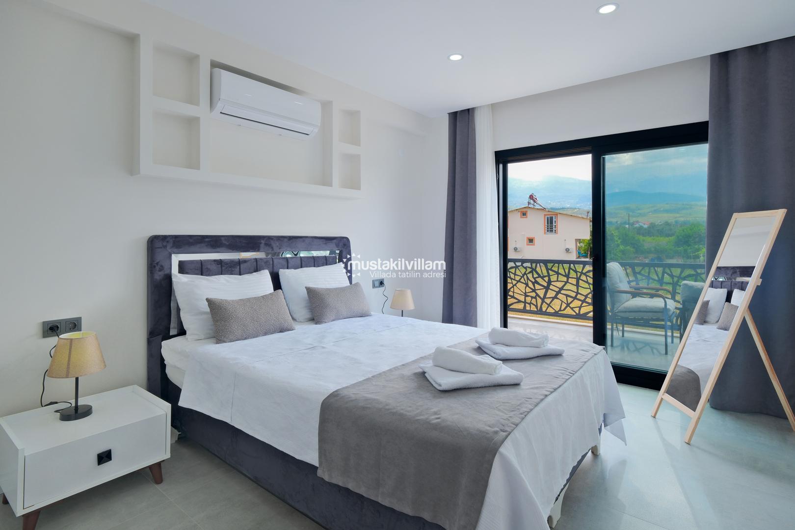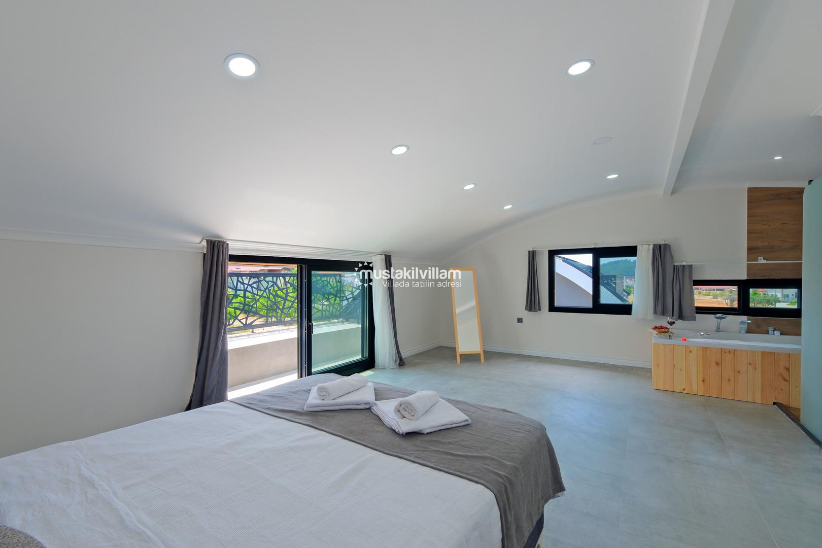 Toplam 3 yatak odası ve 3 banyosu bulunan villamızda, tüm yatak odaları ebeveyn banyolu ve balkonludur. Bu sayede misafirlerimize konforlu ve mahrem bir konaklama alanı sağlanmaktadır. Modern ve şık mobilyalarla dekore edilmiş salon bölümünde rahat bir oturma grubu, klima ve televizyon yer almaktadır. Tam donanımlı açık mutfakta buzdolabı, ankastre ocak ve fırın, bulaşık makinesi ve ihtiyaç duyabileceğiniz tüm mutfak ekipmanları bulunmaktadır.