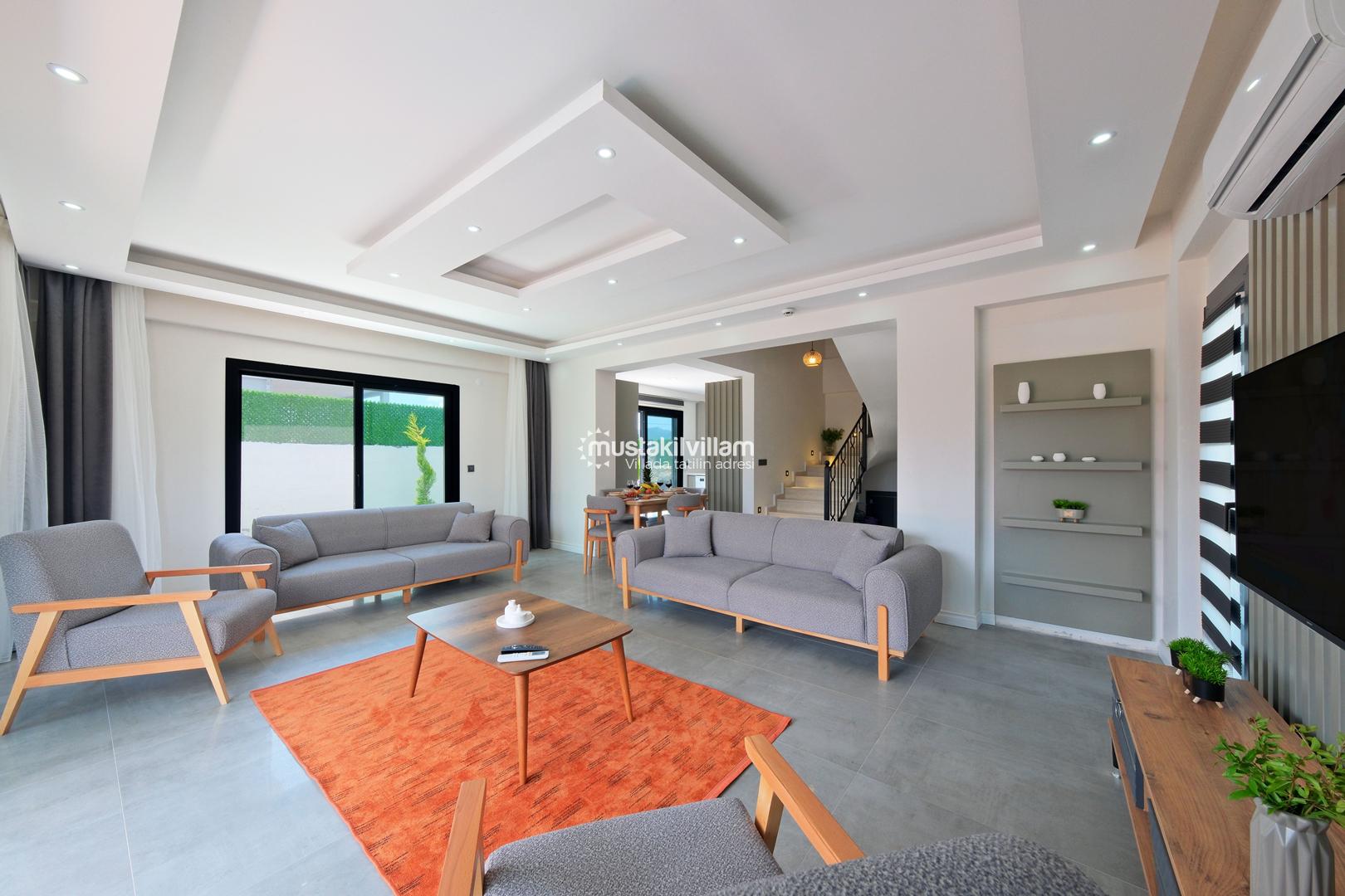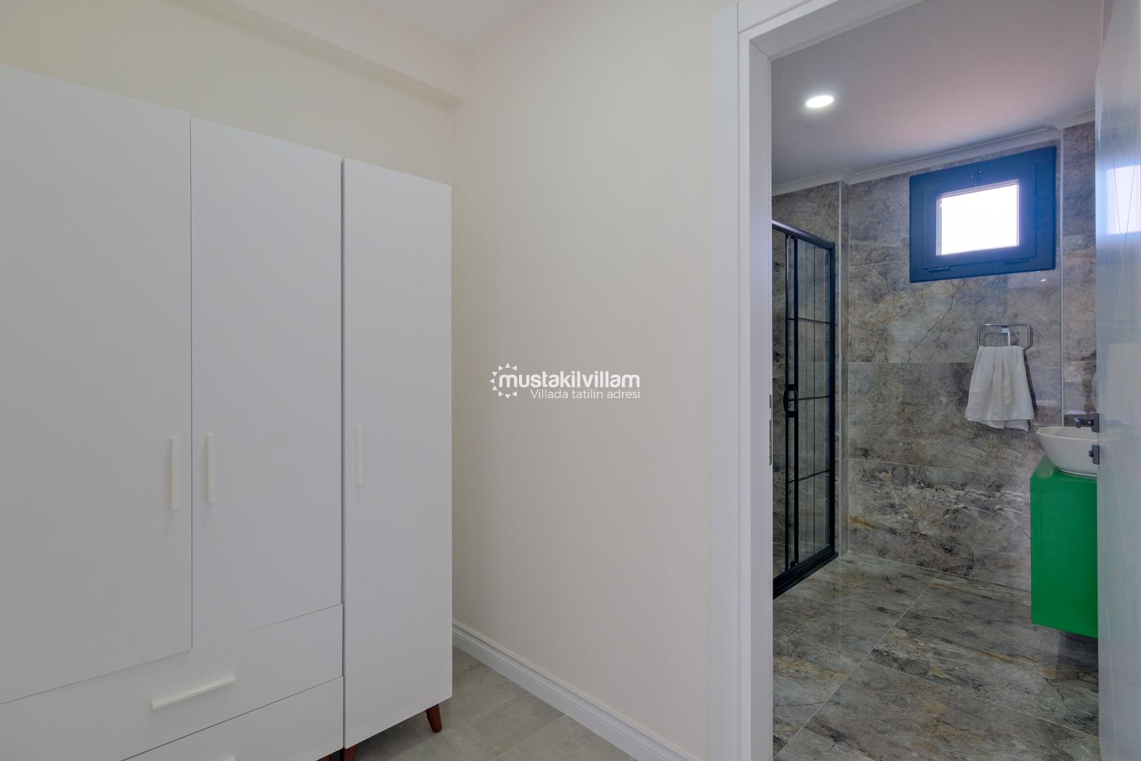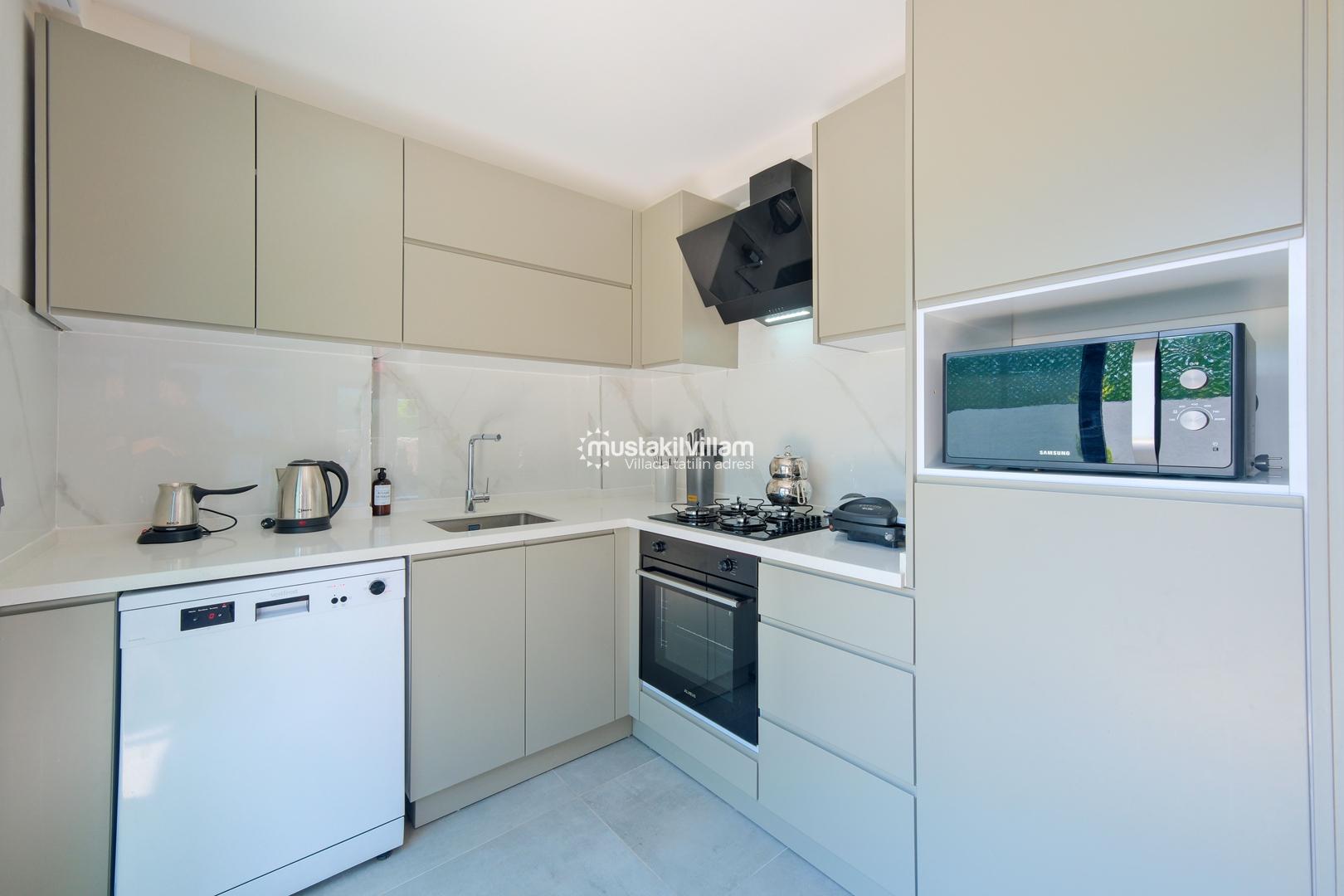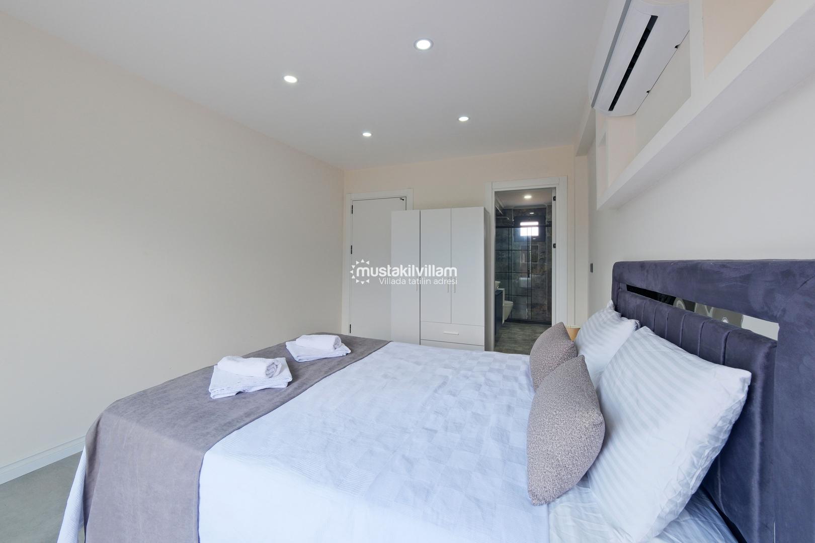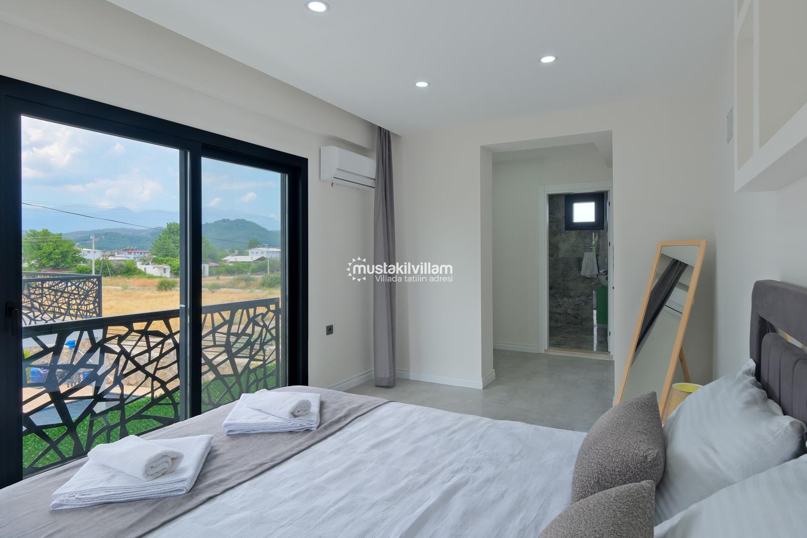 Toplam 3 yatak odası ve 3 banyosu bulunan villamızda, tüm yatak odaları ebeveyn banyolu ve balkonludur. Bu sayede misafirlerimize konforlu ve mahrem bir konaklama alanı sağlanmaktadır. Modern ve şık mobilyalarla dekore edilmiş salon bölümünde rahat bir oturma grubu, klima ve televizyon yer almaktadır. Tam donanımlı açık mutfakta buzdolabı, ankastre ocak ve fırın, bulaşık makinesi ve ihtiyaç duyabileceğiniz tüm mutfak ekipmanları bulunmaktadır.
