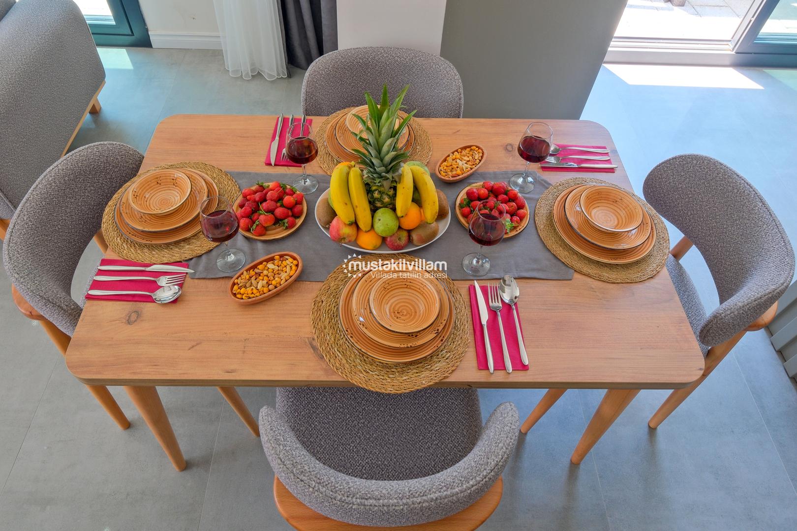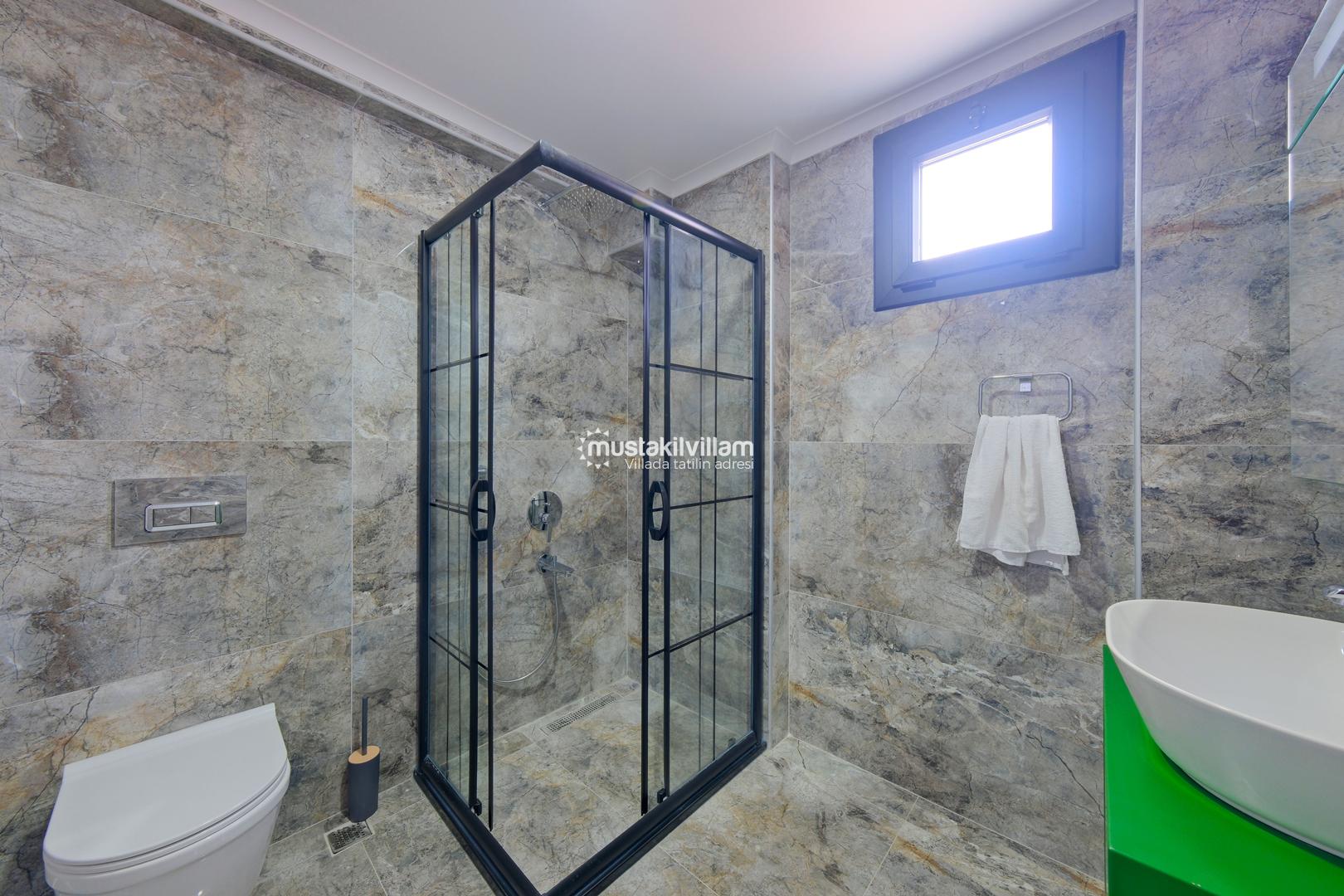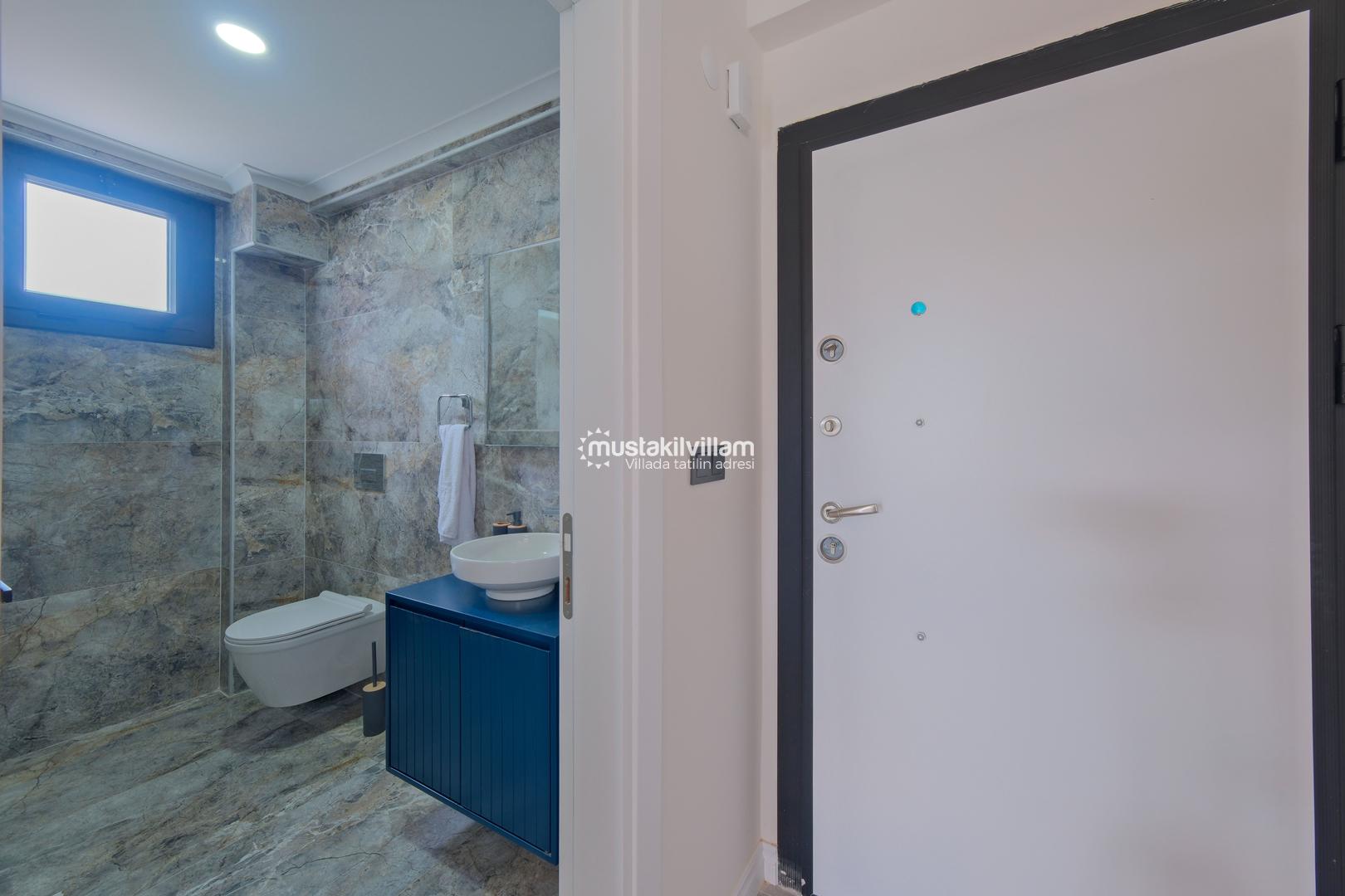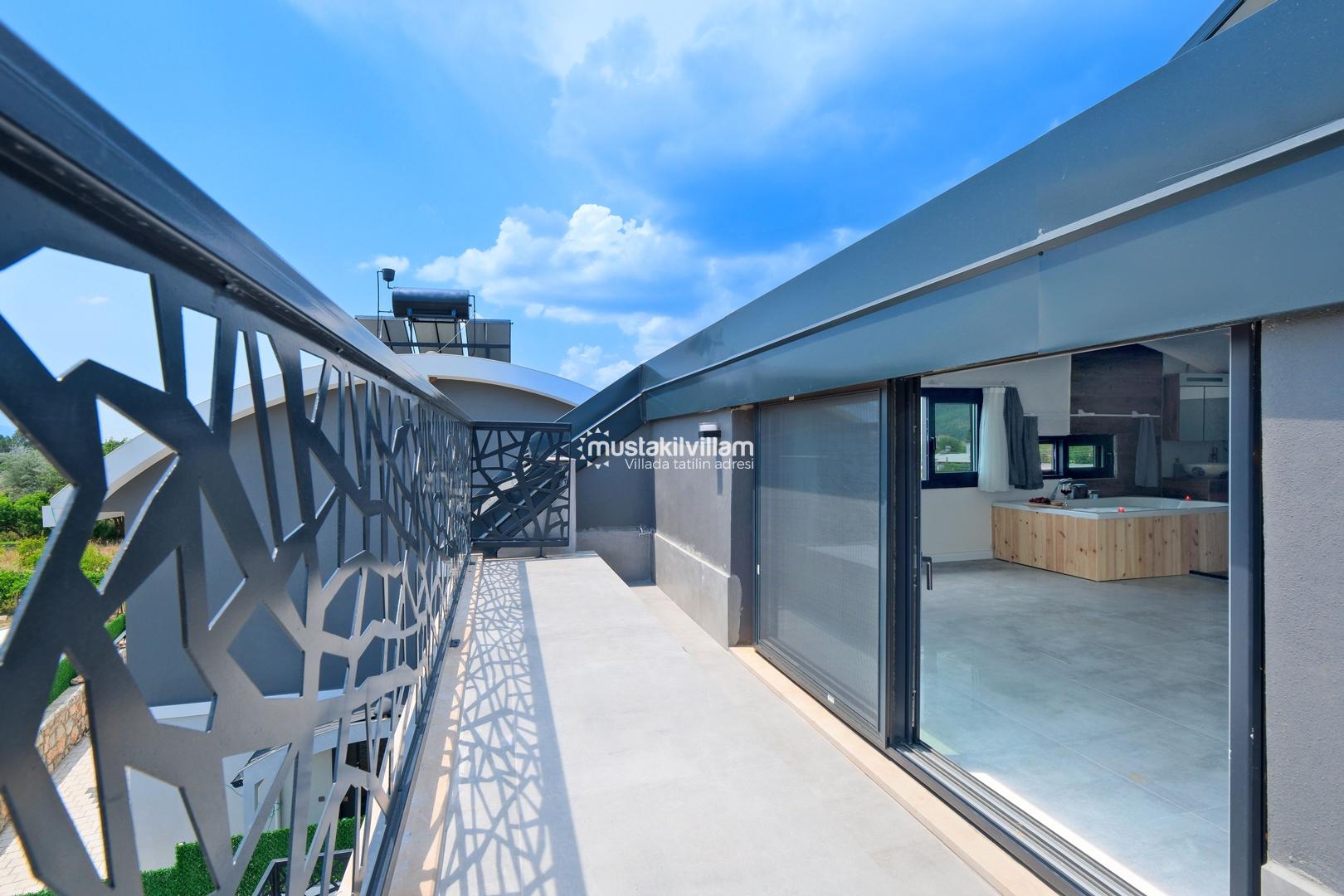 Toplam 3 yatak odası ve 3 banyosu bulunan villamızda, tüm yatak odaları ebeveyn banyolu ve balkonludur. Bu sayede misafirlerimize konforlu ve mahrem bir konaklama alanı sağlanmaktadır. Modern ve şık mobilyalarla dekore edilmiş salon bölümünde rahat bir oturma grubu, klima ve televizyon yer almaktadır. Tam donanımlı açık mutfakta buzdolabı, ankastre ocak ve fırın, bulaşık makinesi ve ihtiyaç duyabileceğiniz tüm mutfak ekipmanları bulunmaktadır.