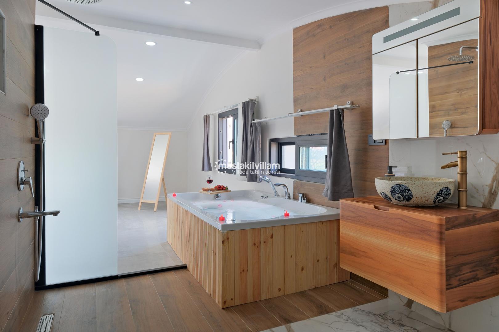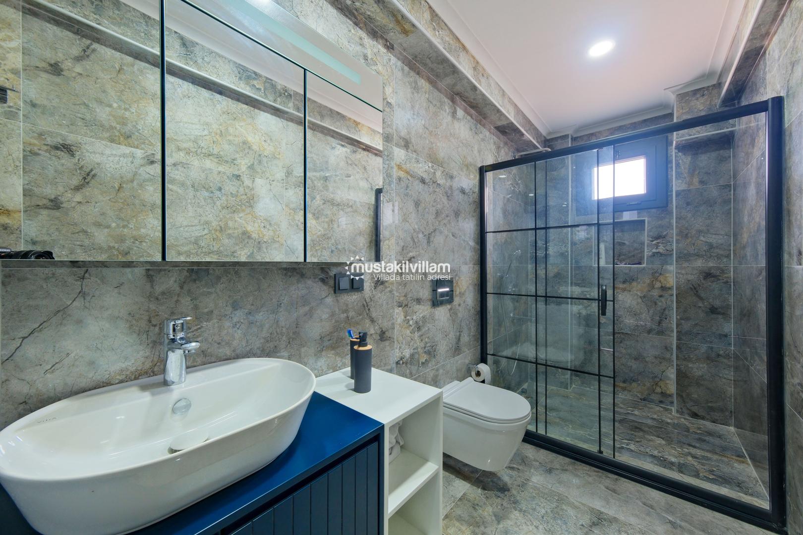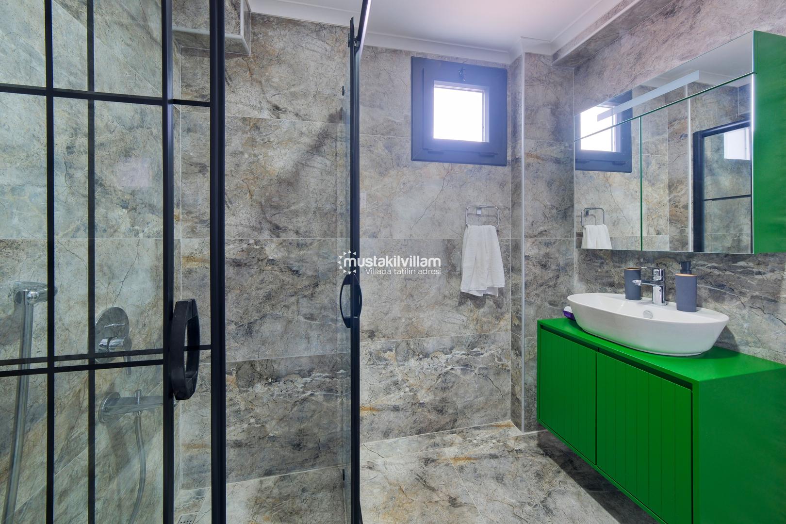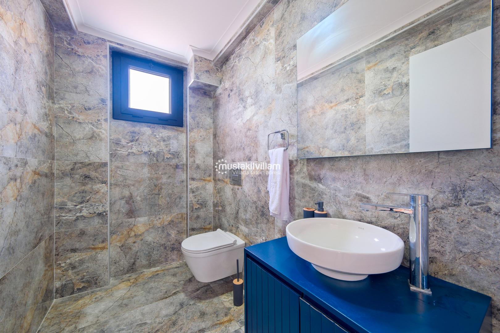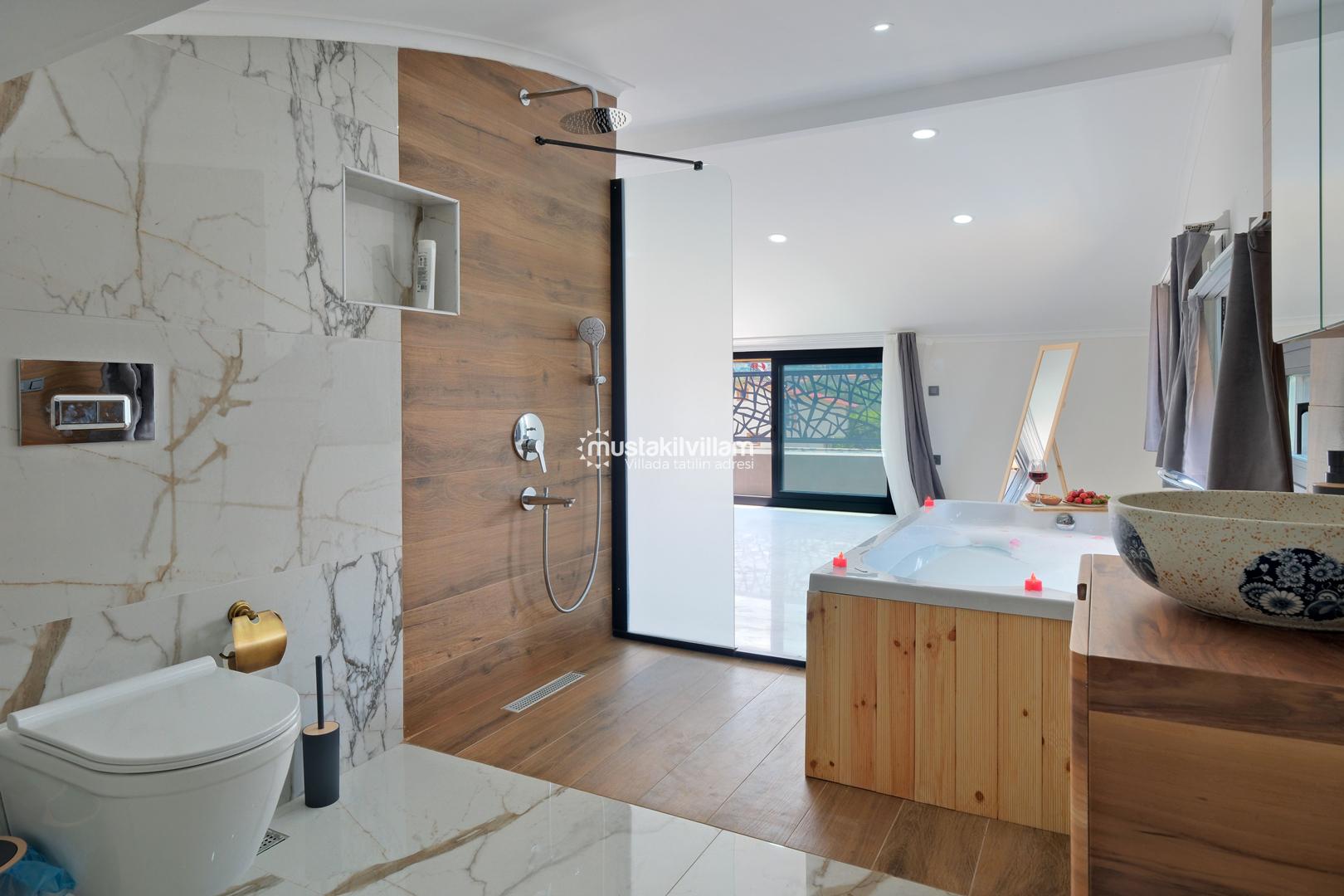 Toplam 3 yatak odası ve 3 banyosu bulunan villamızda, tüm yatak odaları ebeveyn banyolu ve balkonludur. Bu sayede misafirlerimize konforlu ve mahrem bir konaklama alanı sağlanmaktadır. Modern ve şık mobilyalarla dekore edilmiş salon bölümünde rahat bir oturma grubu, klima ve televizyon yer almaktadır. Tam donanımlı açık mutfakta buzdolabı, ankastre ocak ve fırın, bulaşık makinesi ve ihtiyaç duyabileceğiniz tüm mutfak ekipmanları bulunmaktadır.