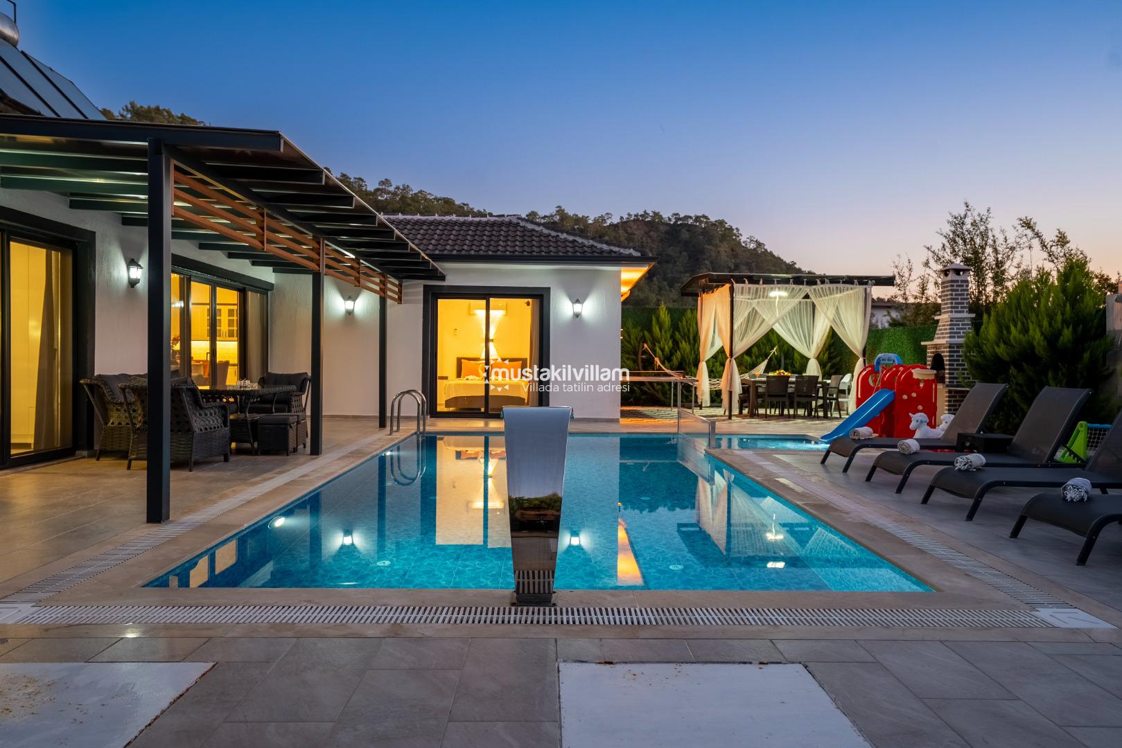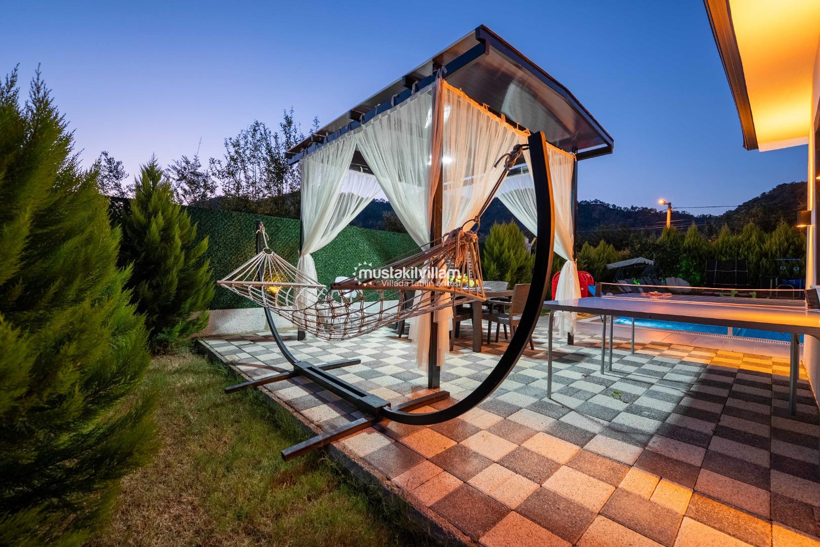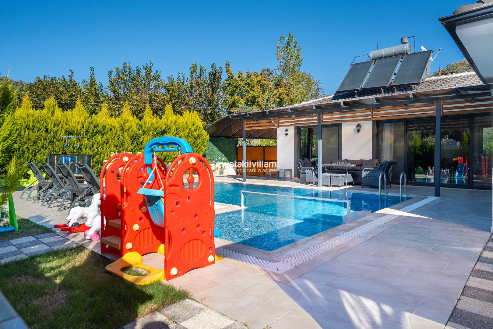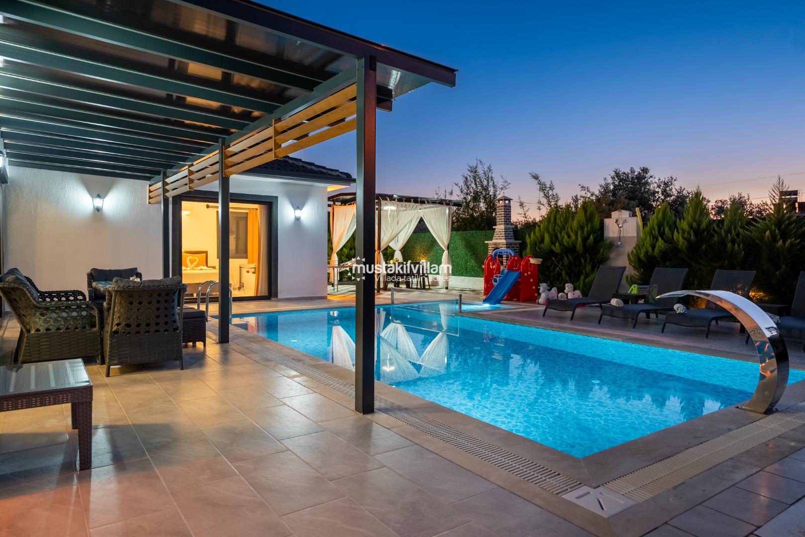 Villa Nazlıgül’ün en dikkat çekici özelliklerinden biri korunaklı özel havuz alanıdır. Bu alan, dışarıdan görünmeyecek şekilde tasarlanmış olup özellikle muhafazakar aileler ve balayı çiftleri için ideal bir ortam sunar.
