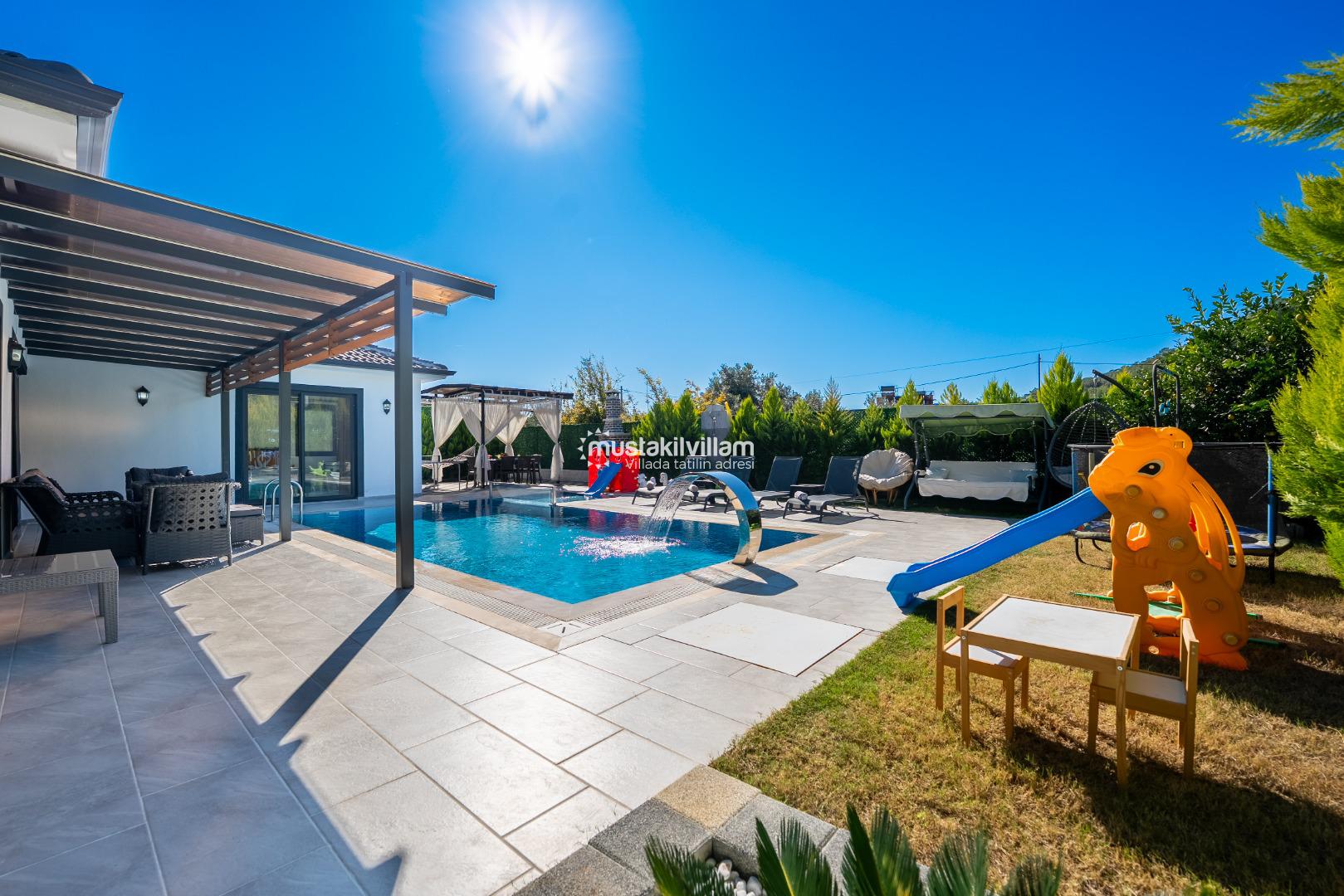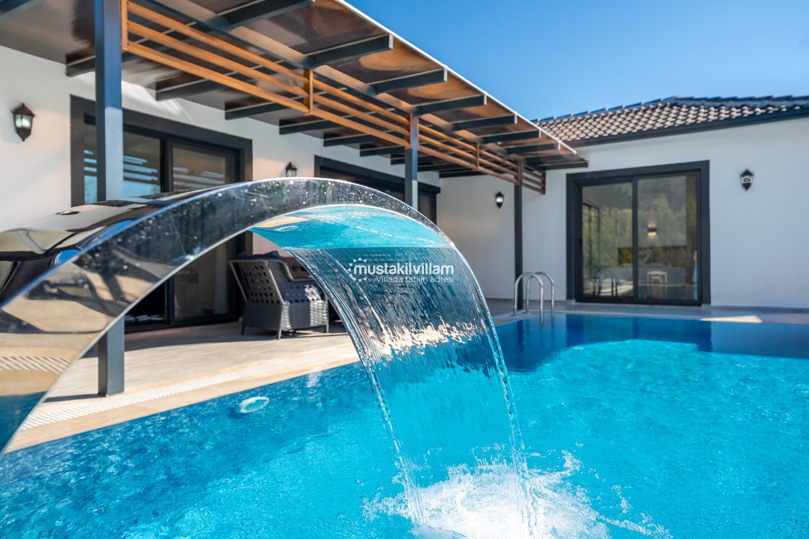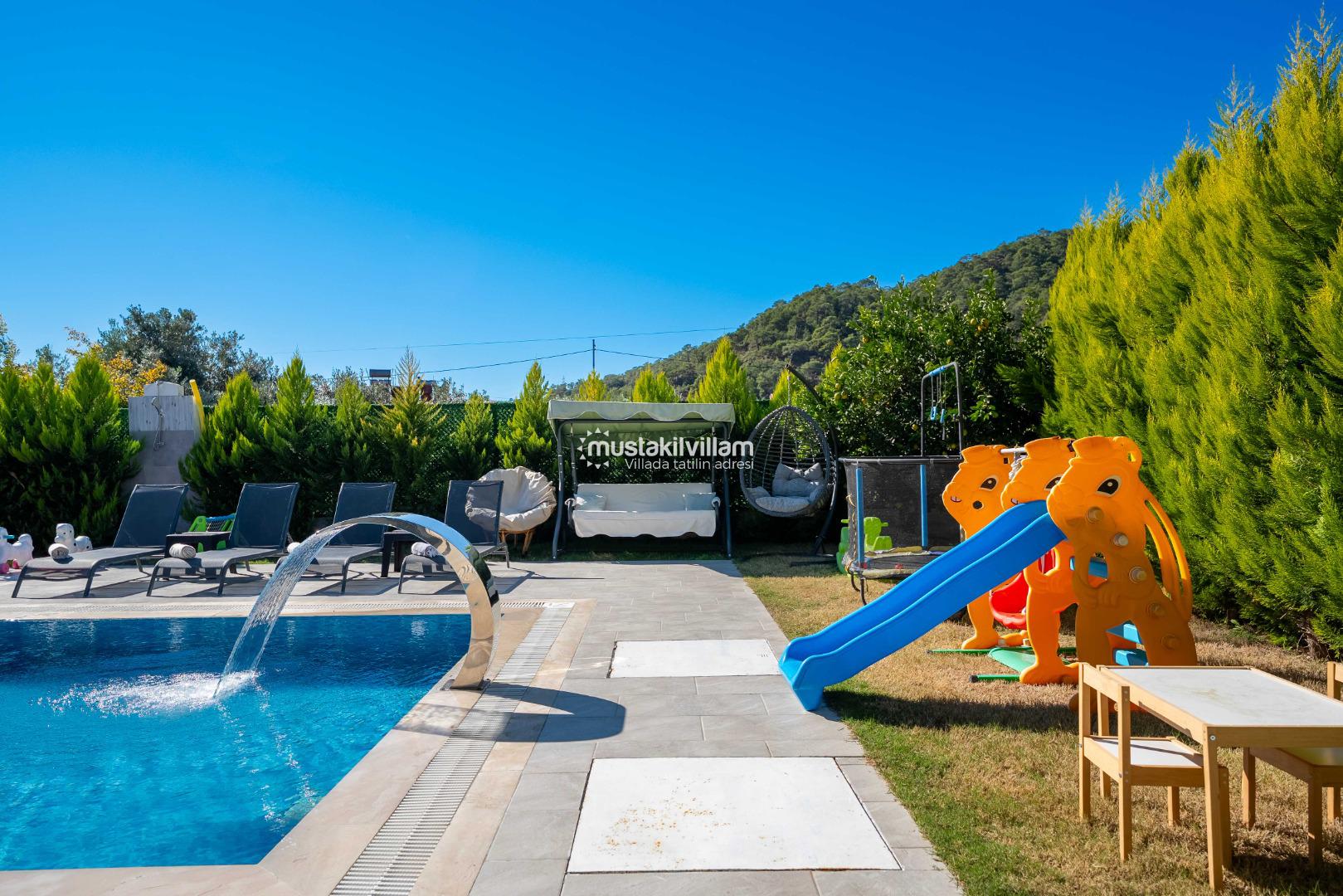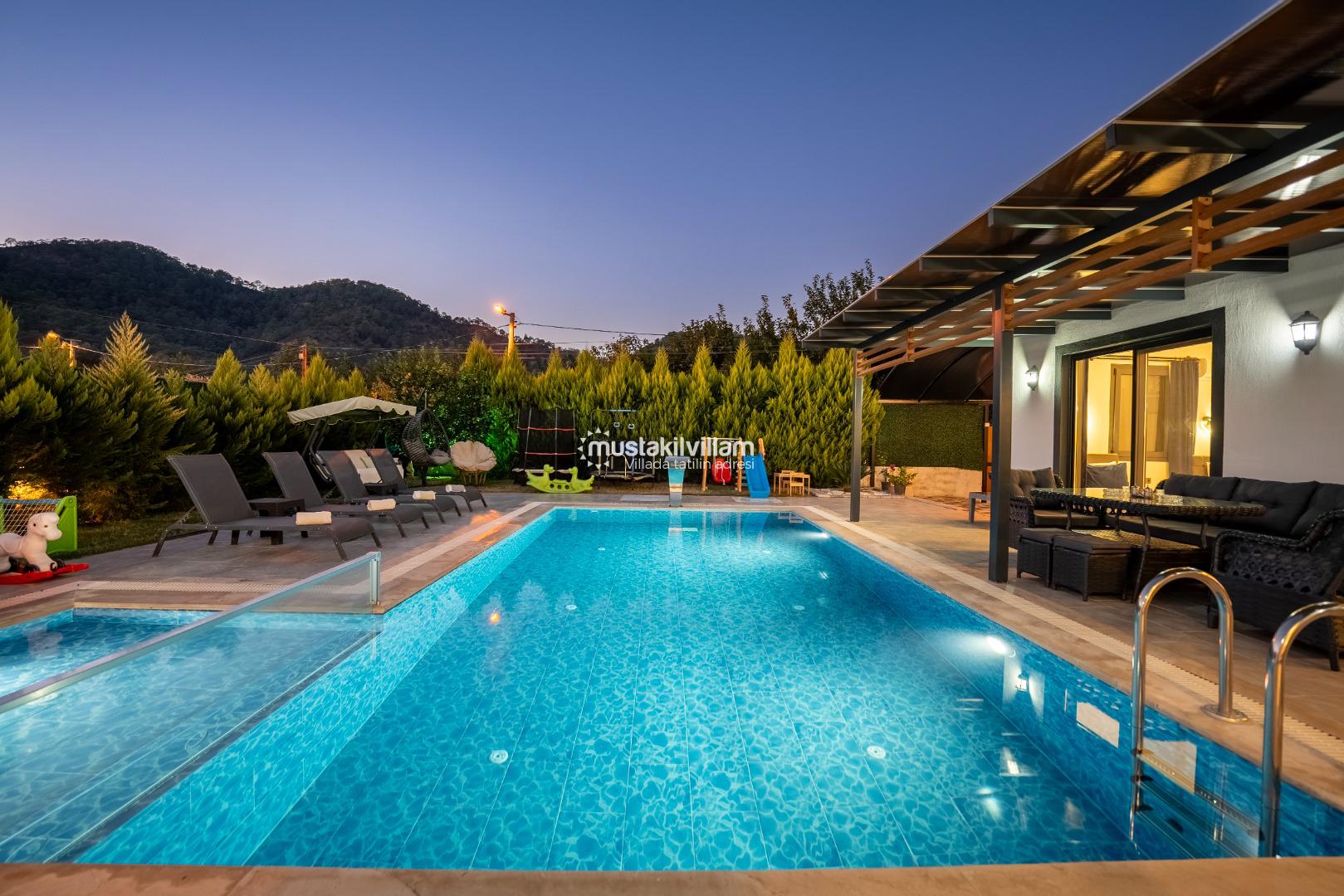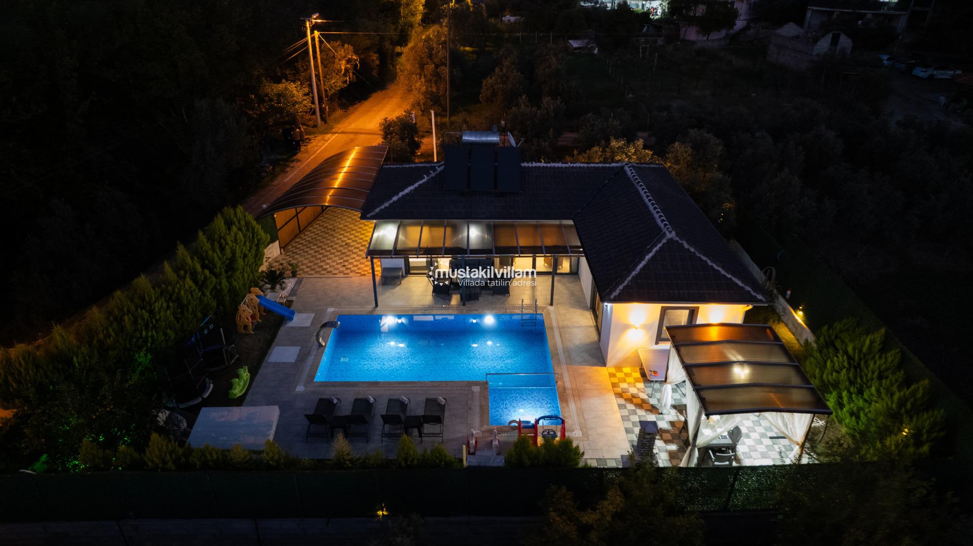Villa Nazlıgül’ün en dikkat çekici özelliklerinden biri korunaklı özel havuz alanıdır. Bu alan, dışarıdan görünmeyecek şekilde tasarlanmış olup özellikle muhafazakar aileler ve balayı çiftleri için ideal bir ortam sunar.