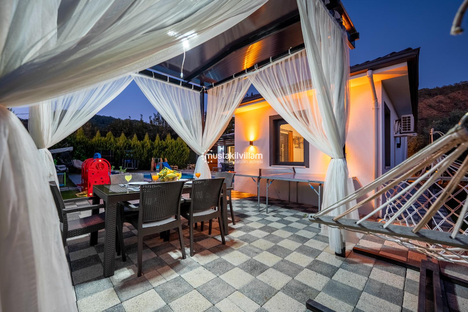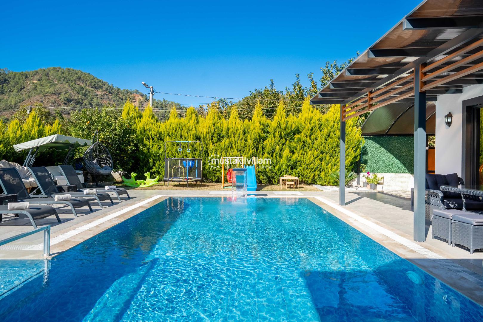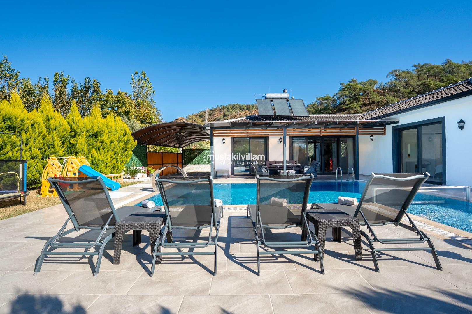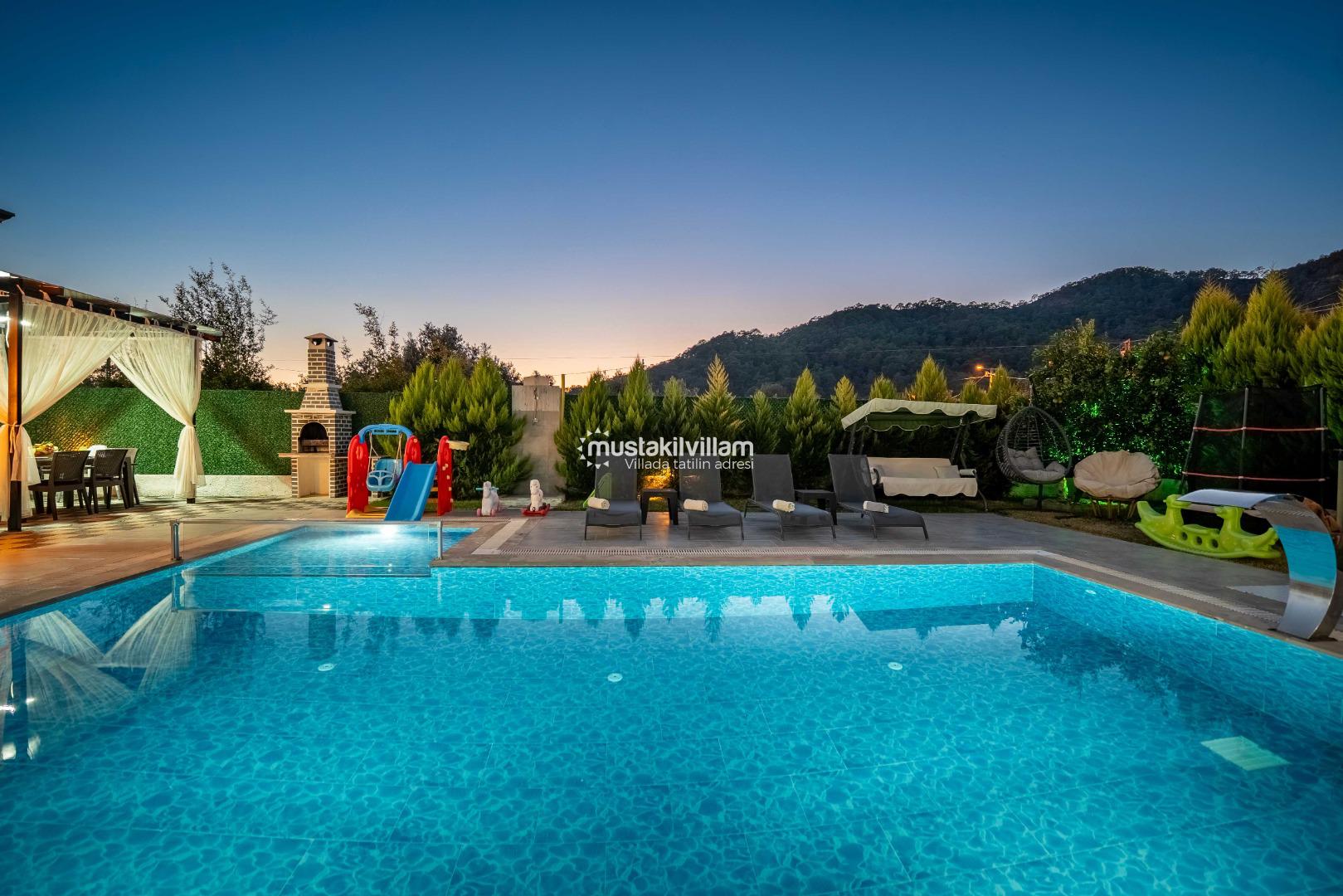 Villa Nazlıgül’ün en dikkat çekici özelliklerinden biri korunaklı özel havuz alanıdır. Bu alan, dışarıdan görünmeyecek şekilde tasarlanmış olup özellikle muhafazakar aileler ve balayı çiftleri için ideal bir ortam sunar.