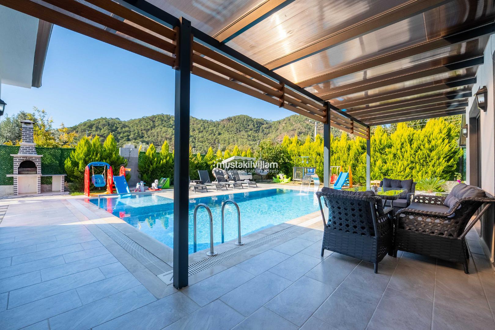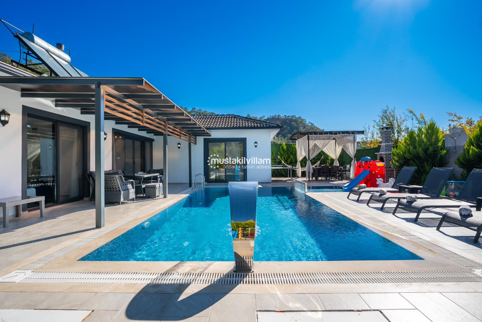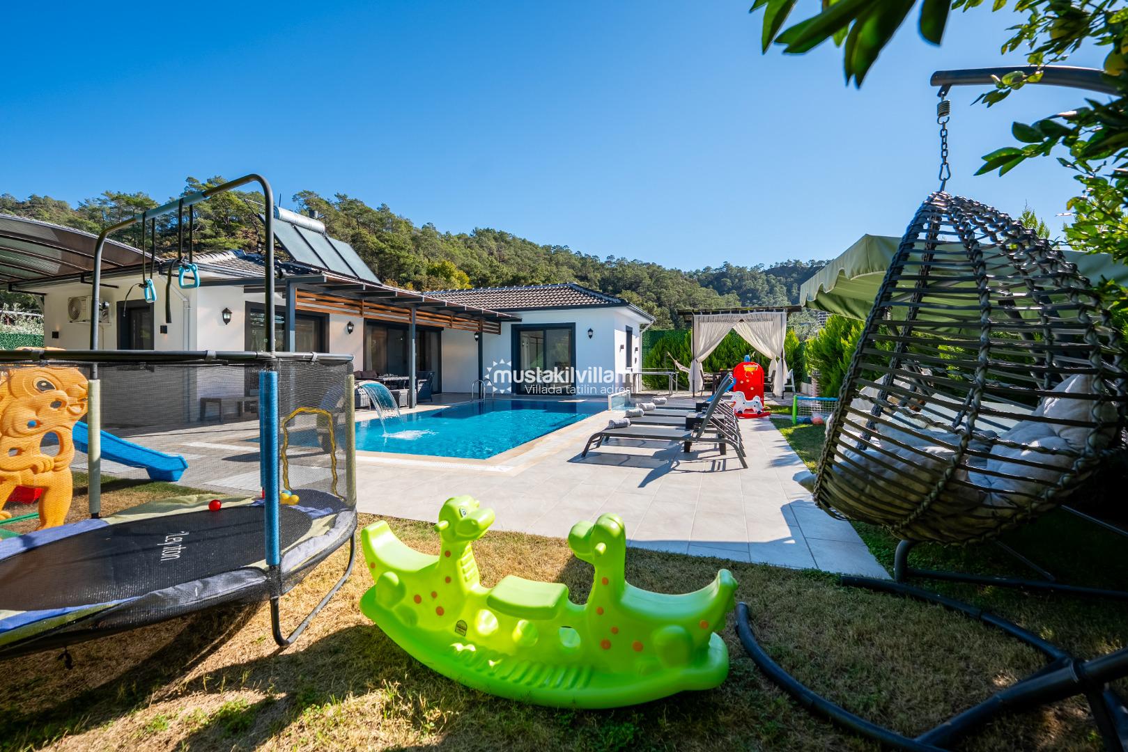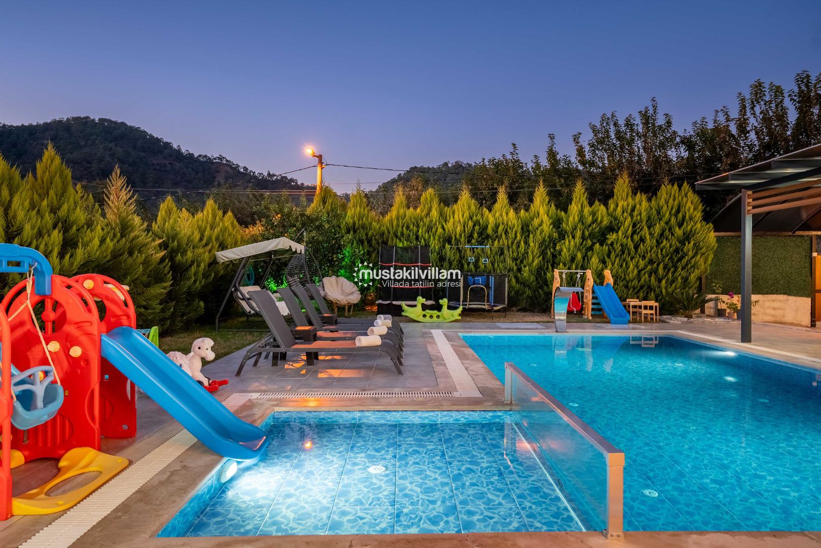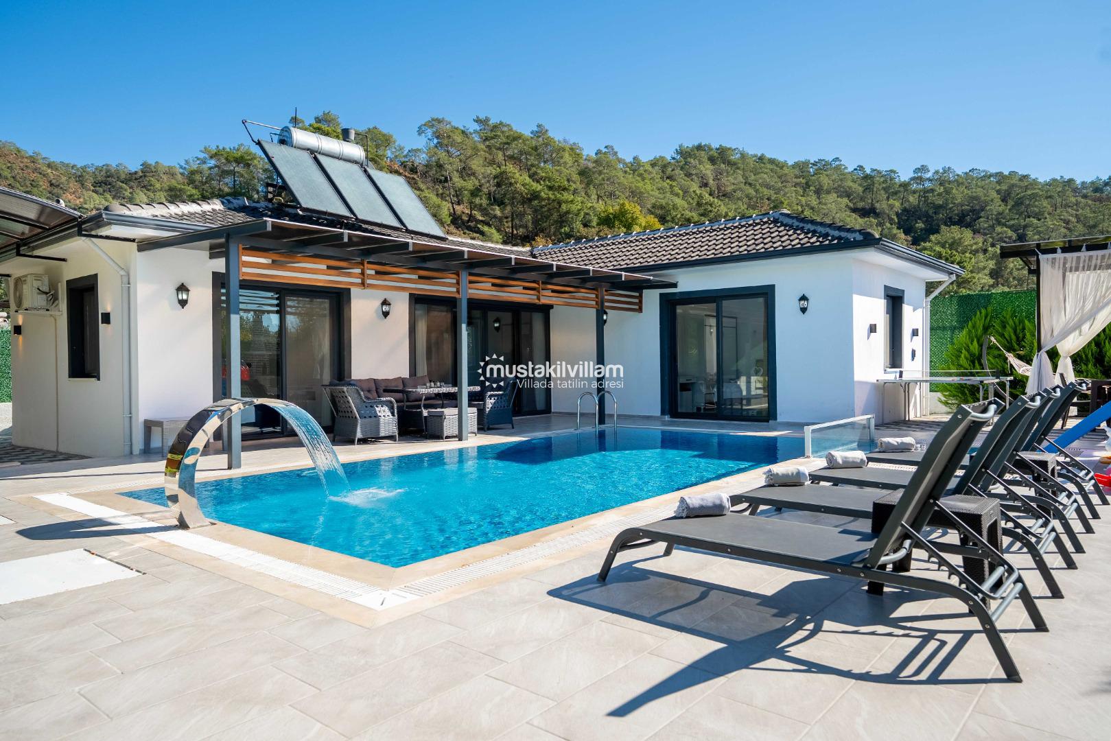 Villa Nazlıgül’ün en dikkat çekici özelliklerinden biri korunaklı özel havuz alanıdır. Bu alan, dışarıdan görünmeyecek şekilde tasarlanmış olup özellikle muhafazakar aileler ve balayı çiftleri için ideal bir ortam sunar.