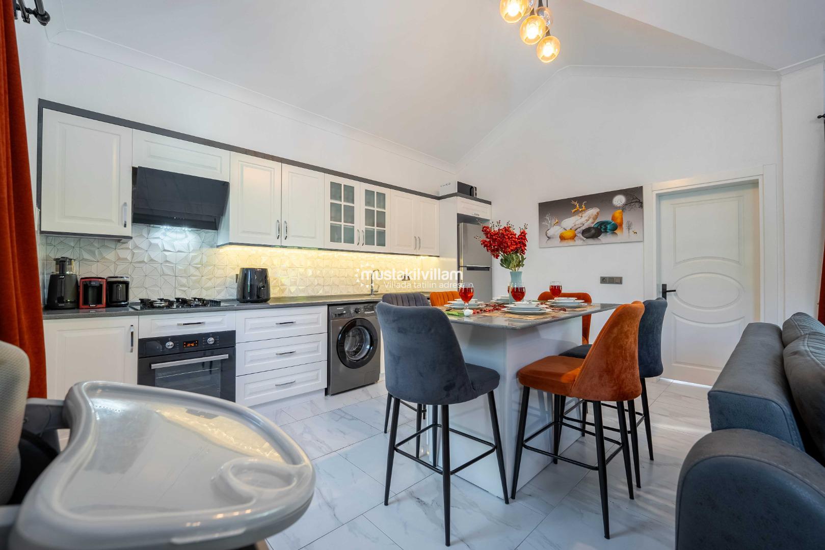 Açık plan Amerikan mutfak, ihtiyacınız olan tüm ekipmanlarla donatılmıştır. Yemek hazırlarken aynı zamanda sevdiklerinizle vakit geçirebilir, tatilinizi daha keyifli hale getirebilirsiniz.