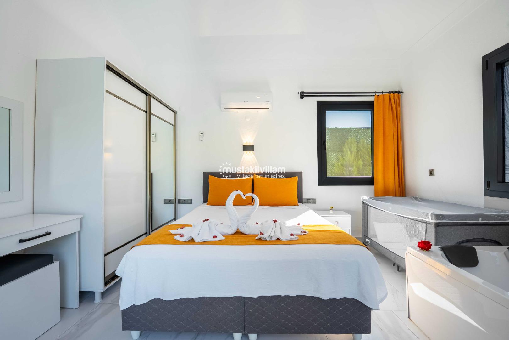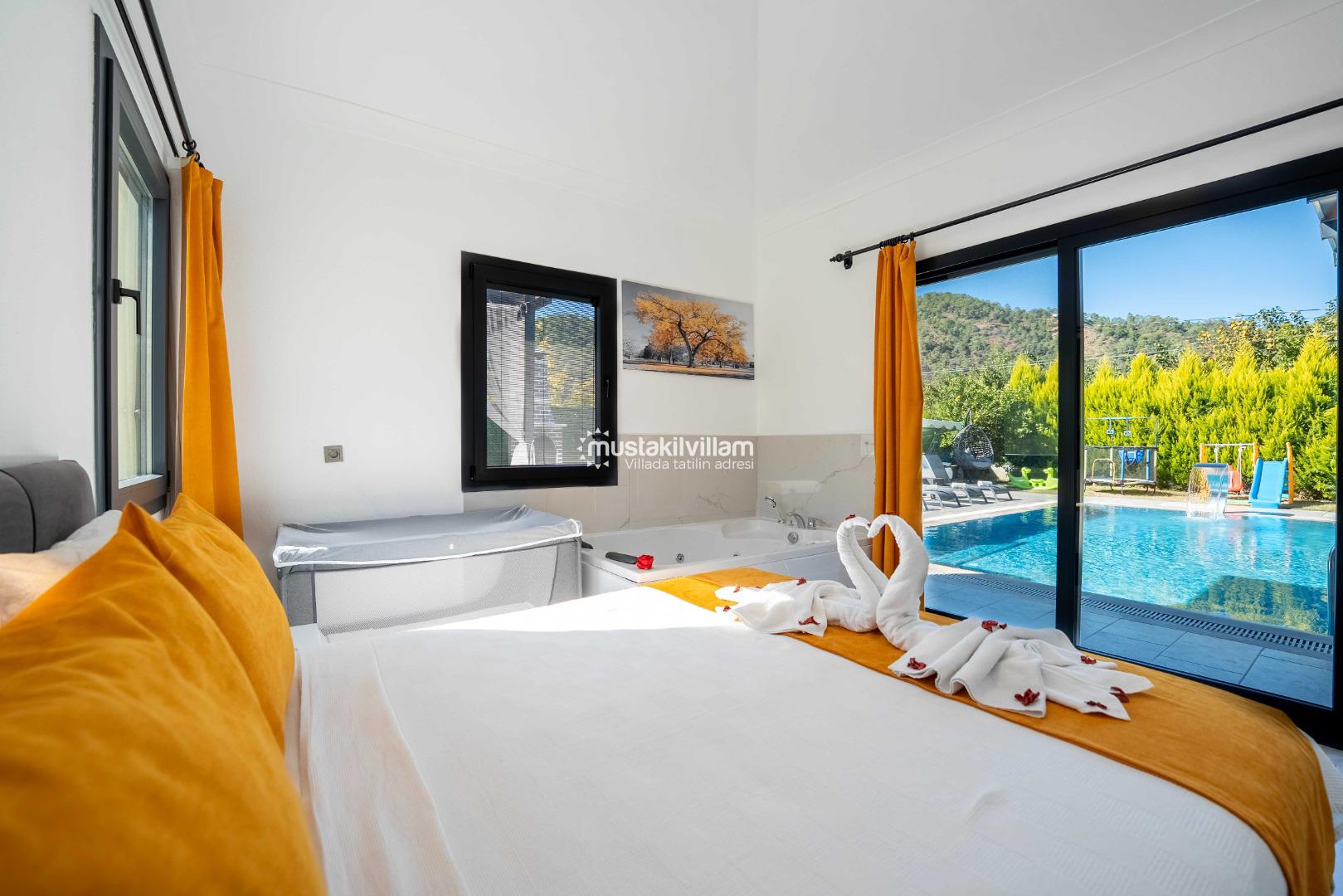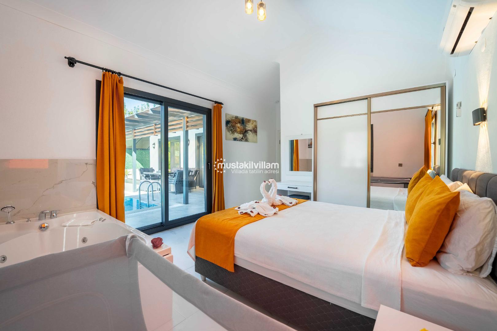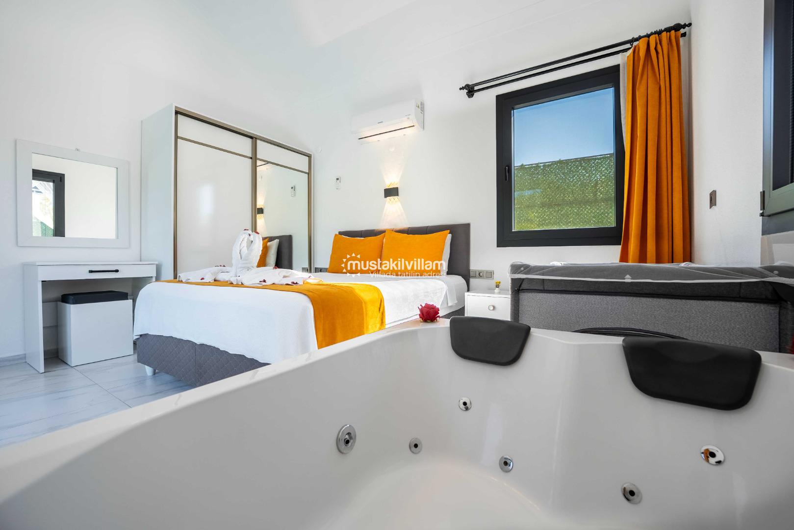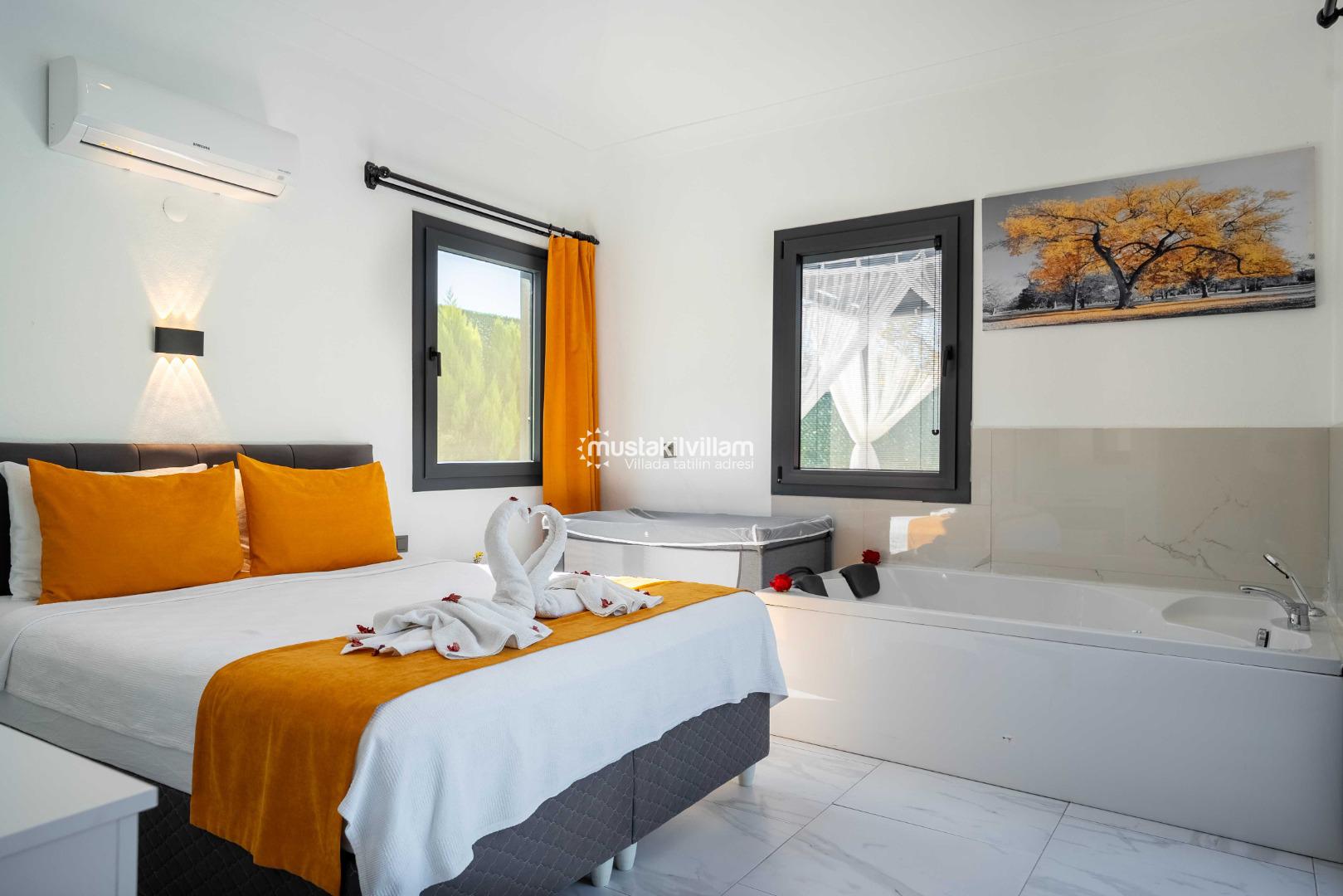 - 1. Yatak Odası: Çift kişilik yatak, jakuzi, özel banyo ve konforlu tasarım