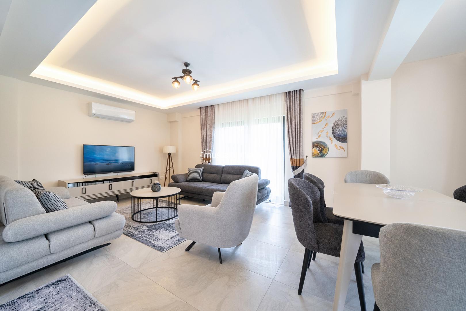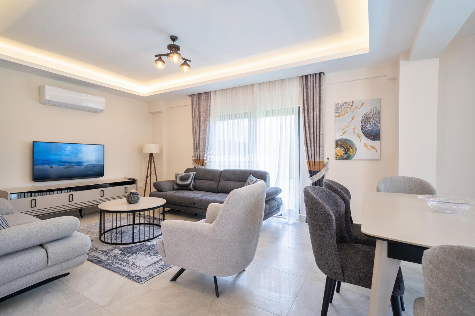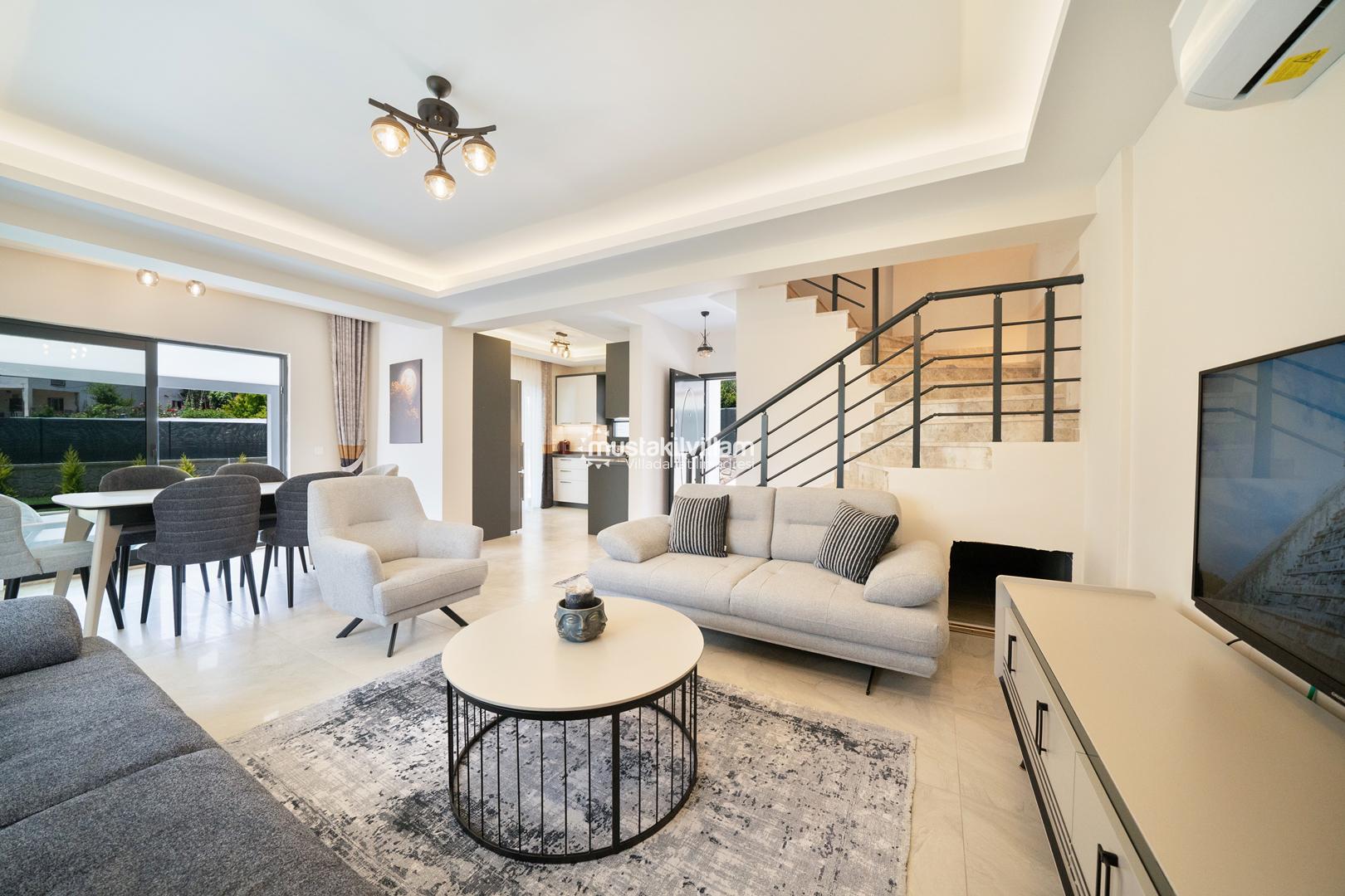 Villa içerisinde açık plan mutfak ve salon alanı bulunmaktadır. Modern mobilyalarla dekore edilen salon bölümü, doğrudan havuz terasına çıkış imkânı sunar ve gün boyu doğal ışık alır. Bu alan hem dinlenmek hem de birlikte vakit geçirmek için konforlu bir yaşam alanı oluşturur.