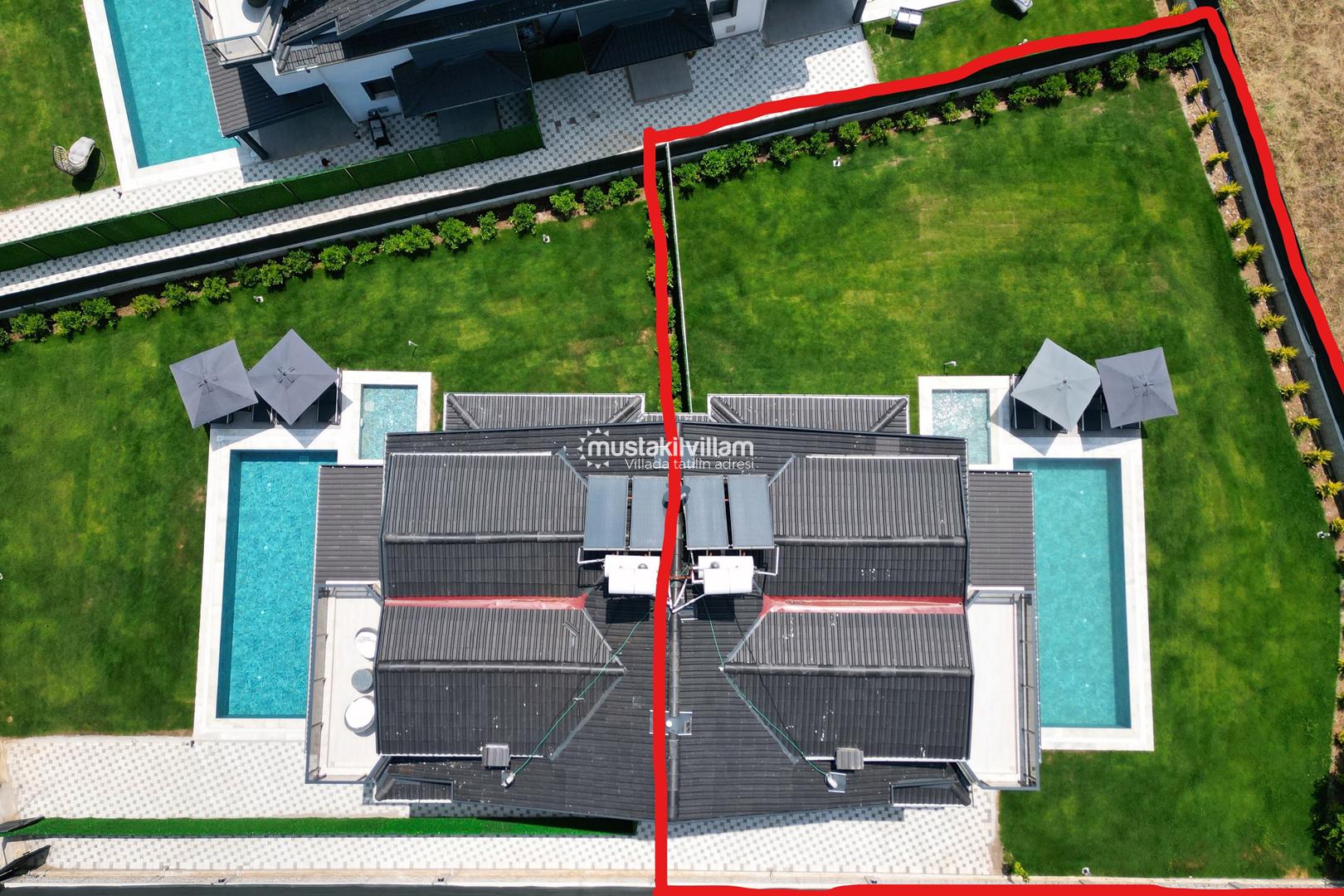 Villanın dış mekânında yaklaşık 8,5 x 3,5 metre ölçülerinde özel yüzme havuzu yer almaktadır. Havuz çevresi şezlonglar ve güneşlenme alanları ile donatılmıştır.