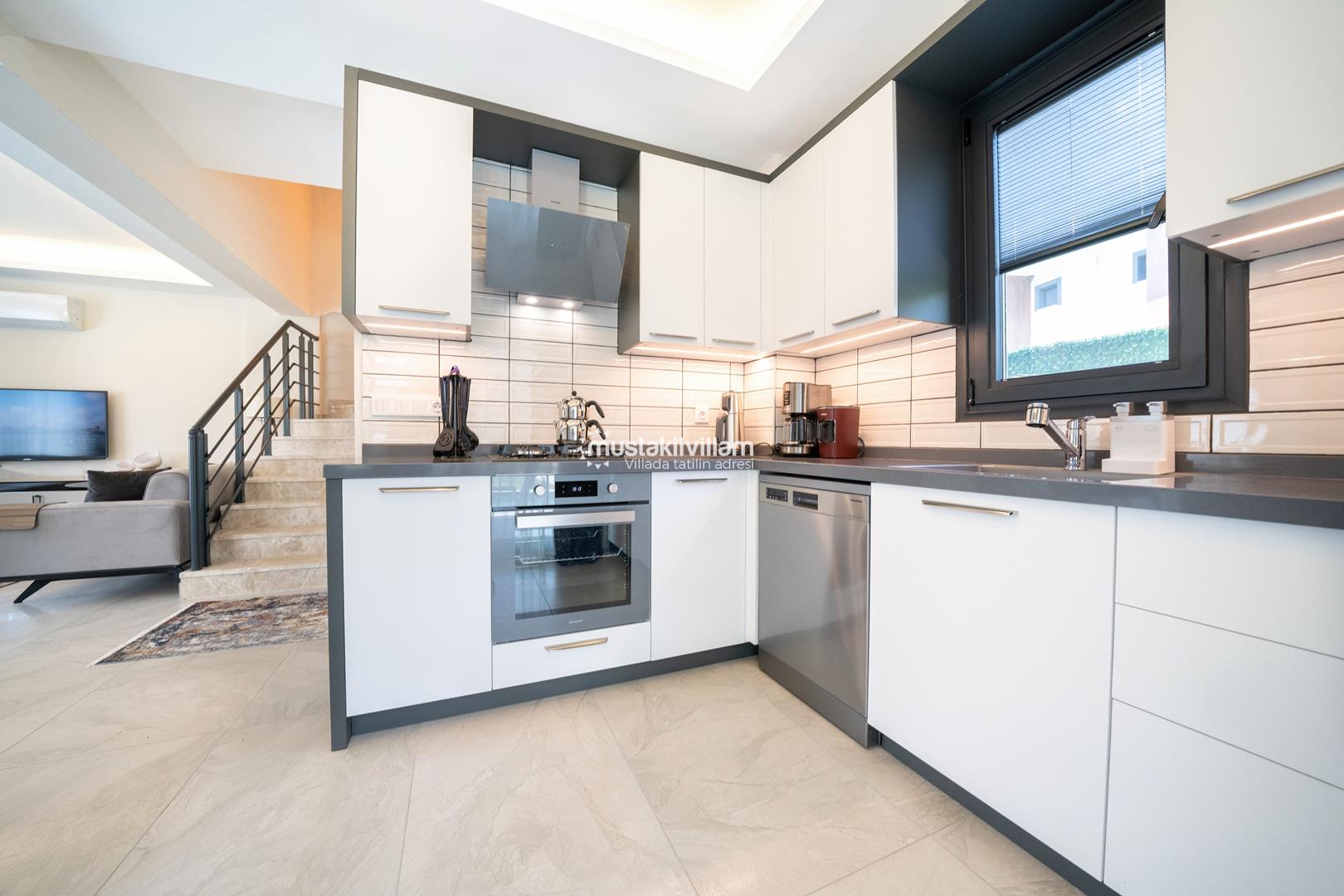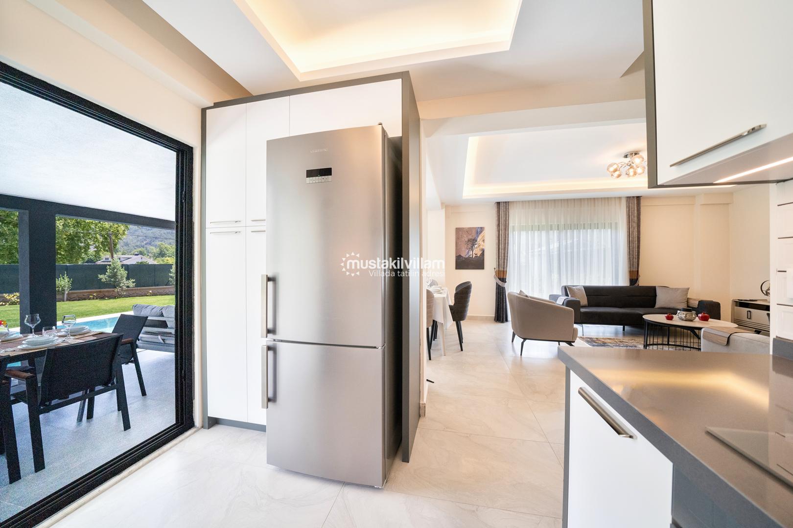 Villa içerisinde açık plan mutfak ve salon alanı bulunmaktadır. Modern mobilyalarla dekore edilen salon bölümü, doğrudan havuz terasına çıkış imkânı sunar ve gün boyu doğal ışık alır. Bu alan hem dinlenmek hem de birlikte vakit geçirmek için konforlu bir yaşam alanı oluşturur.