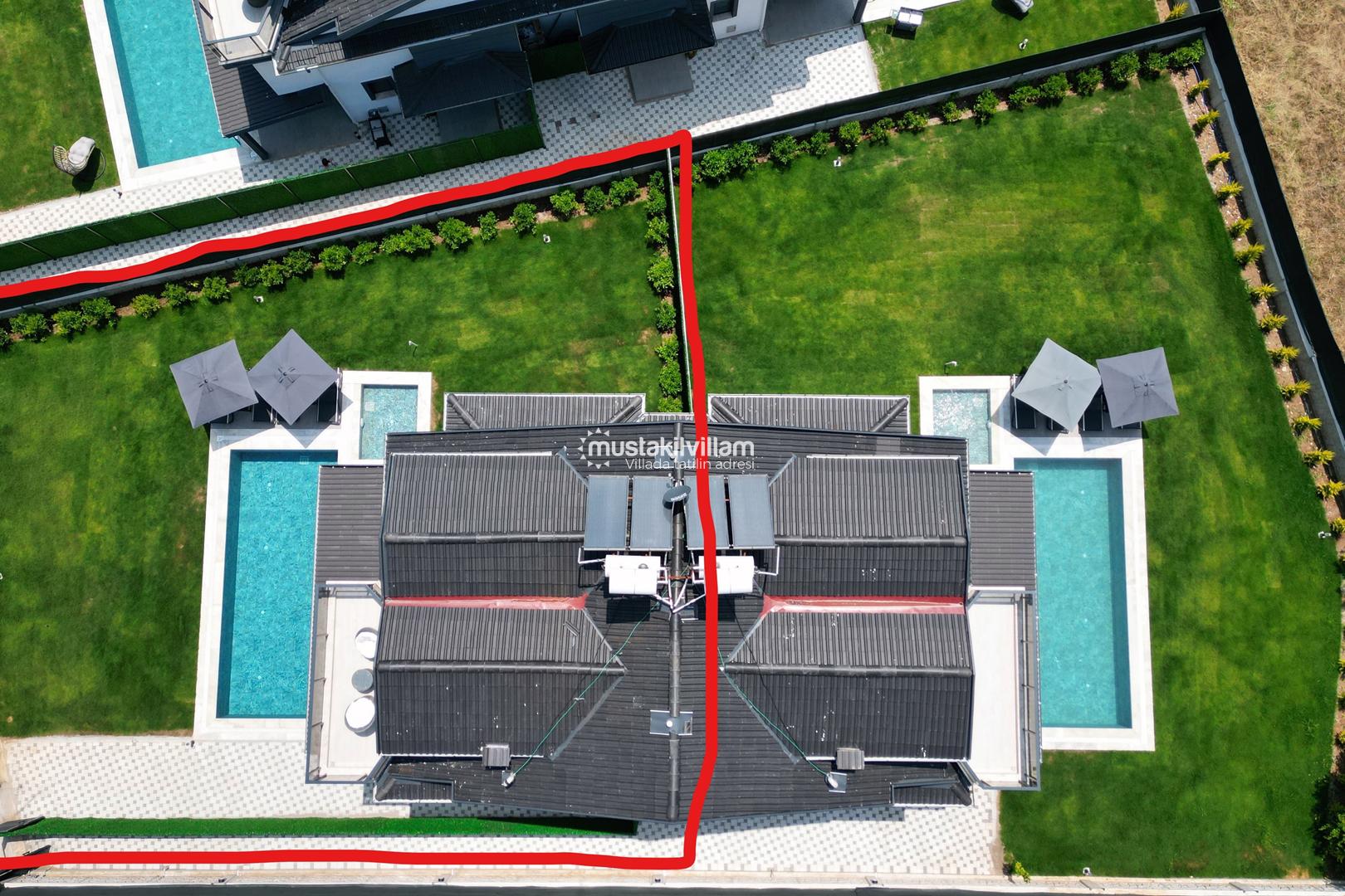 Villanın dış mekânında yaklaşık 8,5 x 3,5 metre ölçülerinde özel yüzme havuzu yer almaktadır. Havuz çevresi şezlonglar ve güneşlenme alanları ile donatılmıştır.