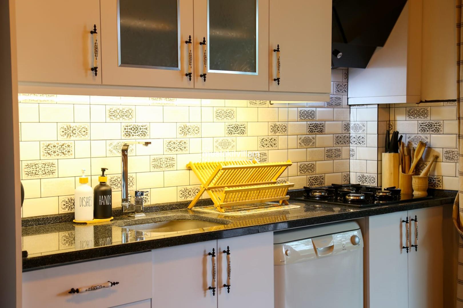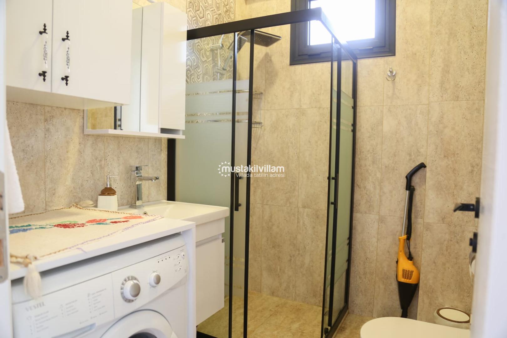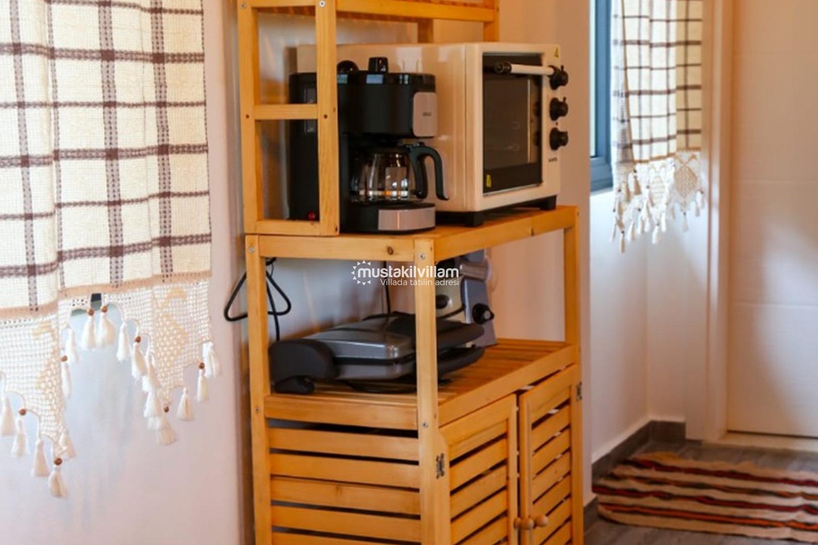 Salon bölümünde konforlu oturma grubu, klima ve televizyon gibi günlük yaşam konforunu sağlayan detaylar bulunur. Açık plan Amerikan mutfak ise tatil süresince ihtiyaç duyabileceğiniz tüm mutfak ekipmanları ile donatılmıştır.