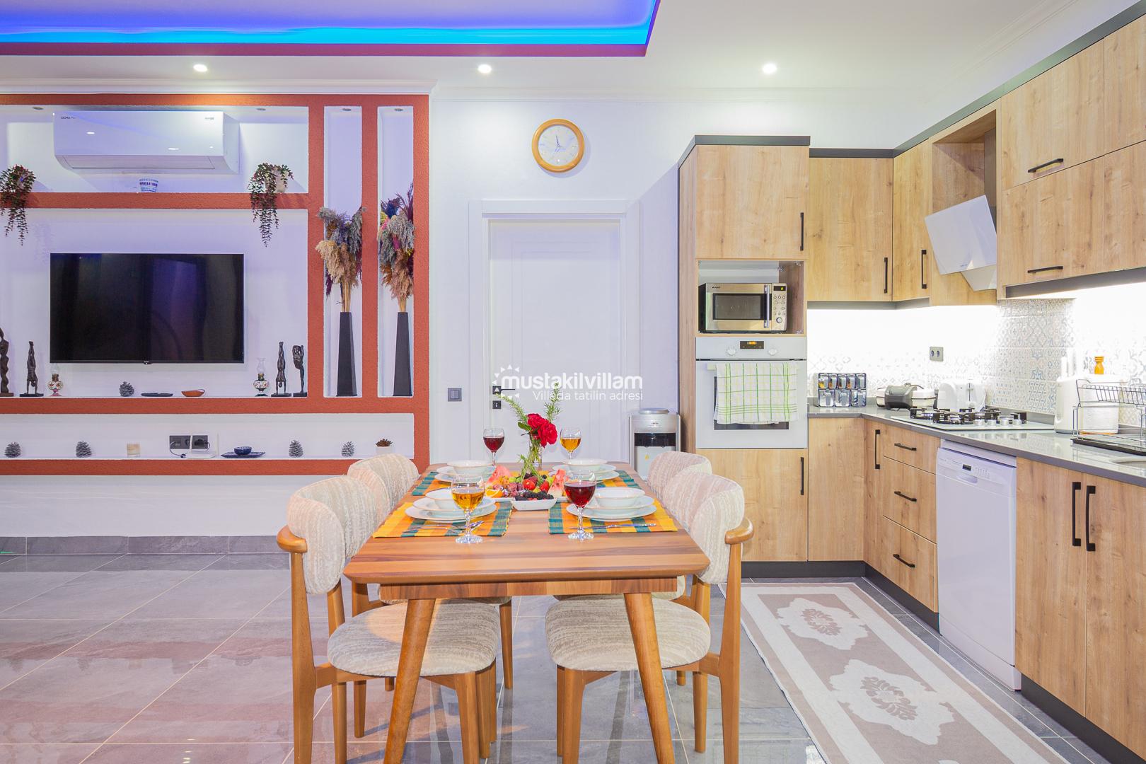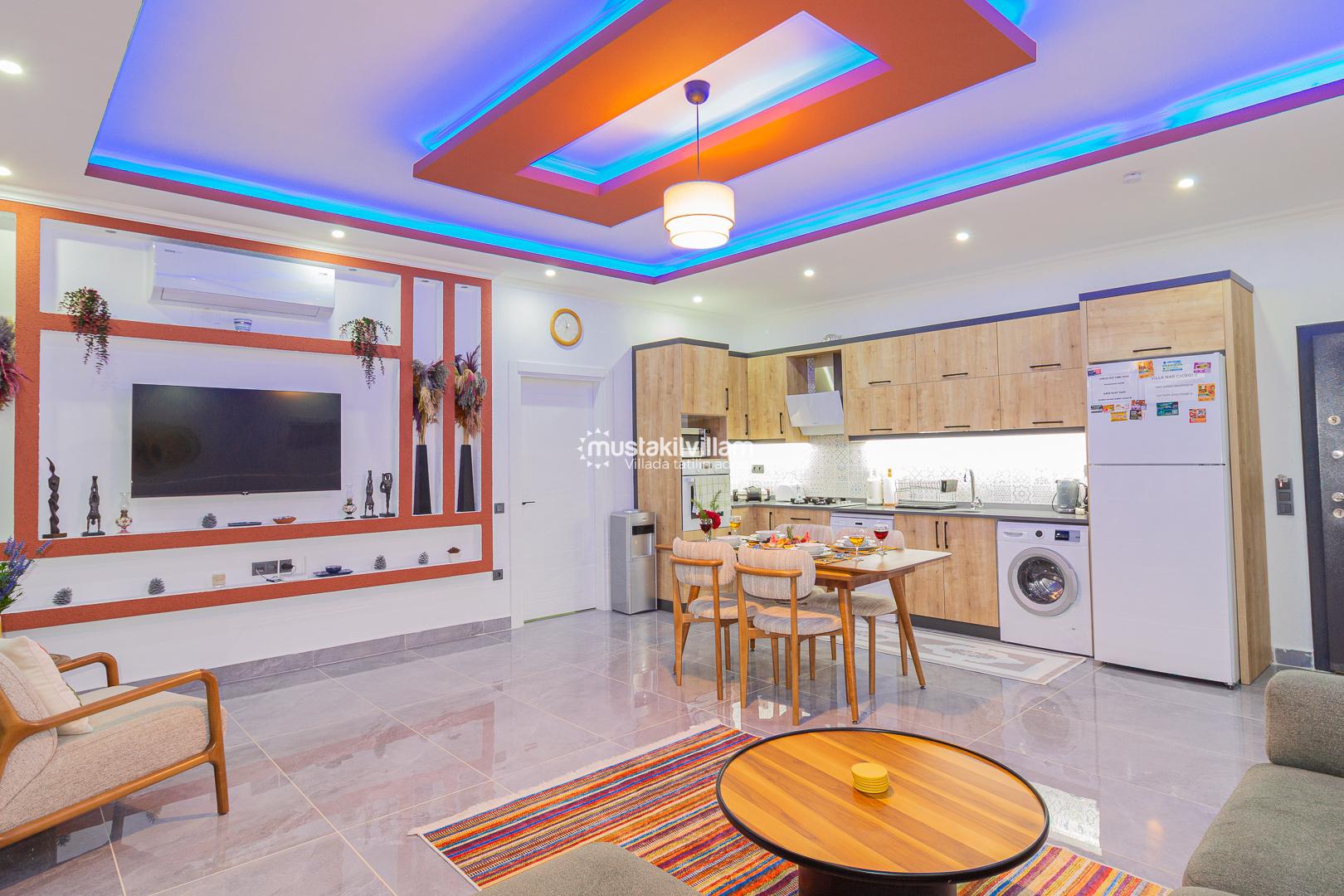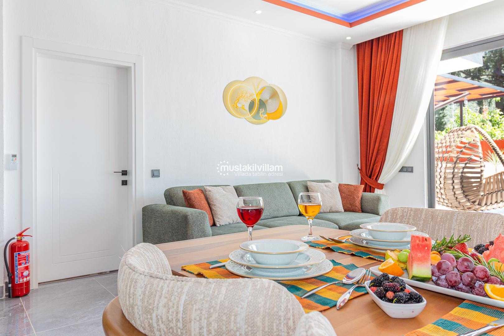 Modern ve zevkli dekorasyona sahip iç mekanları, ferah yaşam alanları ve konforlu mobilyalarıyla evinizin rahatlığını tatilde de yaşamanızı sağlar.