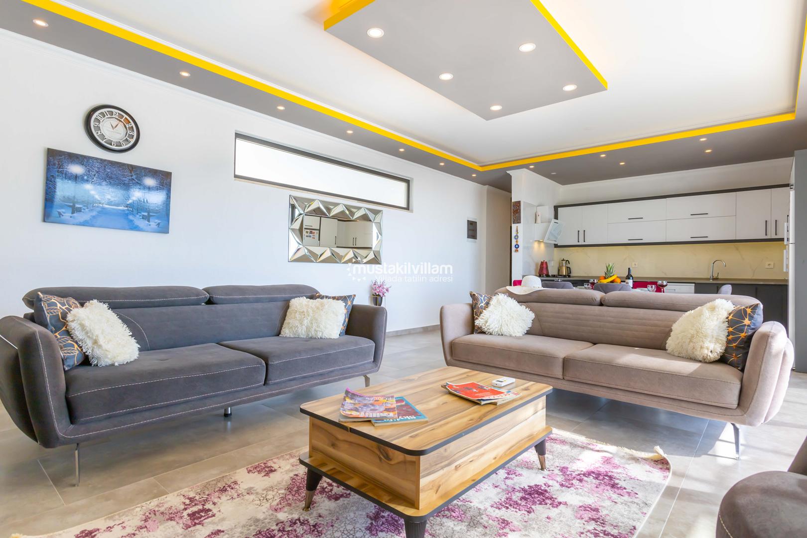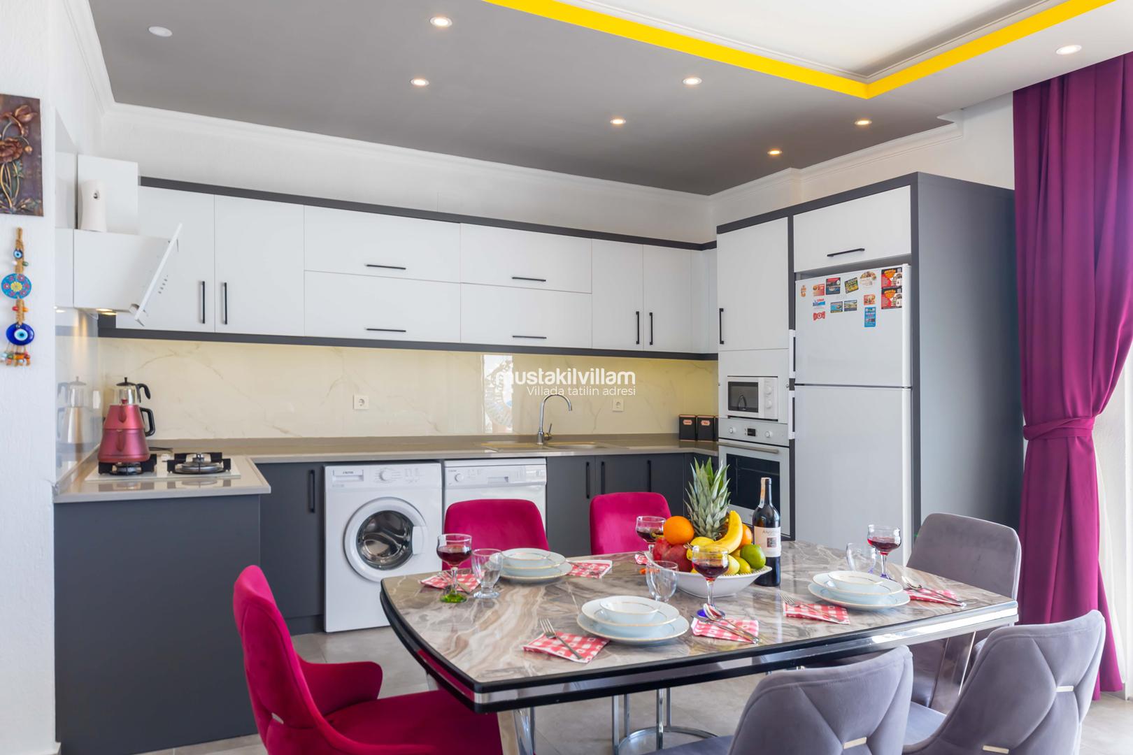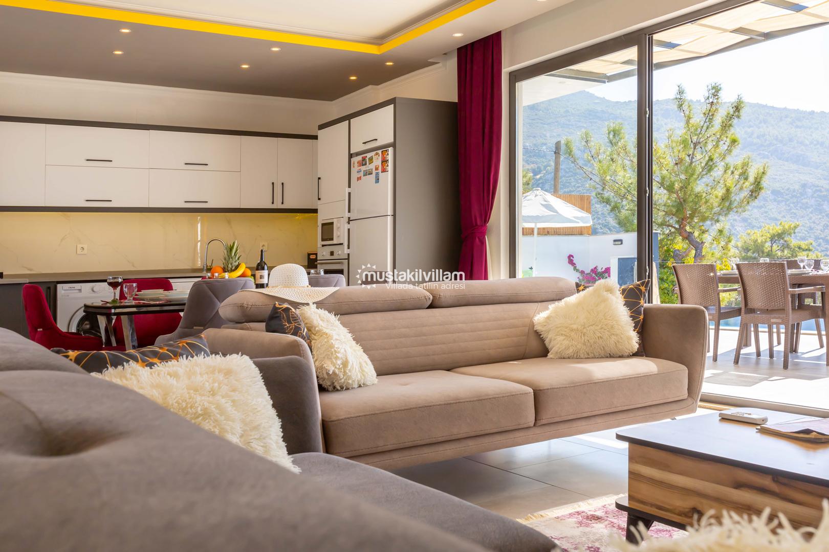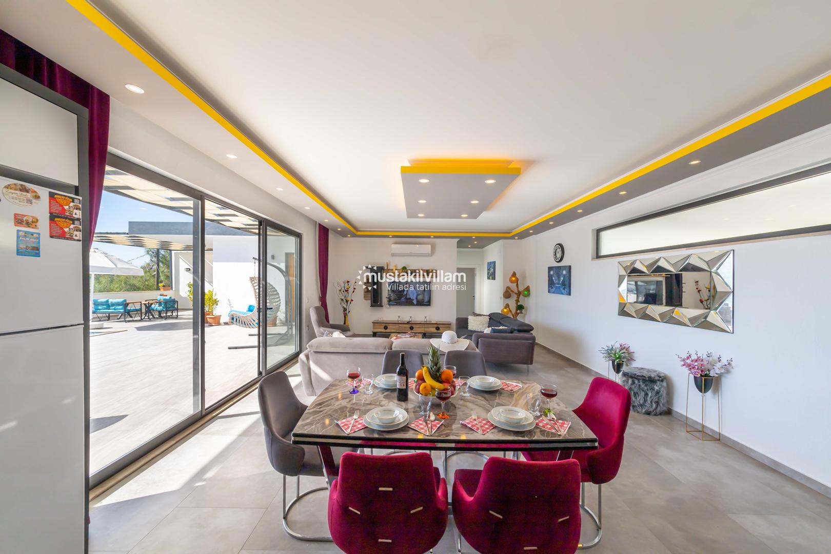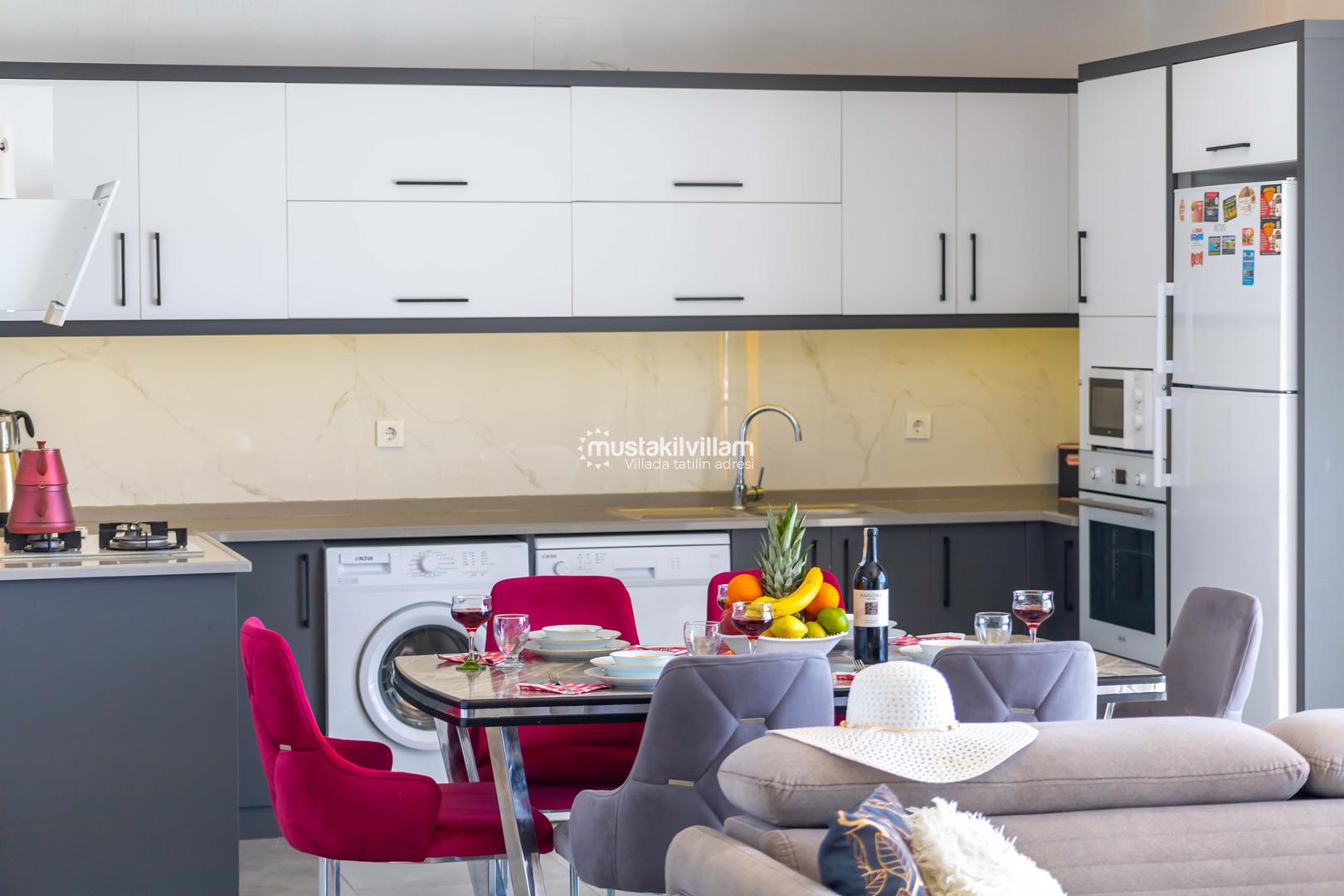Ferah ve modern tasarıma sahip açık plan salon–mutfak alanında konforlu oturma grubu, klima, televizyon ve havuz terasına doğrudan çıkış bulunmaktadır.Tam donanımlı Amerikan mutfakta buzdolabı, ankastre fırın, mikrodalga ve ihtiyaç duyabileceğiniz temel mutfak ekipmanları yer alır. Tatiliniz boyunca ev konforunu aratmayacak şekilde hazırlanmıştır