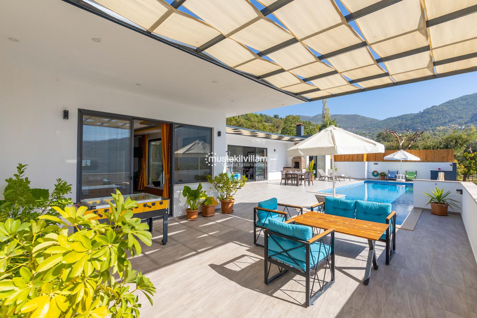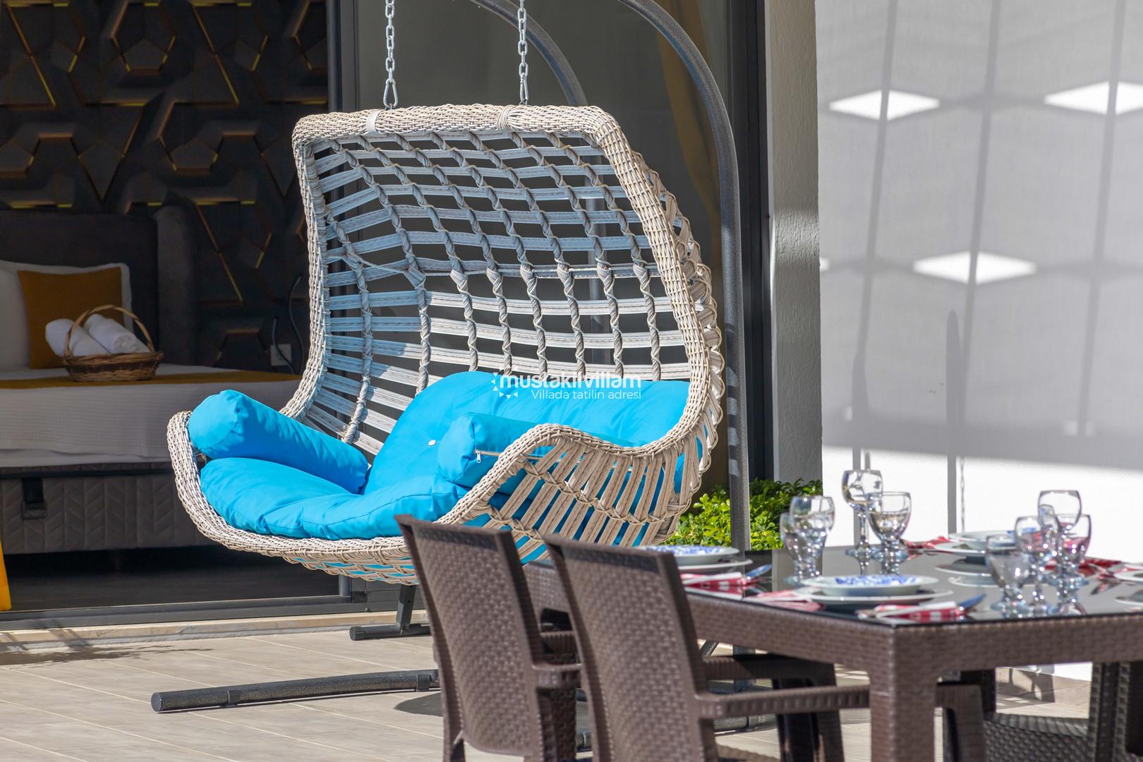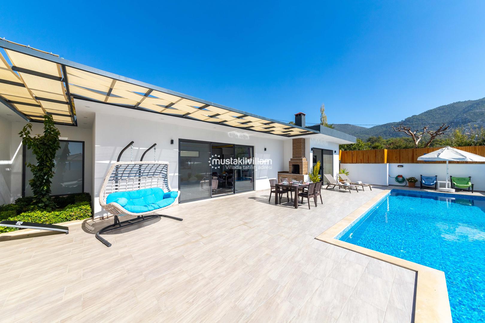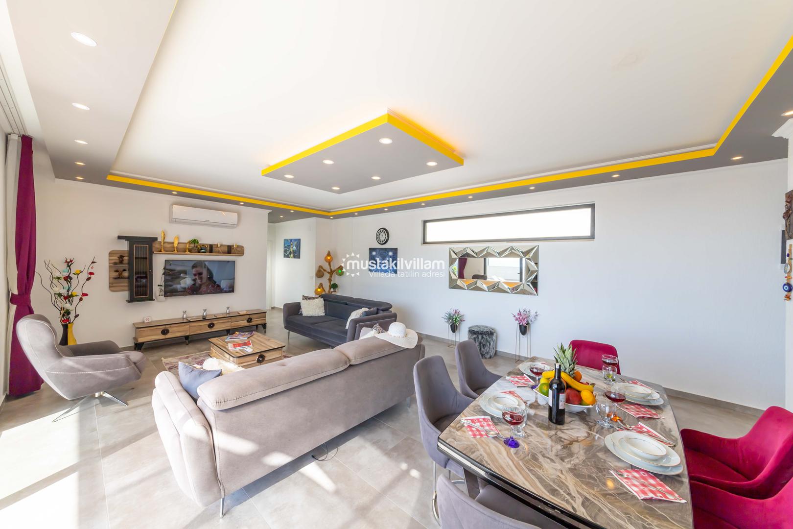 Ferah ve modern tasarıma sahip açık plan salon–mutfak alanında konforlu oturma grubu, klima, televizyon ve havuz terasına doğrudan çıkış bulunmaktadır.Tam donanımlı Amerikan mutfakta buzdolabı, ankastre fırın, mikrodalga ve ihtiyaç duyabileceğiniz temel mutfak ekipmanları yer alır. Tatiliniz boyunca ev konforunu aratmayacak şekilde hazırlanmıştır