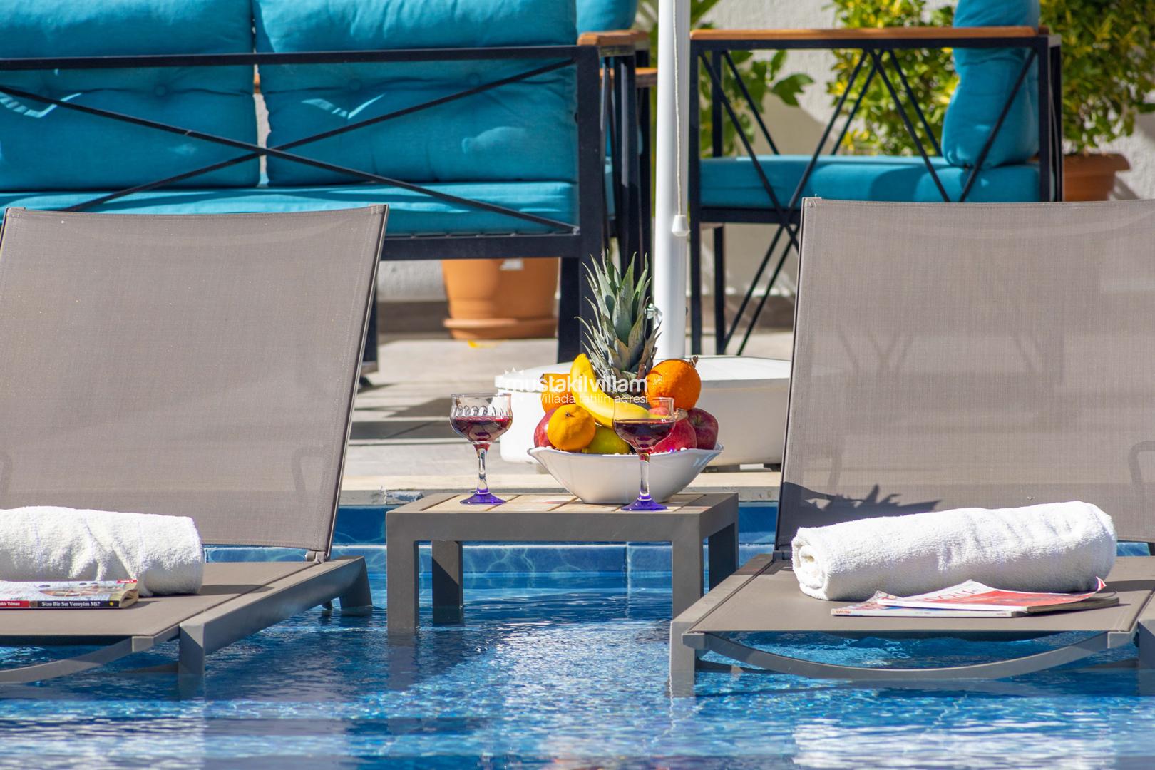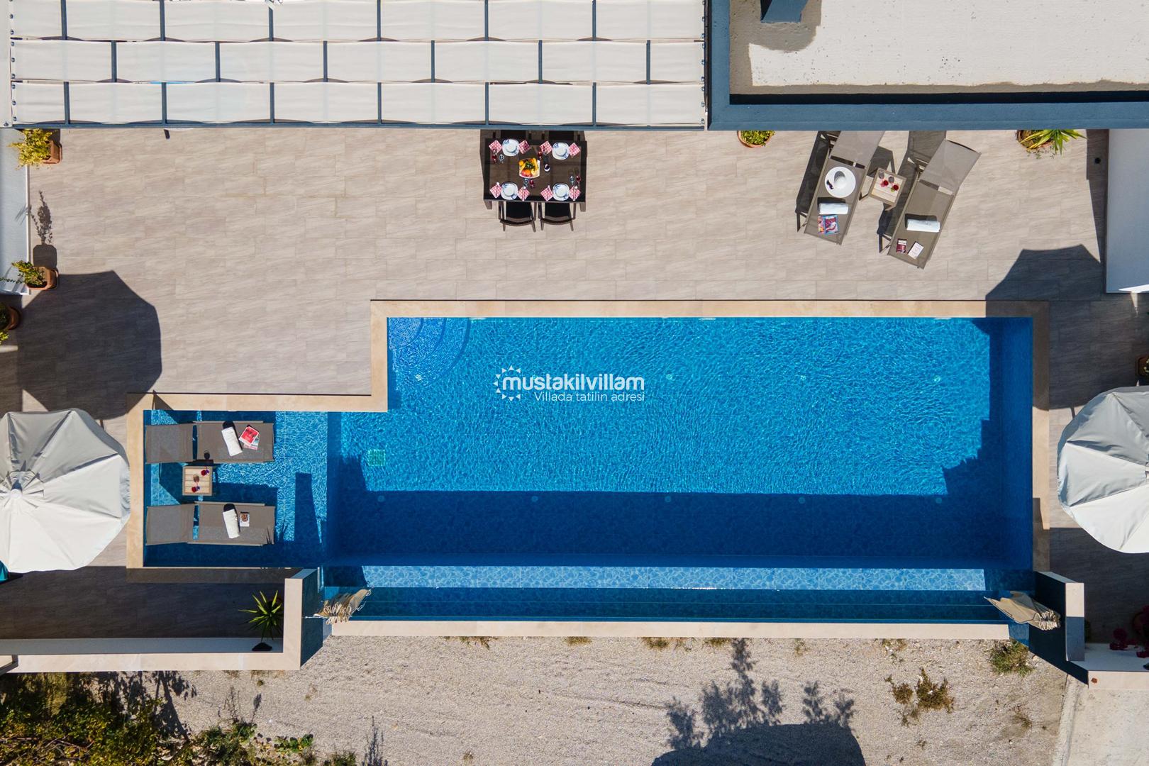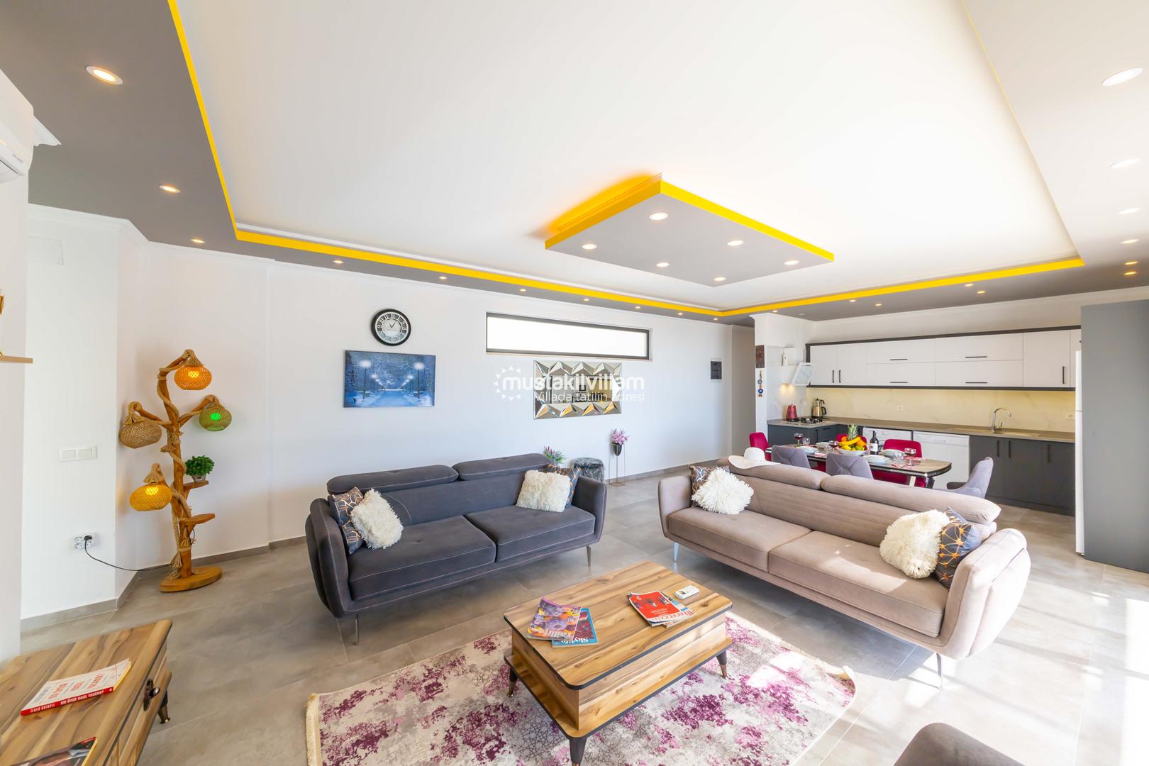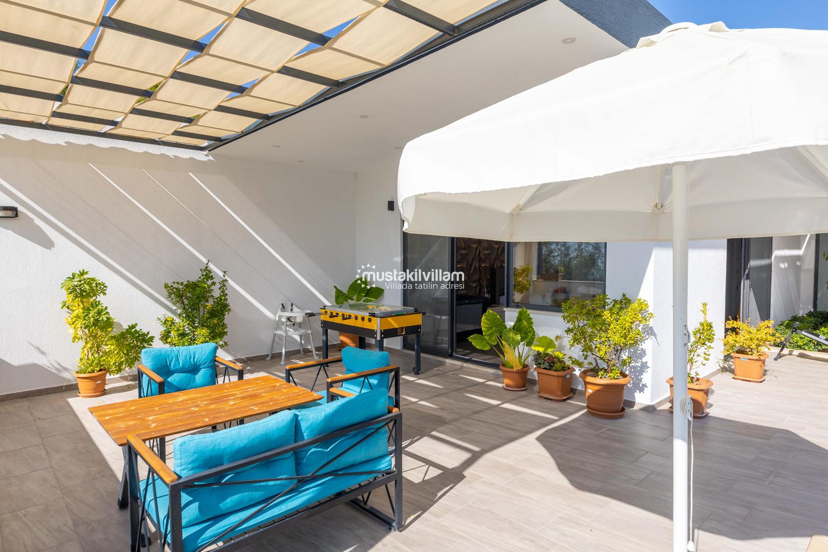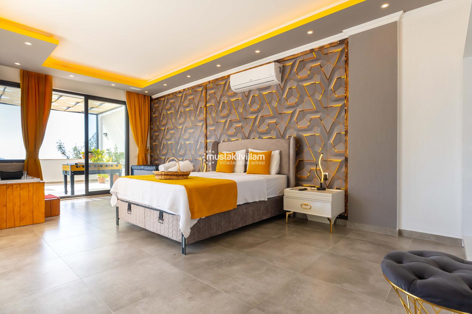 Ferah ve modern tasarıma sahip açık plan salon–mutfak alanında konforlu oturma grubu, klima, televizyon ve havuz terasına doğrudan çıkış bulunmaktadır.Tam donanımlı Amerikan mutfakta buzdolabı, ankastre fırın, mikrodalga ve ihtiyaç duyabileceğiniz temel mutfak ekipmanları yer alır. Tatiliniz boyunca ev konforunu aratmayacak şekilde hazırlanmıştır