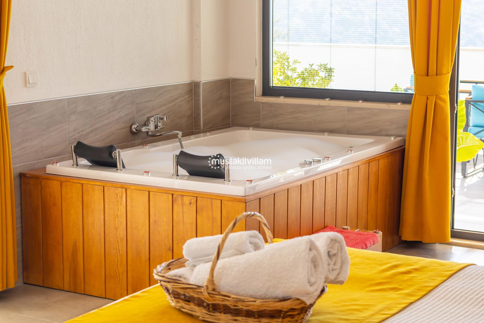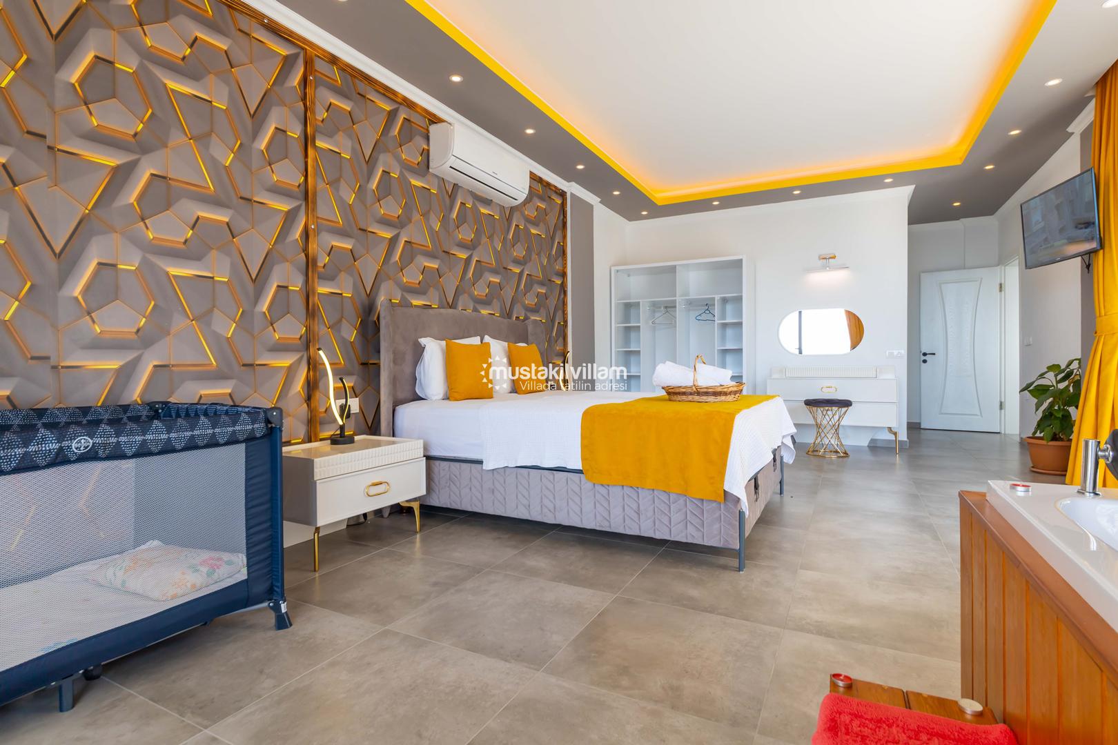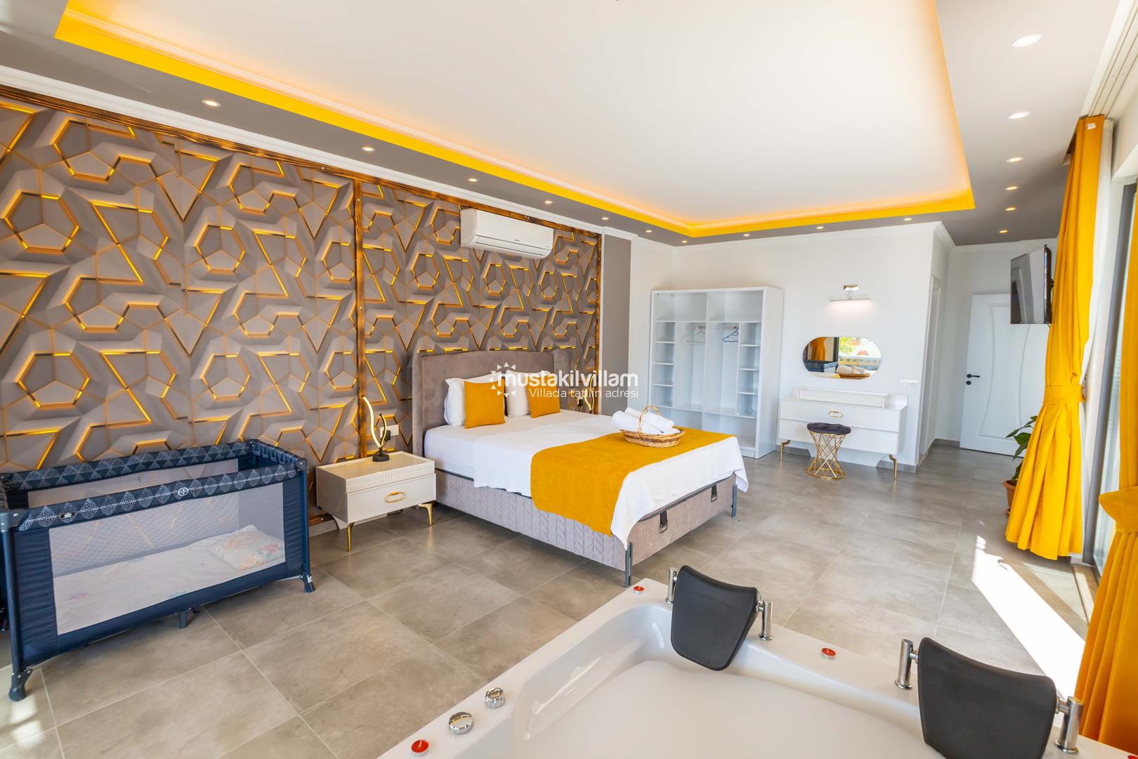 1. Yatak odası 1 çift kişilik yatak + elbise dolabı + komidin + makyaj masası + jakuzi + ebeveyn banyo