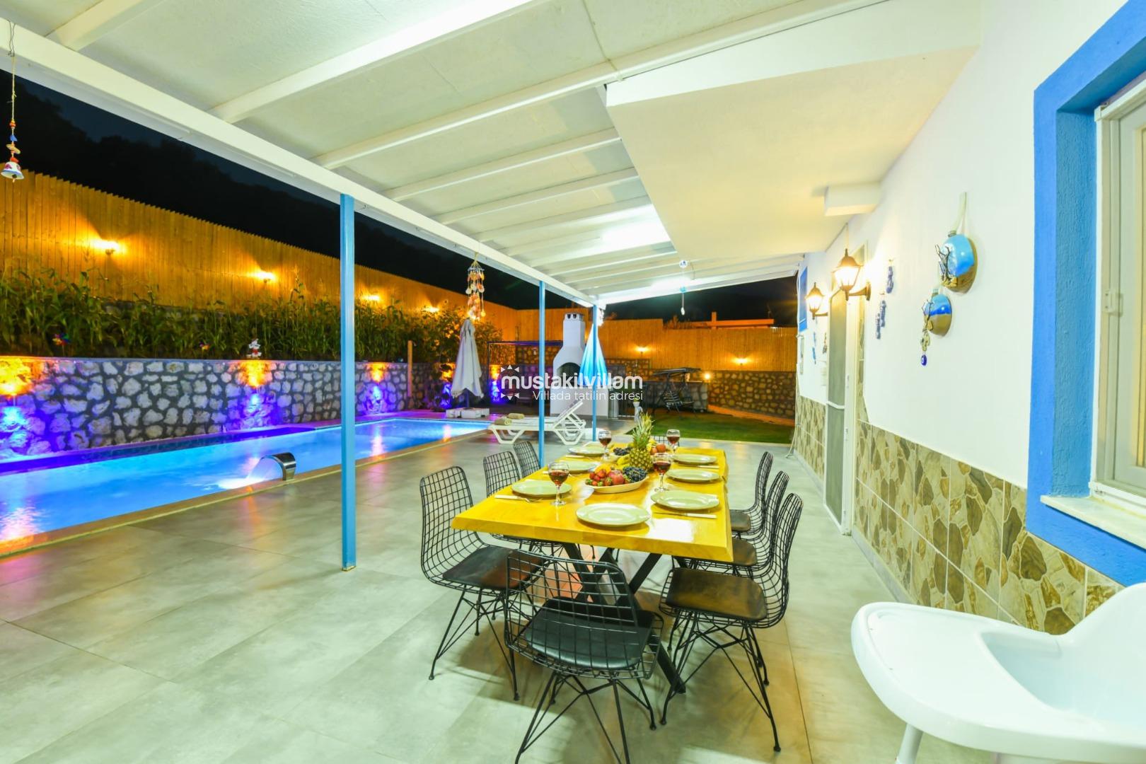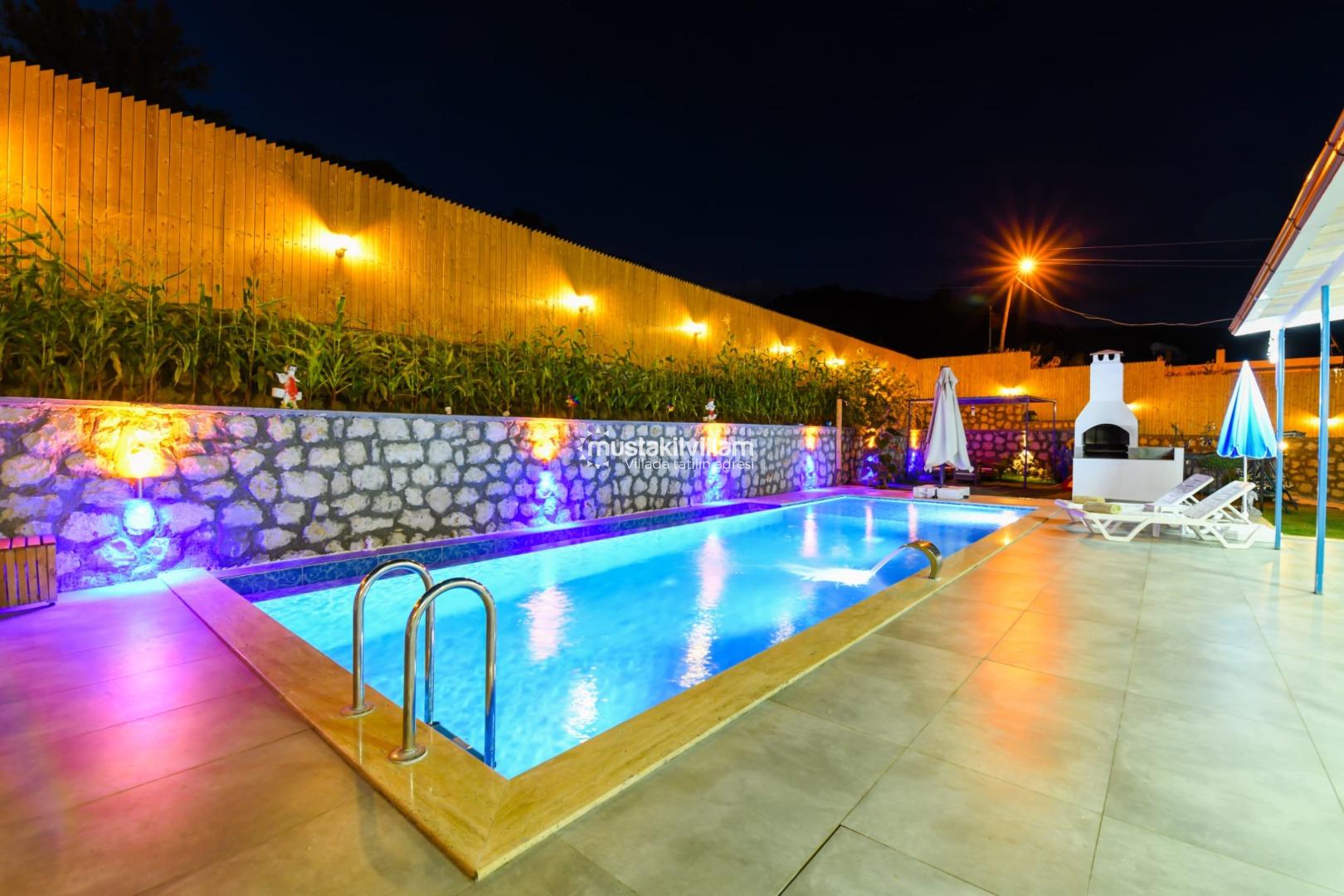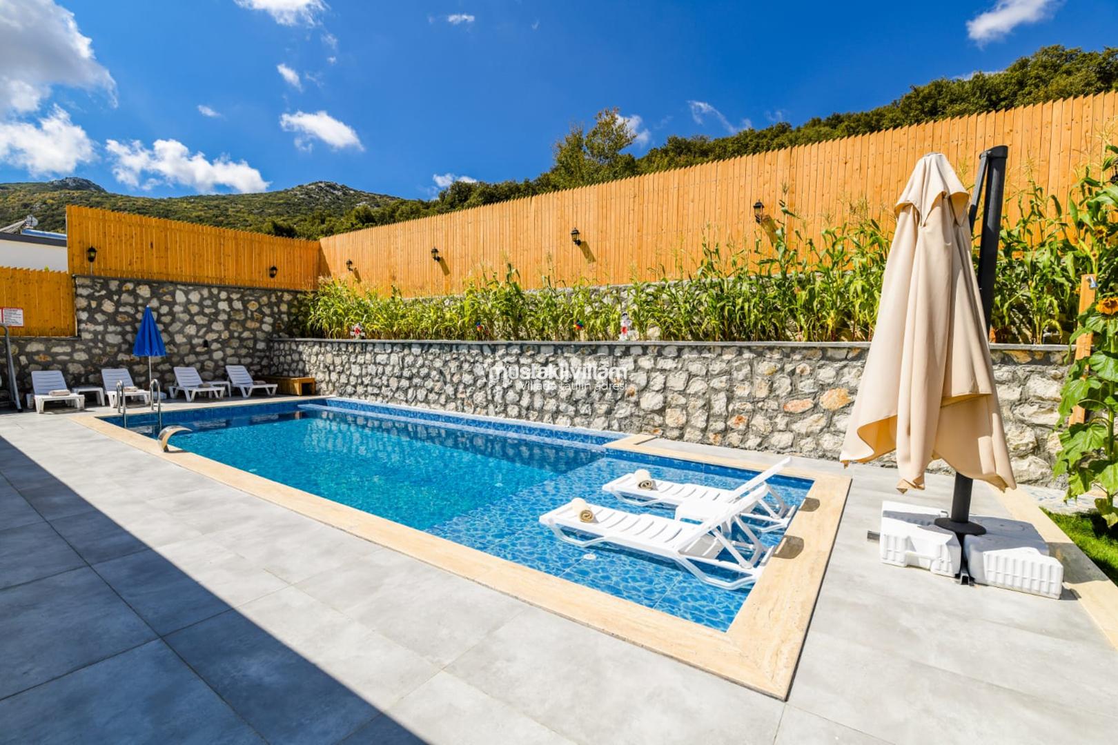 Villa’nın en dikkat çeken özelliklerinden biri korunaklı özel yüzme havuzudur. Havuz, dışarıdan görünmeyecek şekilde konumlandırılmış olup tatil boyunca özgür yüzme ve güneşlenme imkânı sağlar. Havuzun ölçüleri yaklaşık 8 m x 4 m x 1,40 m olup, her mevsim rahat kullanım fırsatı sunar. Şezlong, şemsiye ve veranda oturma alanları ile havuz çevresi, tatiliniz boyunca gün boyu dinlenme ve eğlence sunar.