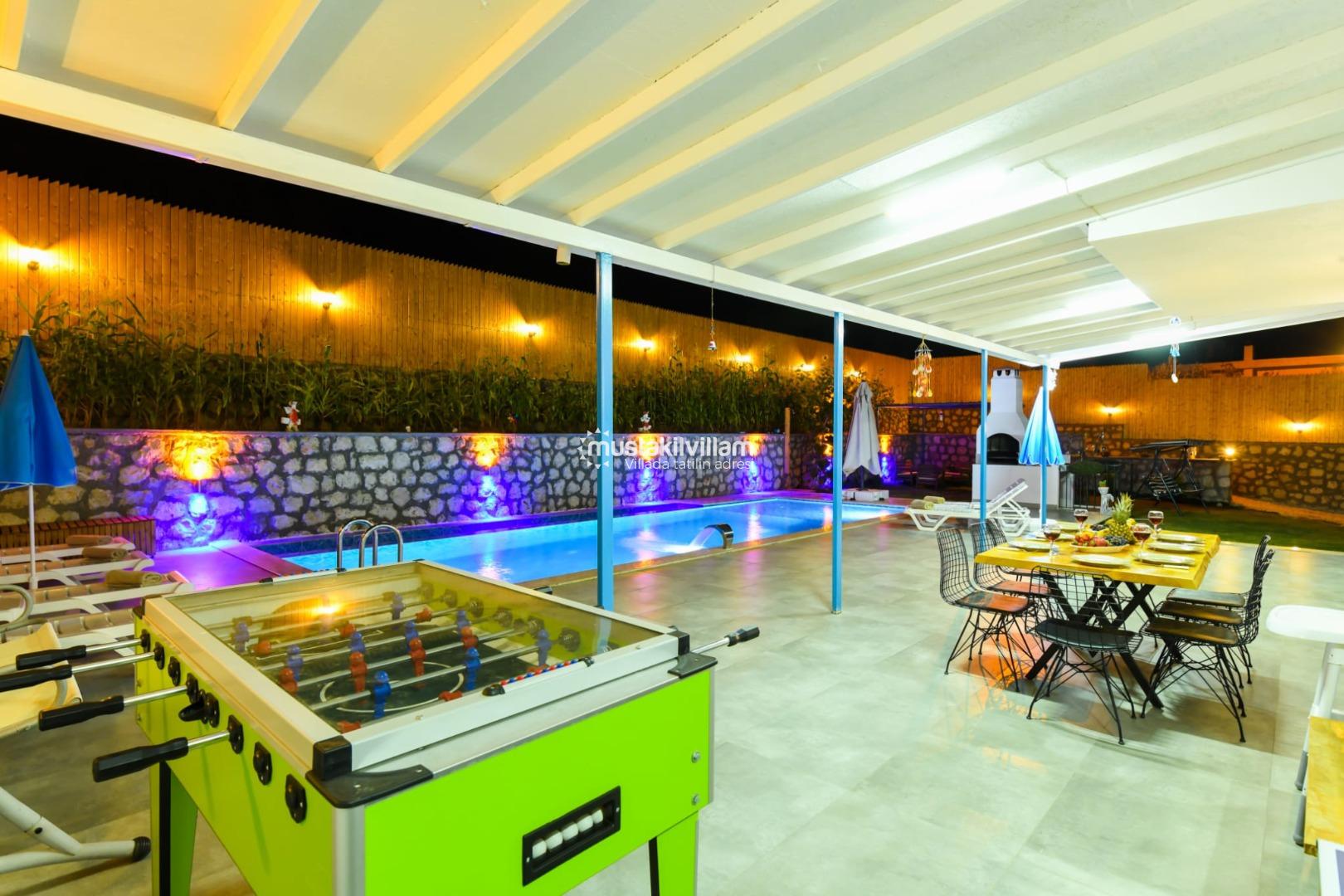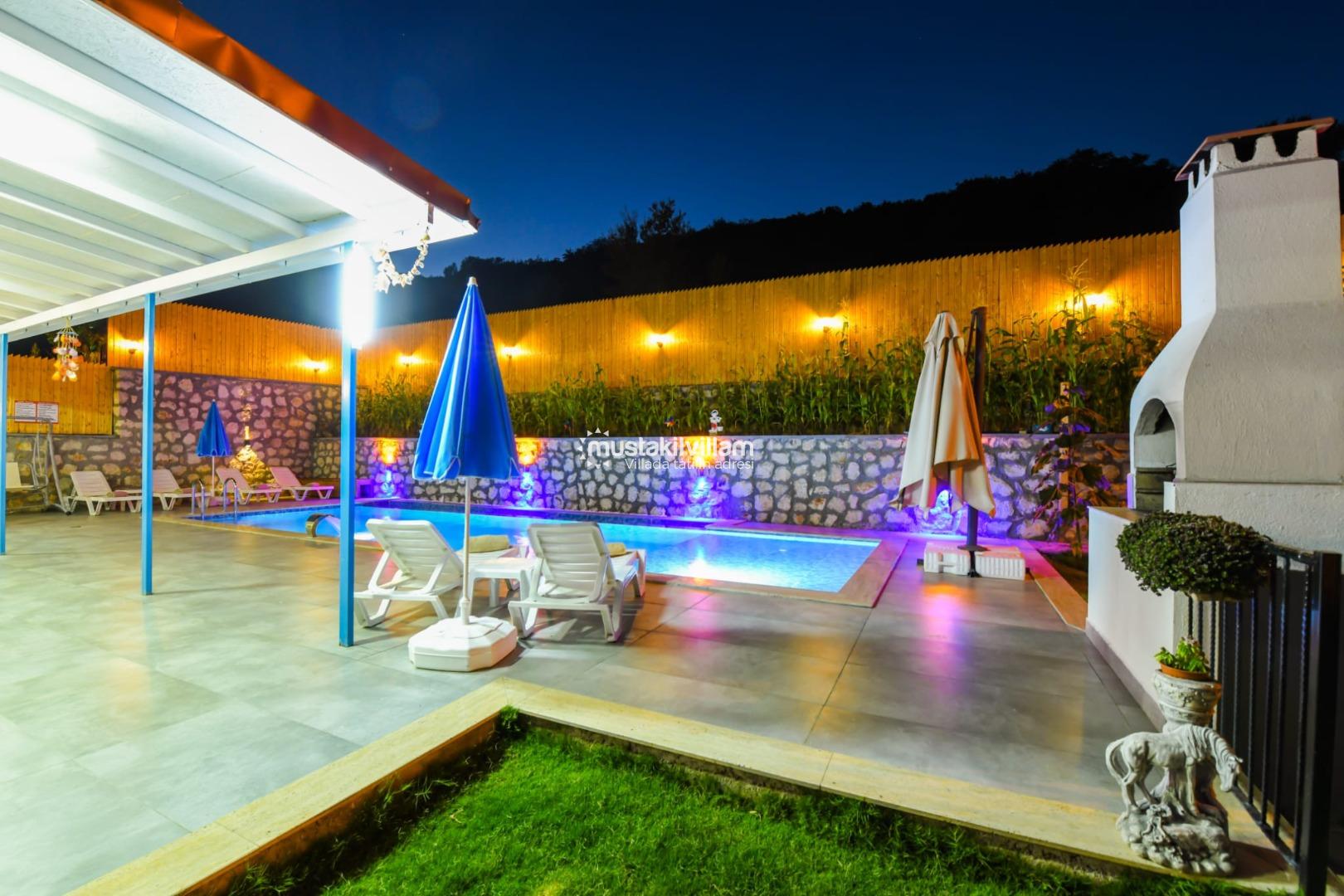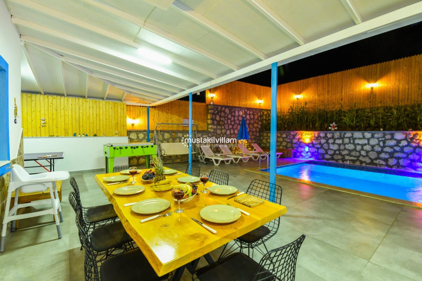 Villa’nın en dikkat çeken özelliklerinden biri korunaklı özel yüzme havuzudur. Havuz, dışarıdan görünmeyecek şekilde konumlandırılmış olup tatil boyunca özgür yüzme ve güneşlenme imkânı sağlar. Havuzun ölçüleri yaklaşık 8 m x 4 m x 1,40 m olup, her mevsim rahat kullanım fırsatı sunar. Şezlong, şemsiye ve veranda oturma alanları ile havuz çevresi, tatiliniz boyunca gün boyu dinlenme ve eğlence sunar.