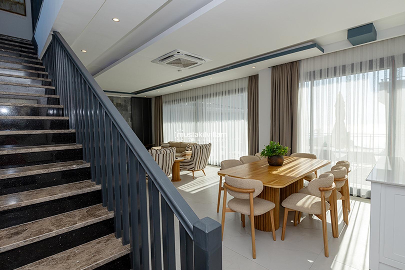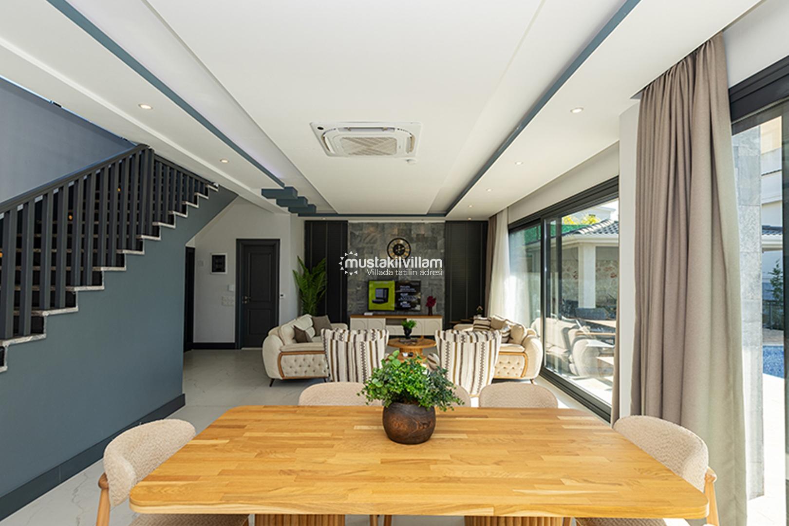 Salon bölümünden havuz ve bahçe alanına kolay erişim, iç dış mekân arasında akıcı bir bağlantı sağlar. Bu tasarım sayesinde gün boyunca hem iç mekân rahatlığı hem de havuz terası keyfi bir arada yaşanabilir.