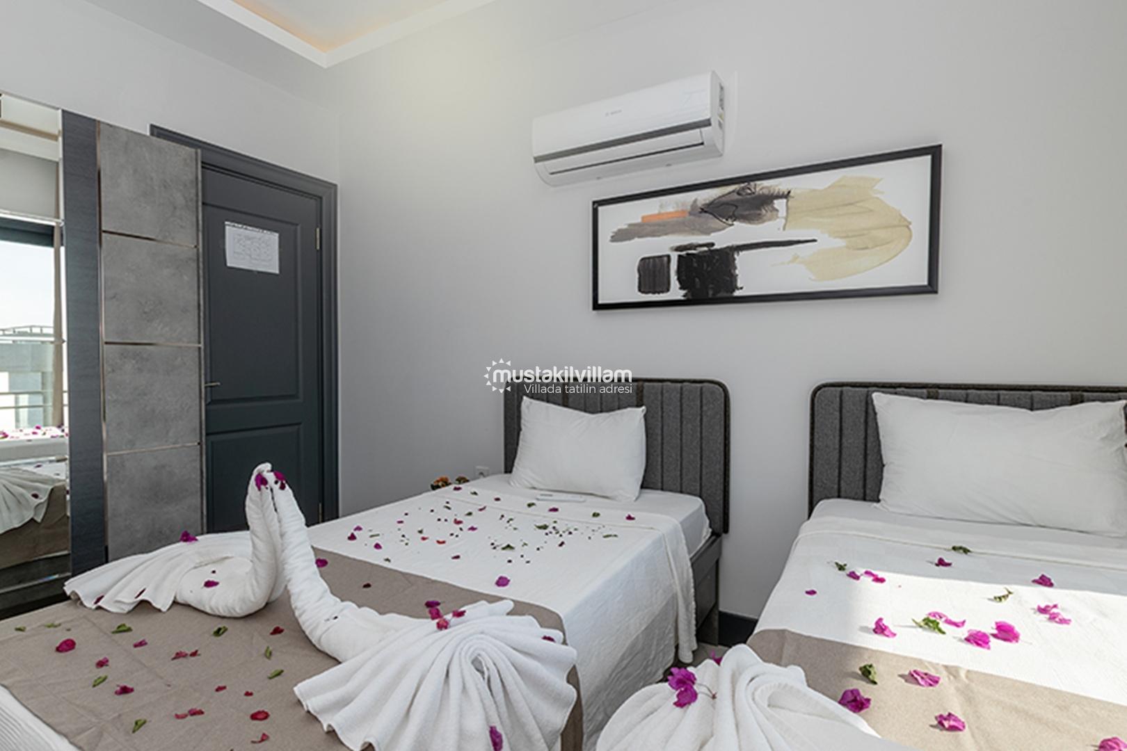 2. Yatak Odası: İki tek kişilik yatak, komodin, elbise dolabı, klima ve özel banyo/WC