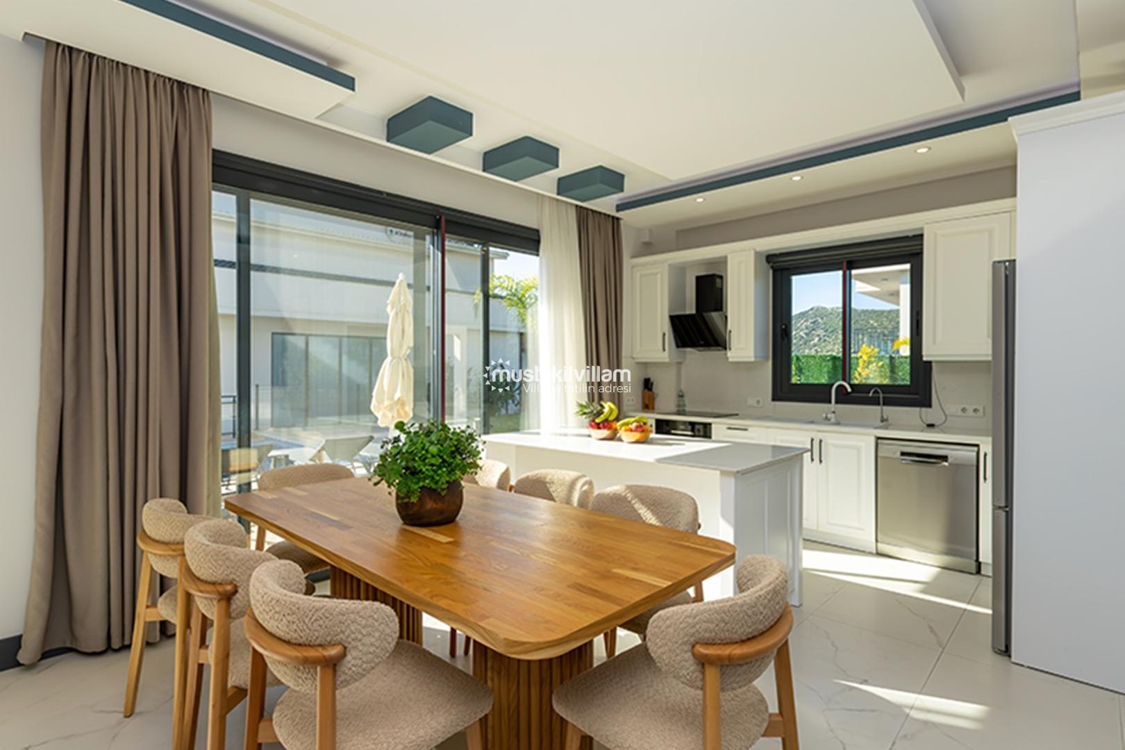 Villa Topaz’ın Amerikan mutfak bölümü, tam donanımlı ve modern yapısıyla dikkat çeker. Buzdolabı, bulaşık makinesi, mikrodalga hırdavat ve ankastre fırın gibi ekipmanlarla donatılmıştır. Bu düzen ile misafirler tatil boyunca kendi yemeklerini hazırlayabilir, açık havuz ve barbekü alanında açık havada yeme keyfi çıkarabilirler.