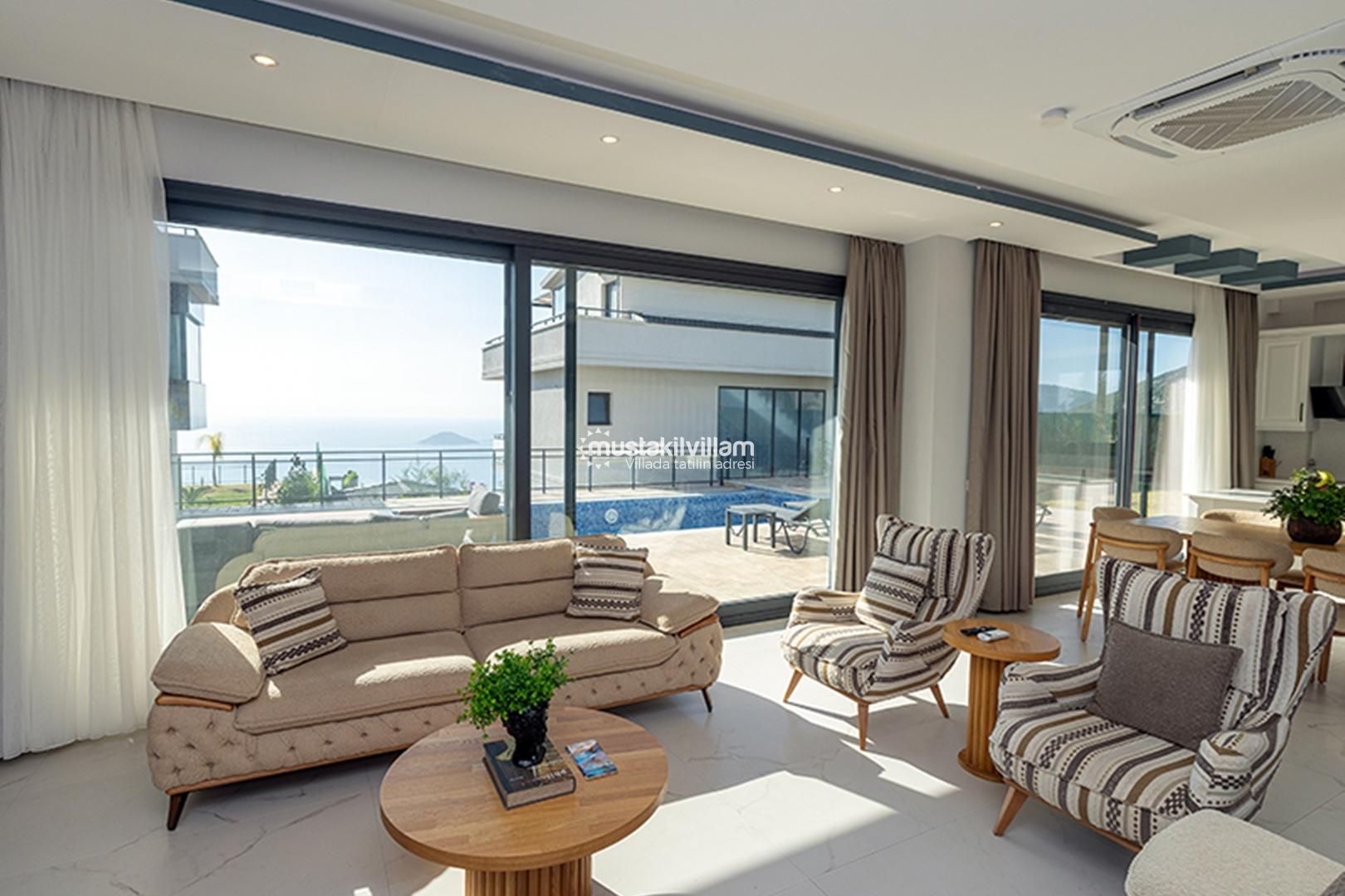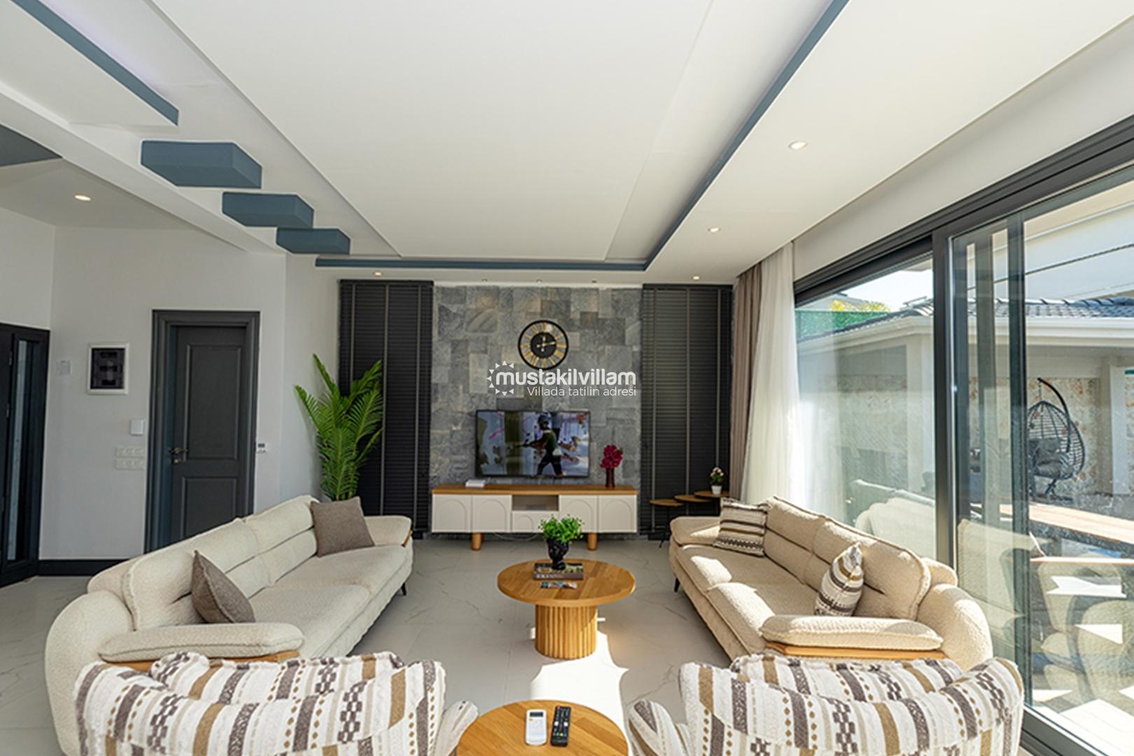 Salon ve yaşam alanları geniş ve aydınlıktır. Salon bölümü, konforlu oturma grubu, LCD TV, klima gibi konfor unsurlarına ek olarak havuz terasına doğrudan çıkış sağlar. Bu sayede iç mekân ve dış mekân arasındaki akış son derece rahattır ve tatil boyunca günün her anında doğayla bütünleşme hissi yaşatır.