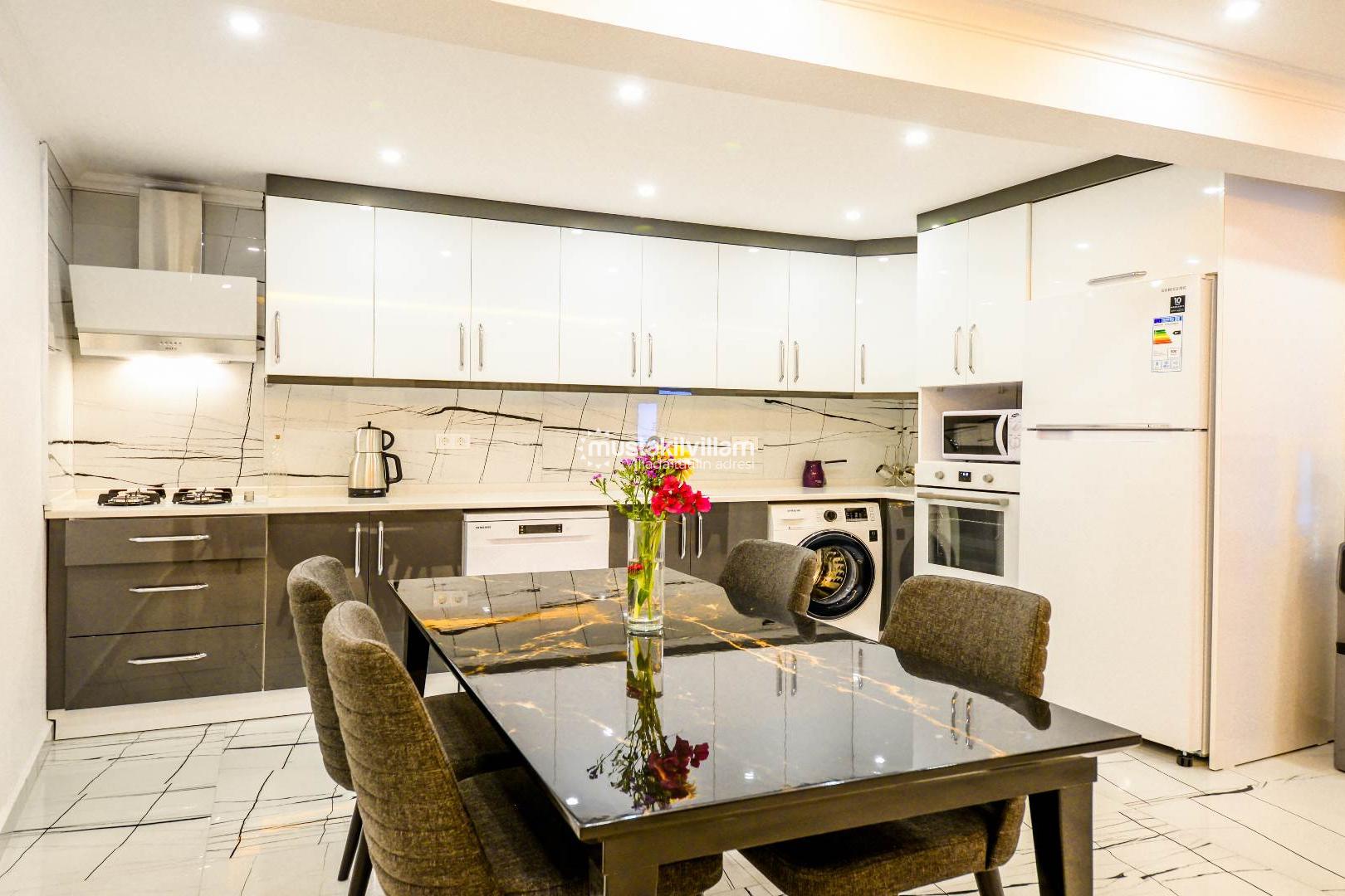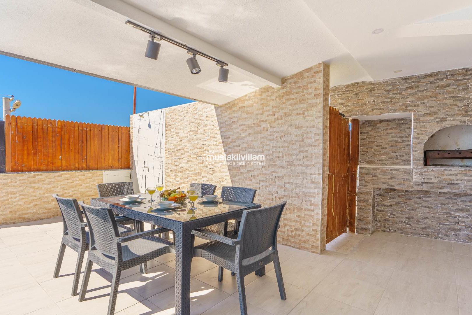 Geniş güneşlenme terası, şezlonglar ve barbekü alanı ile gün boyu keyifli vakit geçirebilir, akşam saatlerinde ise Akdeniz esintisi eşliğinde huzurlu bir atmosferin tadını çıkarabilirsiniz.