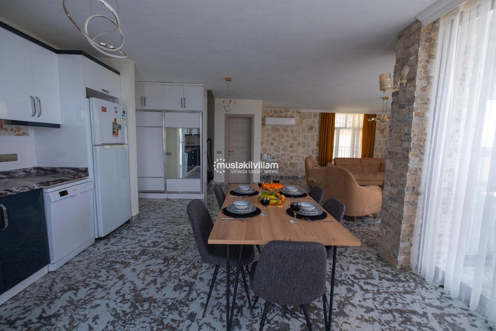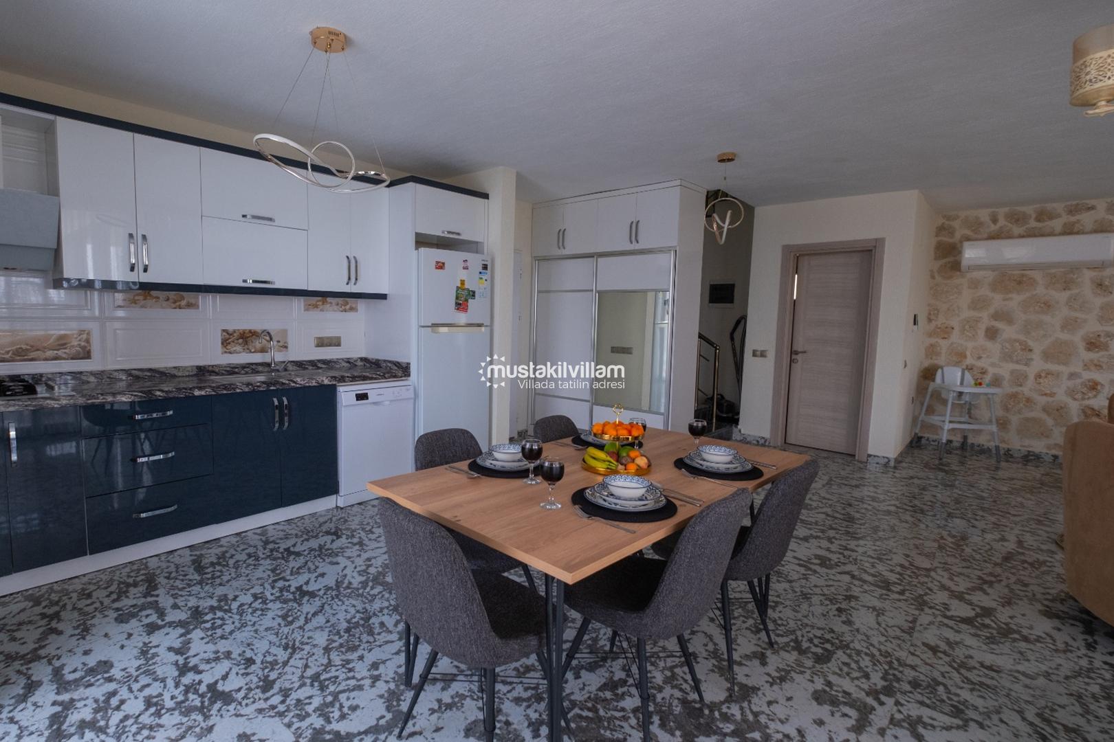 Mutfak, aynı zamanda uzun tatiller için de uygundur. Geniş yemek masası ve sandalyeler, aile ve arkadaş gruplarının rahatça yemek yemesini sağlar.