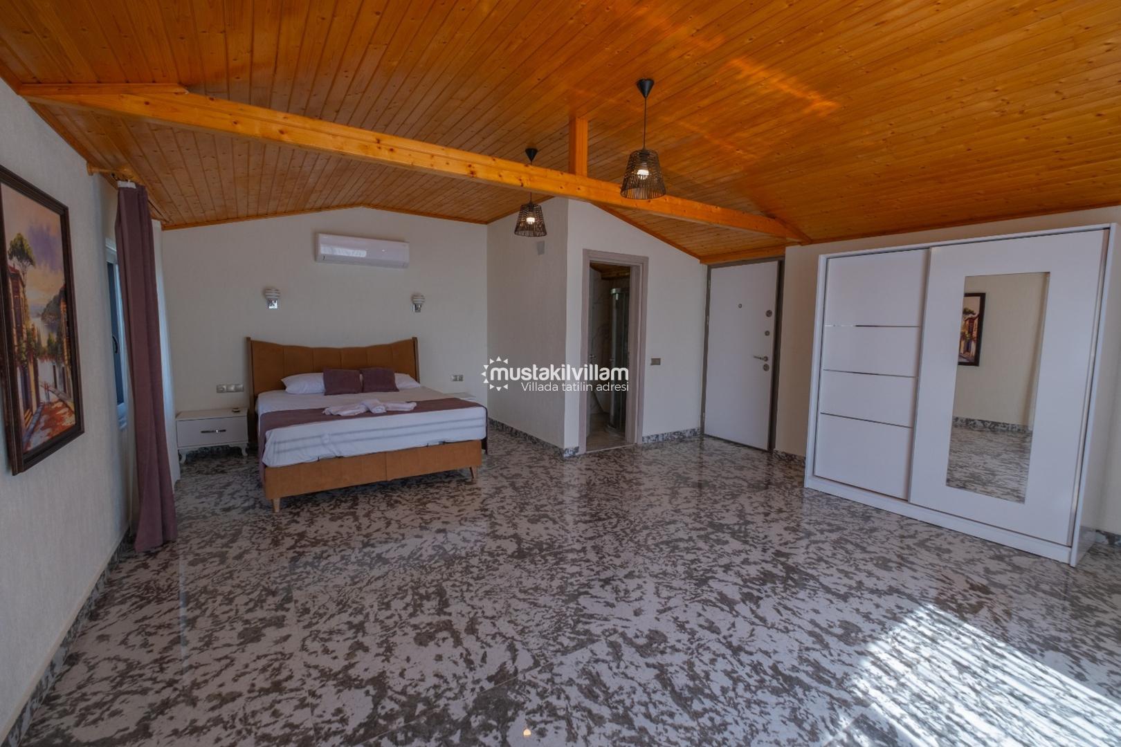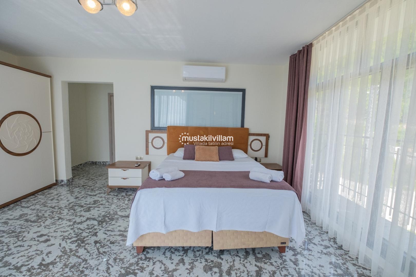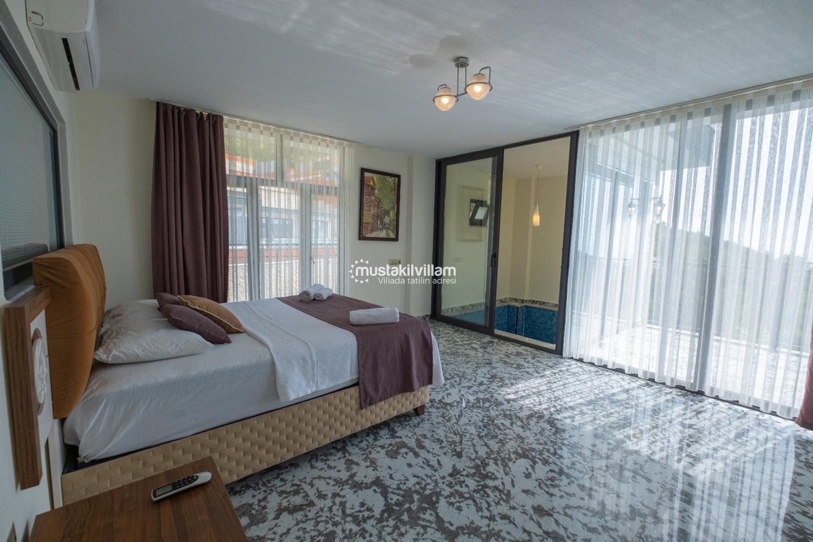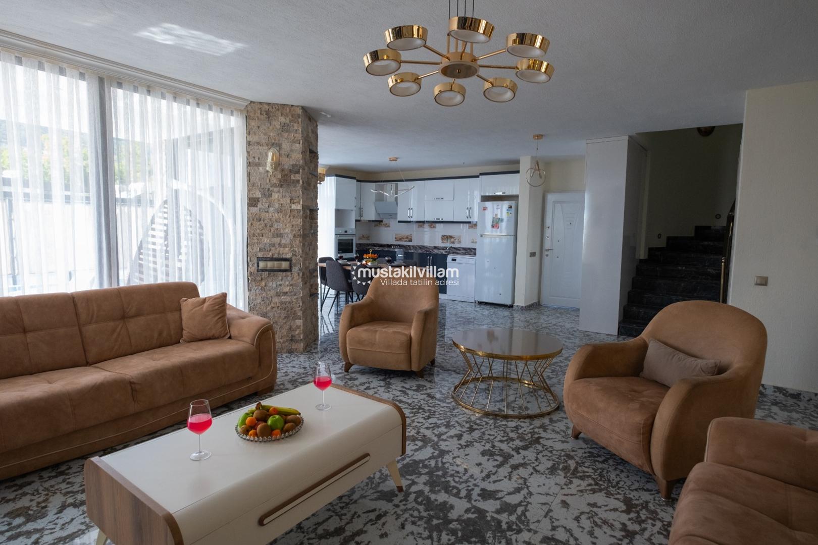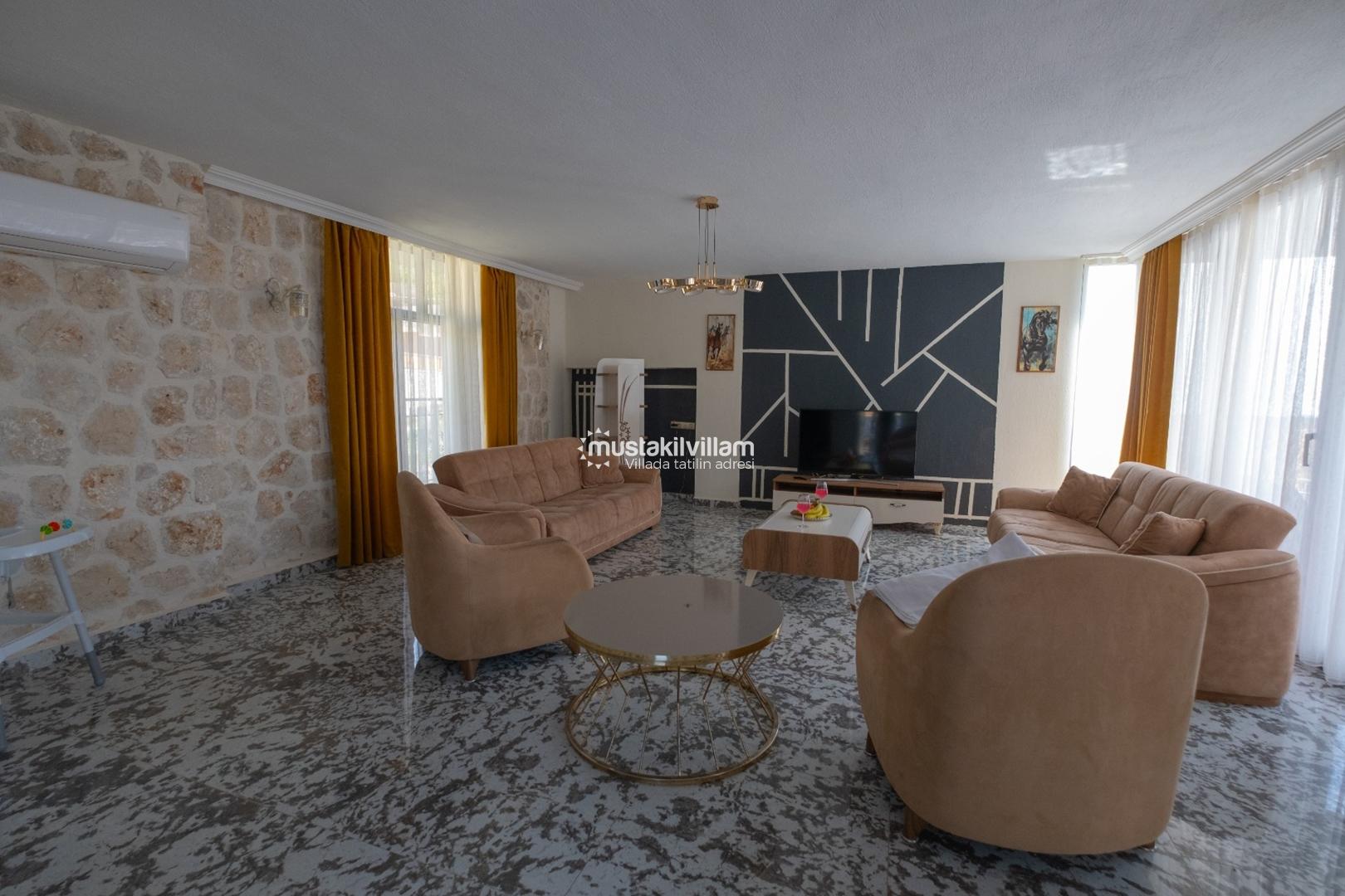 Villanın salon kısmı, konforlu oturma grubu, TV, klima ve kablosuz internet ile donatılmıştır. Salon, havuz terasına direkt erişim sağlar. Bu alan, gün boyunca hem dinlenme hem de sosyalleşme için ideal bir mekandır.