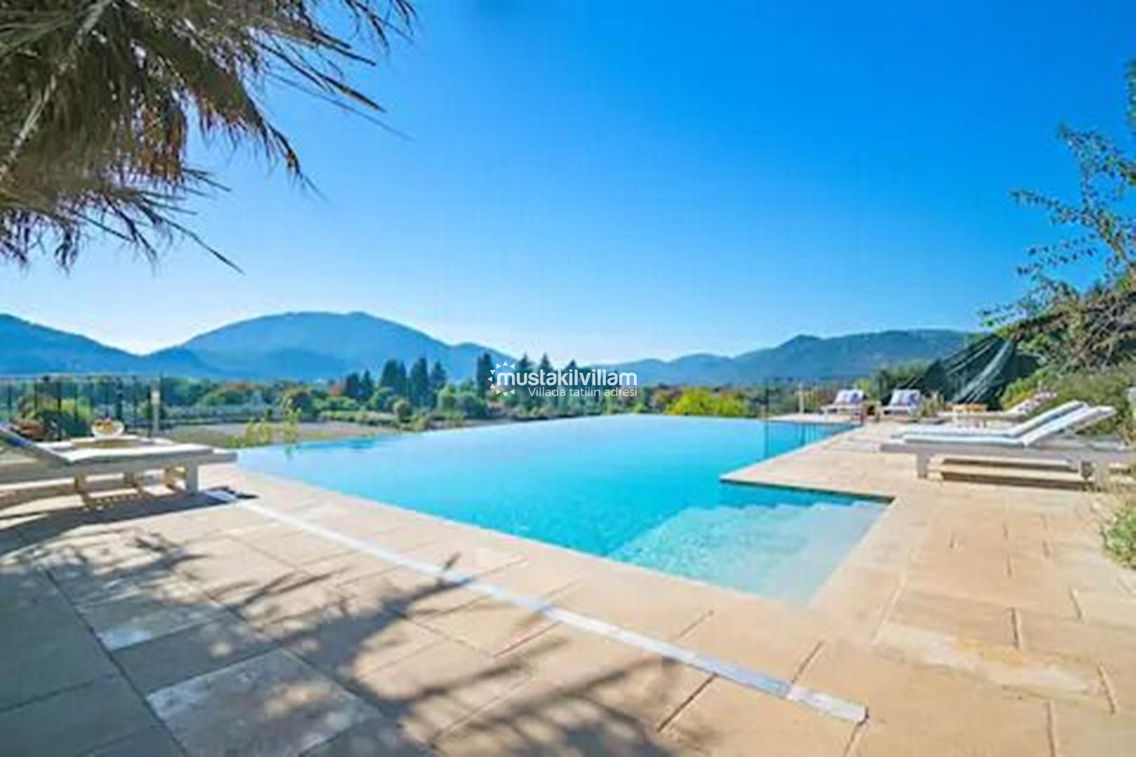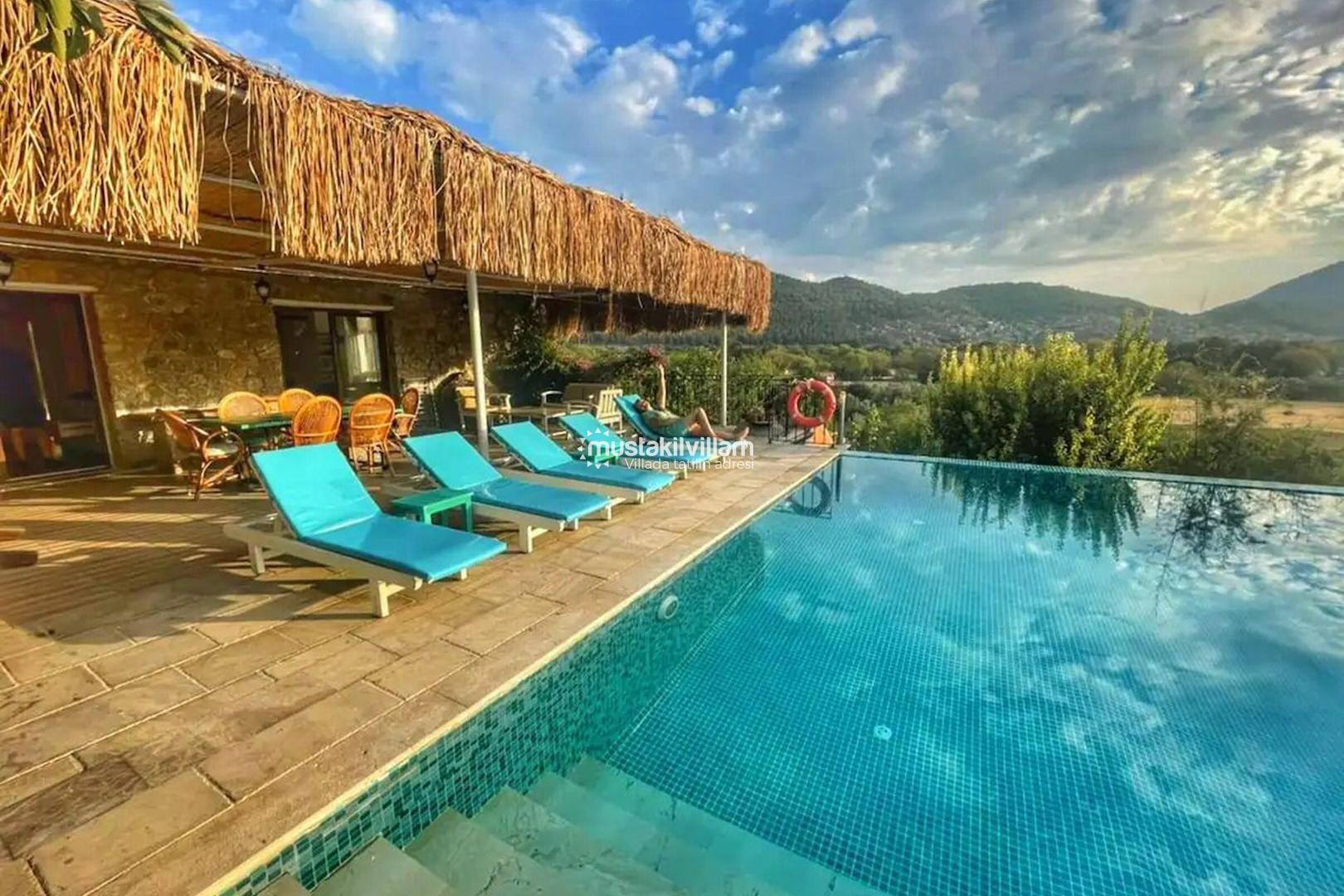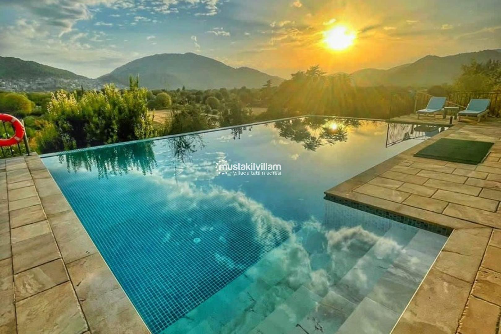 Kayaköy’ün etkileyici vadi manzarasına karşı konumlanan villa, manzarayla bütünleşen sonsuzluk havuzu sayesinde misafirlerine görsel açıdan büyüleyici bir atmosfer sunar. Havuz terası; şezlonglar, gölgelik alanlar ve rahat oturma bölümleriyle donatılmış olup gün boyu dinlenme ve keyifli vakit geçirme imkânı sağlar. Doğa ile iç içe olan bahçe alanı, sakin ve huzurlu bir tatil ortamı oluşturur.