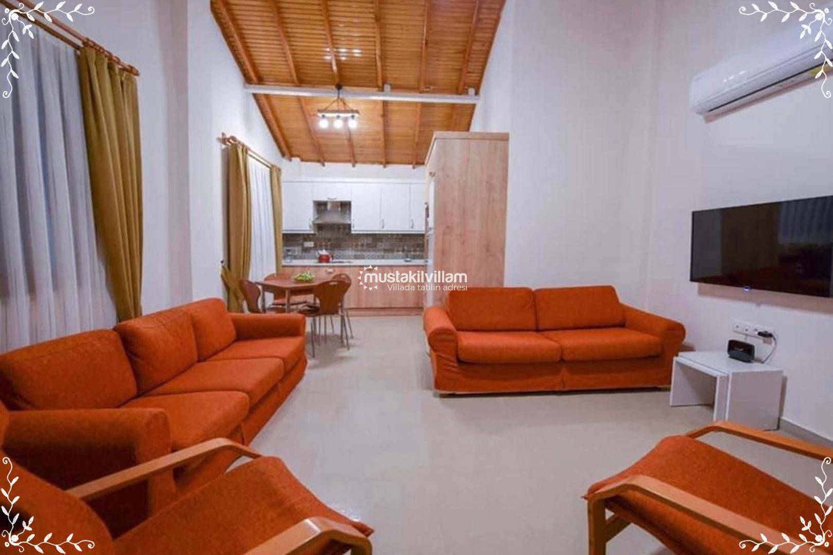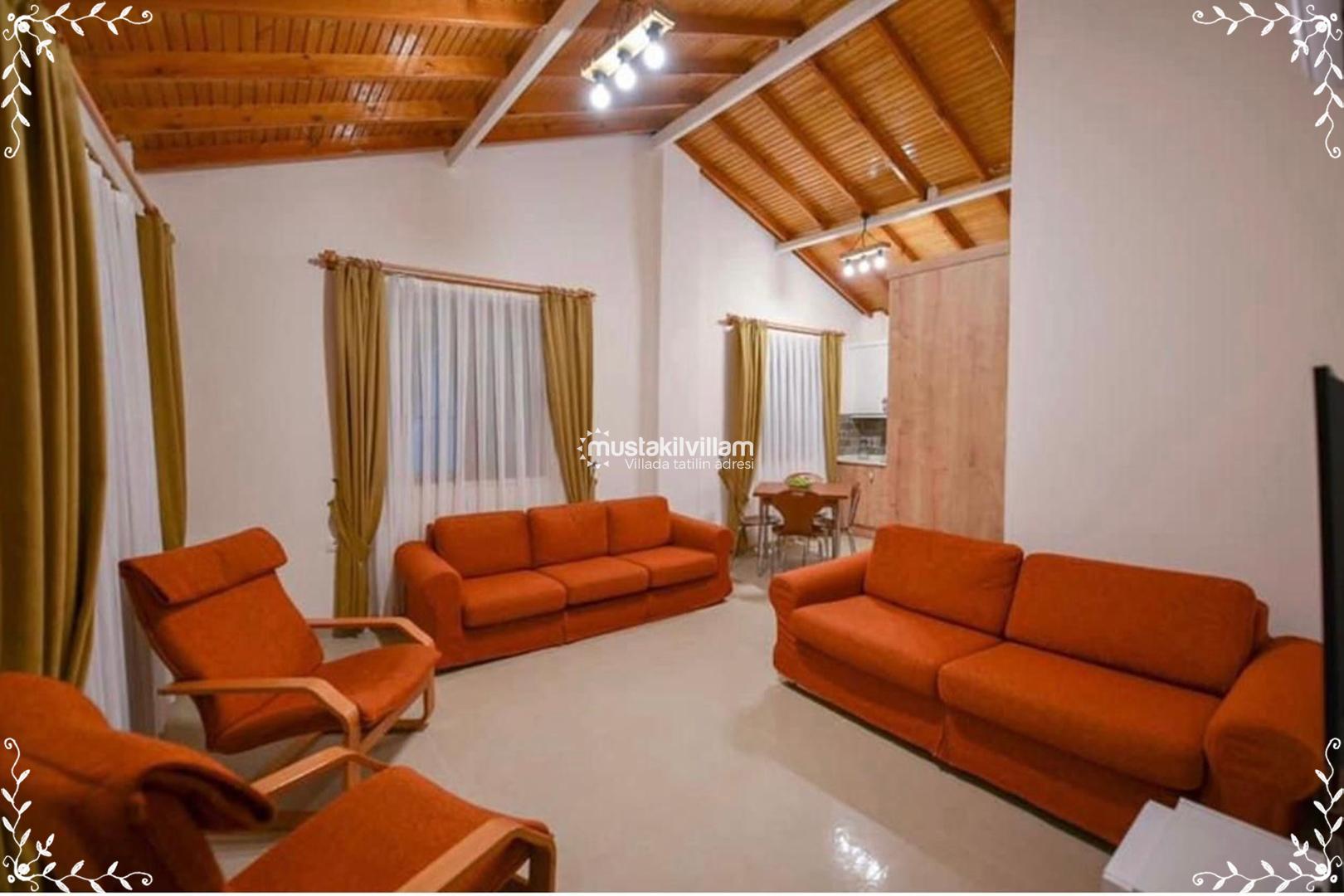 Villa Karamel’in salonu, tatilinizi keyifli hale getirecek şekilde tasarlanmıştır: