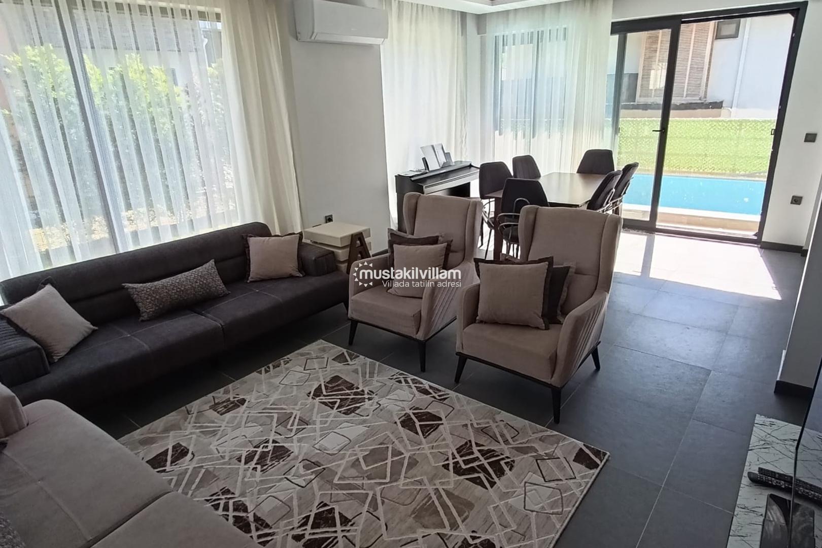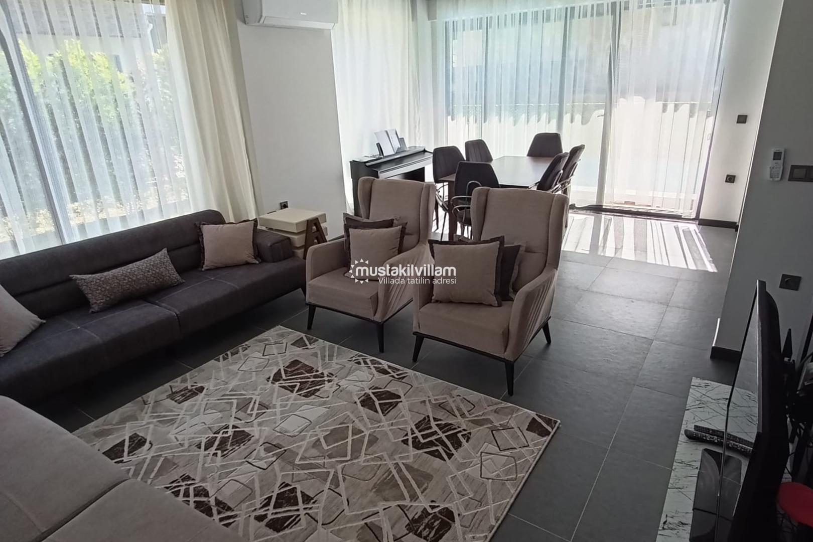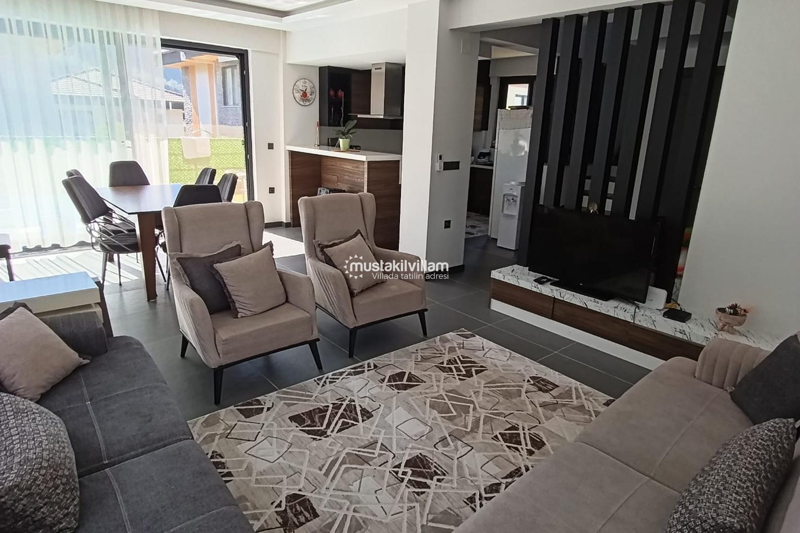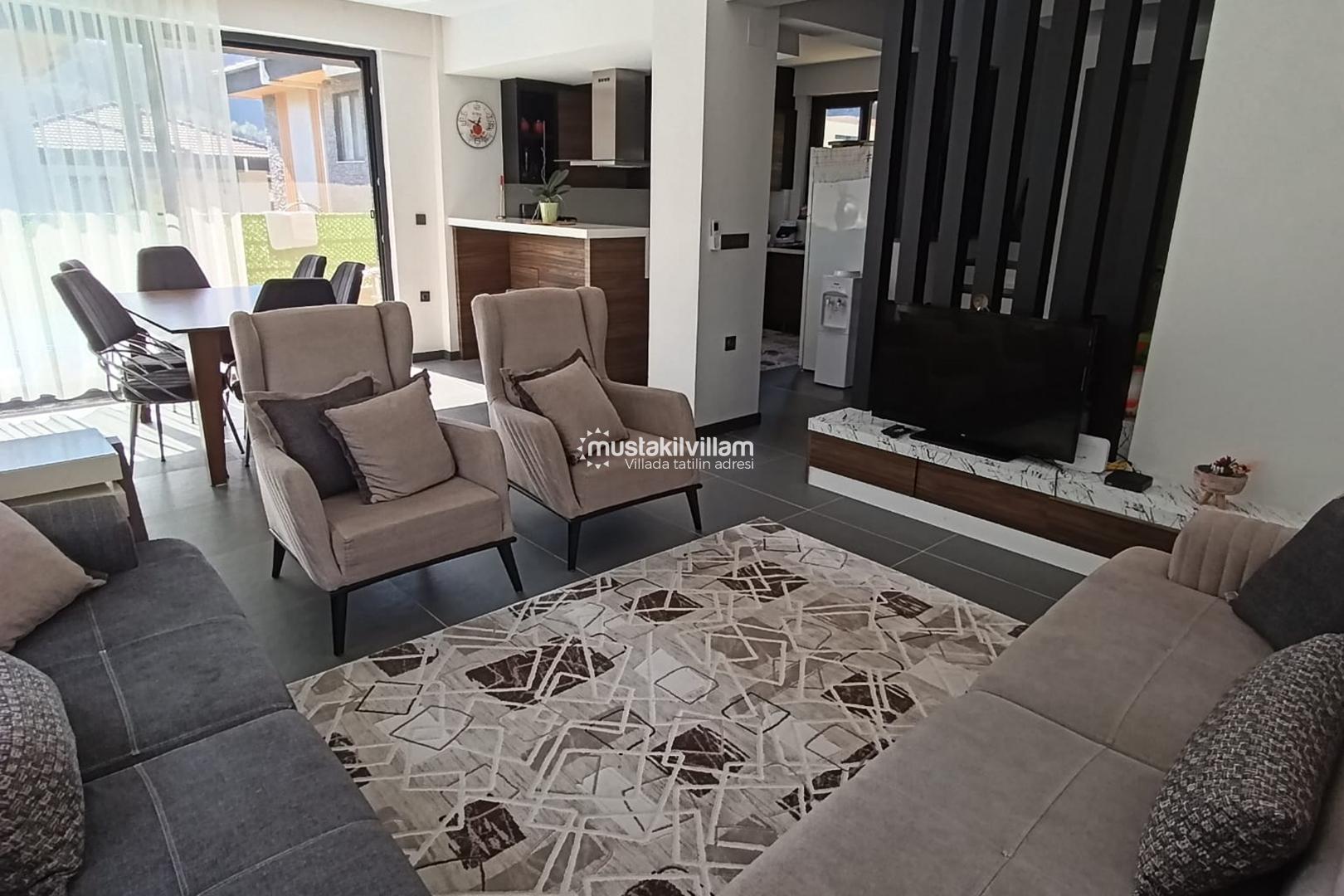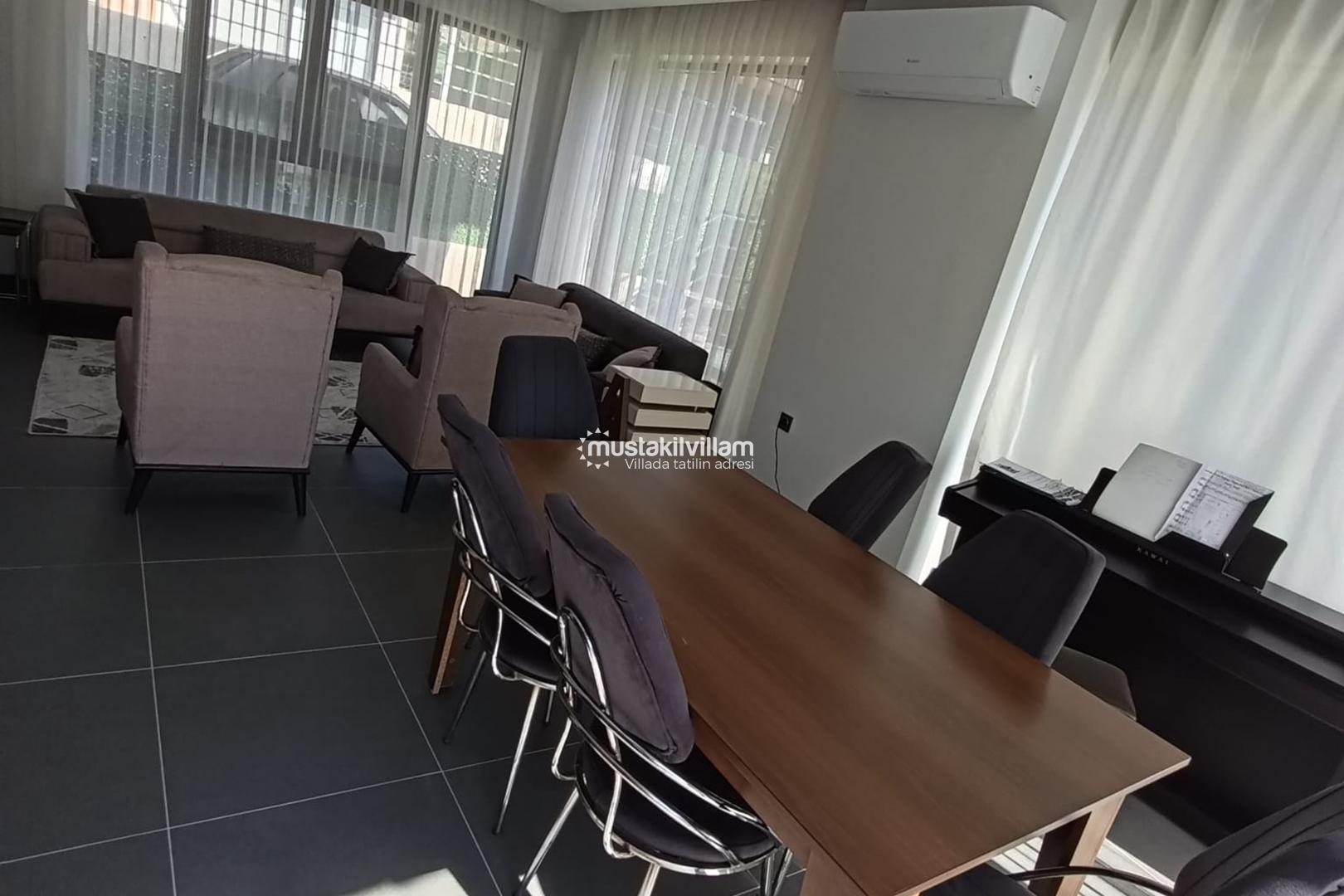 Villa Orman’ın iç mekân tasarımı, modern çizgiler ve sade dekorasyon anlayışıyla hazırlanmıştır. Geniş salon alanı, günün her saatinde keyifle vakit geçirebileceğiniz bir ortam sunar. Rahat oturma grubu, ferah alan yapısı ve aydınlık atmosferi sayesinde kendinizi evinizde hissedeceğiniz bir konaklama deneyimi yaşarsınız.