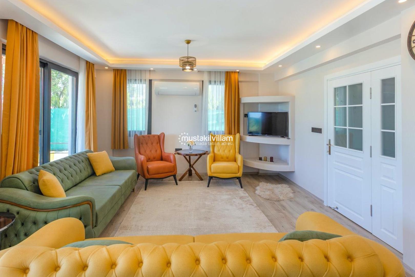 Villa Favori’nin salonu geniş ve aydınlık bir yaşam alanı sunar. Modern mobilyalarla dekore edilen bu alan, günün yorgunluğunu atabileceğiniz konforlu bir ortam sağlar.