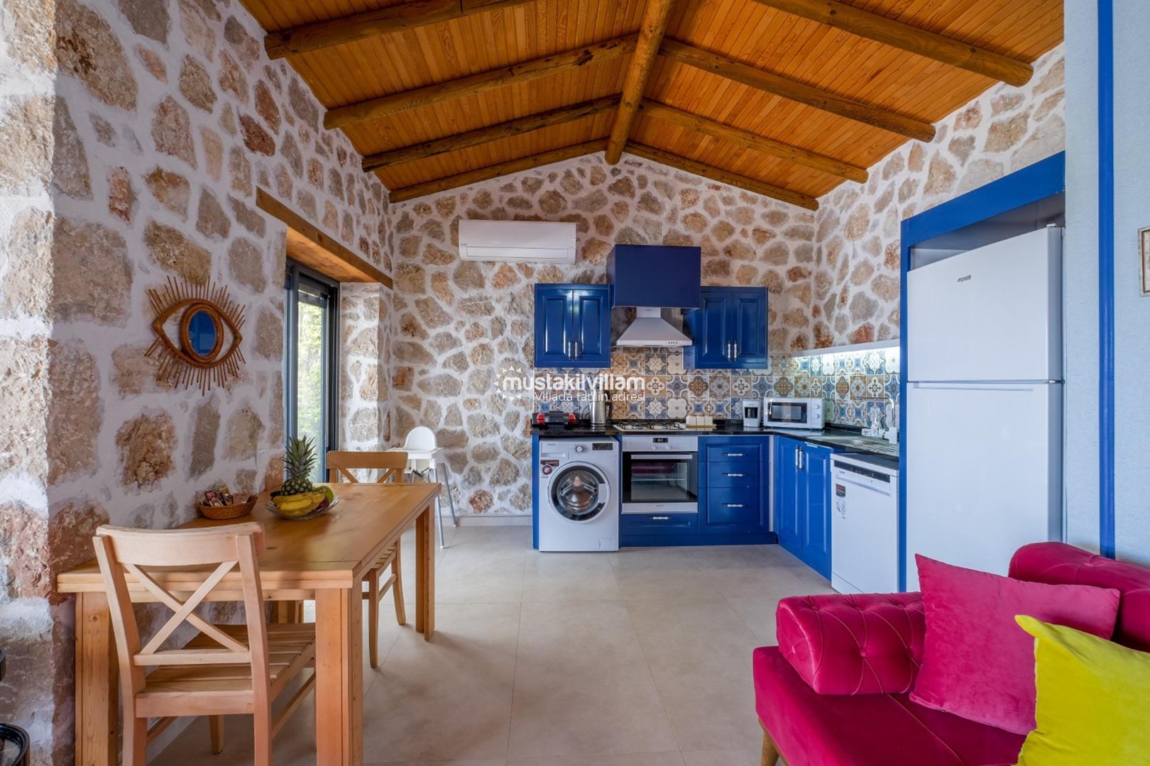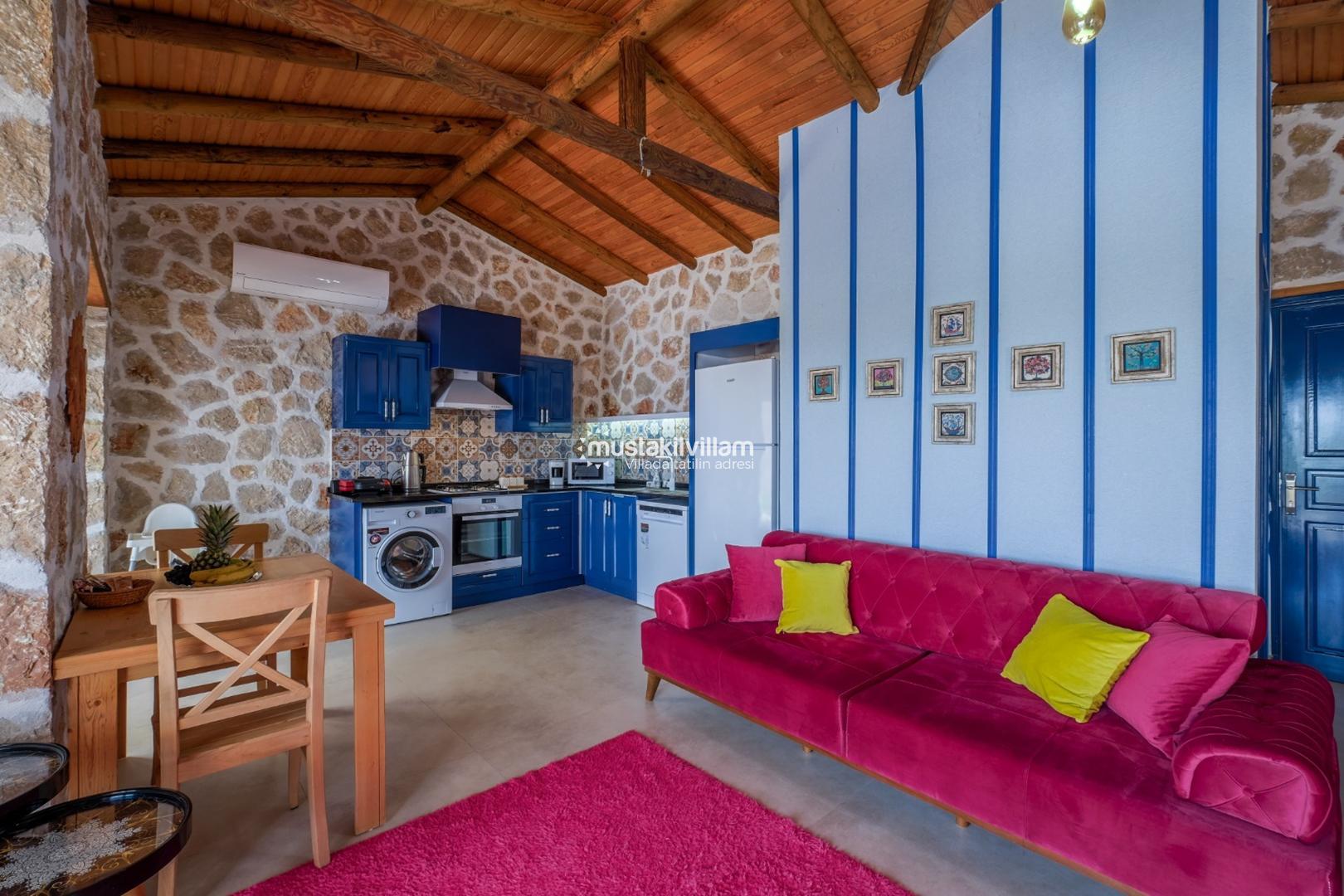 Villanın salonu ve mutfak alanı, ferah ve modern tasarımıyla dikkat çeker. Açık mutfak, tam donanımlı olup tatil boyunca ihtiyacınız olan tüm ekipmanları içerir: