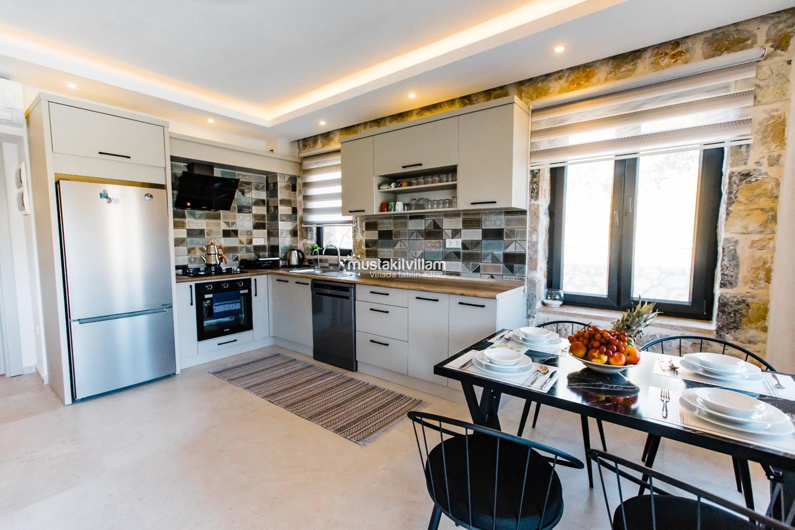 Villa Ersan 2’nin mutfağı tam donanımlıdır ve tatil boyunca yemek hazırlamayı kolaylaştırır: