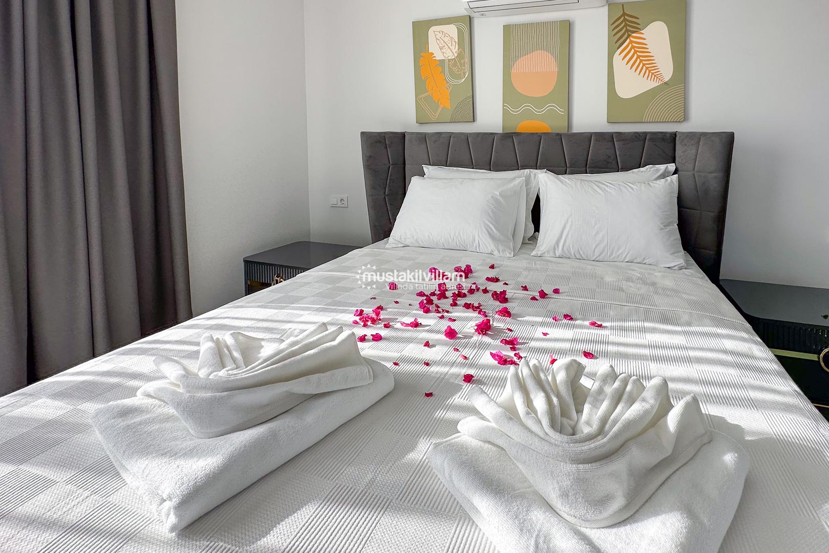 4. Yatak Odası (Teras Kat): Süit aile yatak odası, çift kişilik yatak, komodin, klima, elbise dolabı, banyo ve balkon.