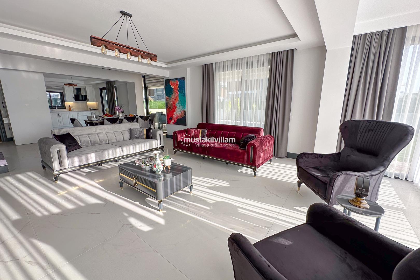 Zemin katta modern Amerikan mutfak yer almakta olup; buzdolabı, bulaşık makinesi, çamaşır makinesi, mikrodalga, fırın, 4’lü ocak, elektrikli su ısıtıcı, 10 kişilik yemek takımı, tava, tencereler ve çatal-bıçak gibi tüm mutfak gereçleri mevcuttur. Salon havuz ve doğa manzaralıdır ve oturma grubu, 4K Ultra HD uydu TV, 8 kişilik yemek masası, klima, WC ve havuz kenarına çıkış imkânı sunmaktadır.