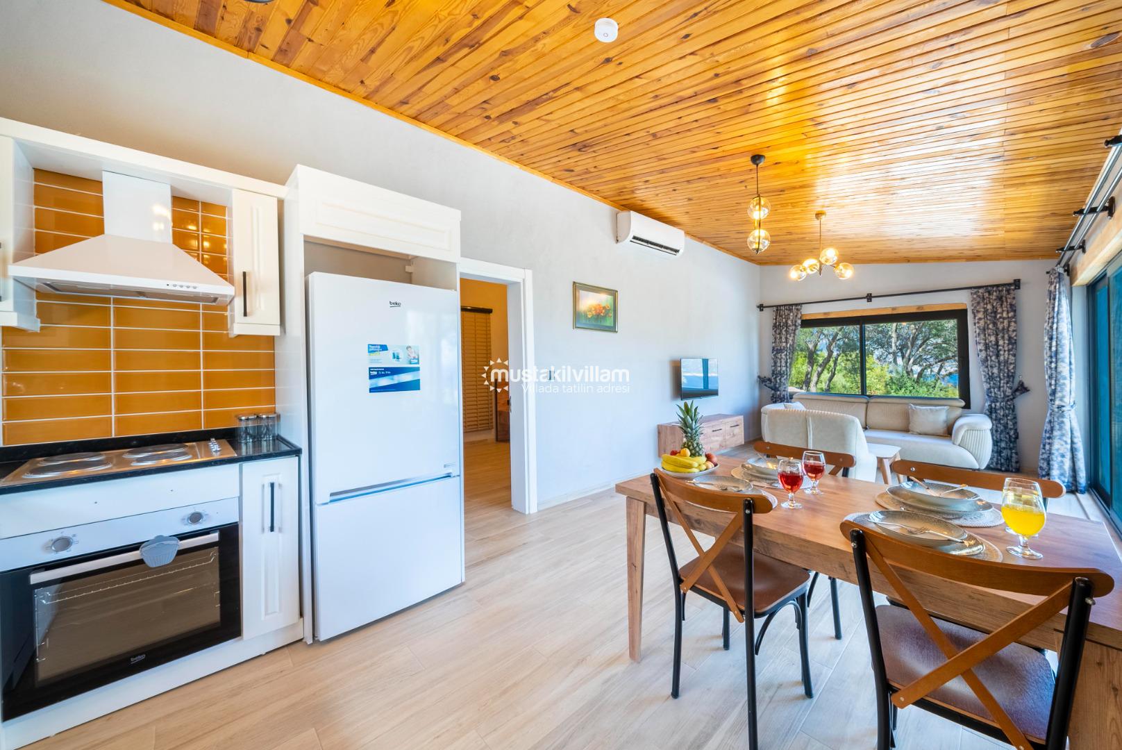 Açık plan yaşam alanı, ferah yapısı ile dikkat çekerken; salon ve mutfak bölümü bir arada tasarlanarak kullanım kolaylığı sağlanmıştır. Modern mutfakta ihtiyaç duyabileceğiniz temel ekipmanlar bulunmakta olup, tatiliniz boyunca kendi yemeklerinizi rahatlıkla hazırlayabilirsiniz.