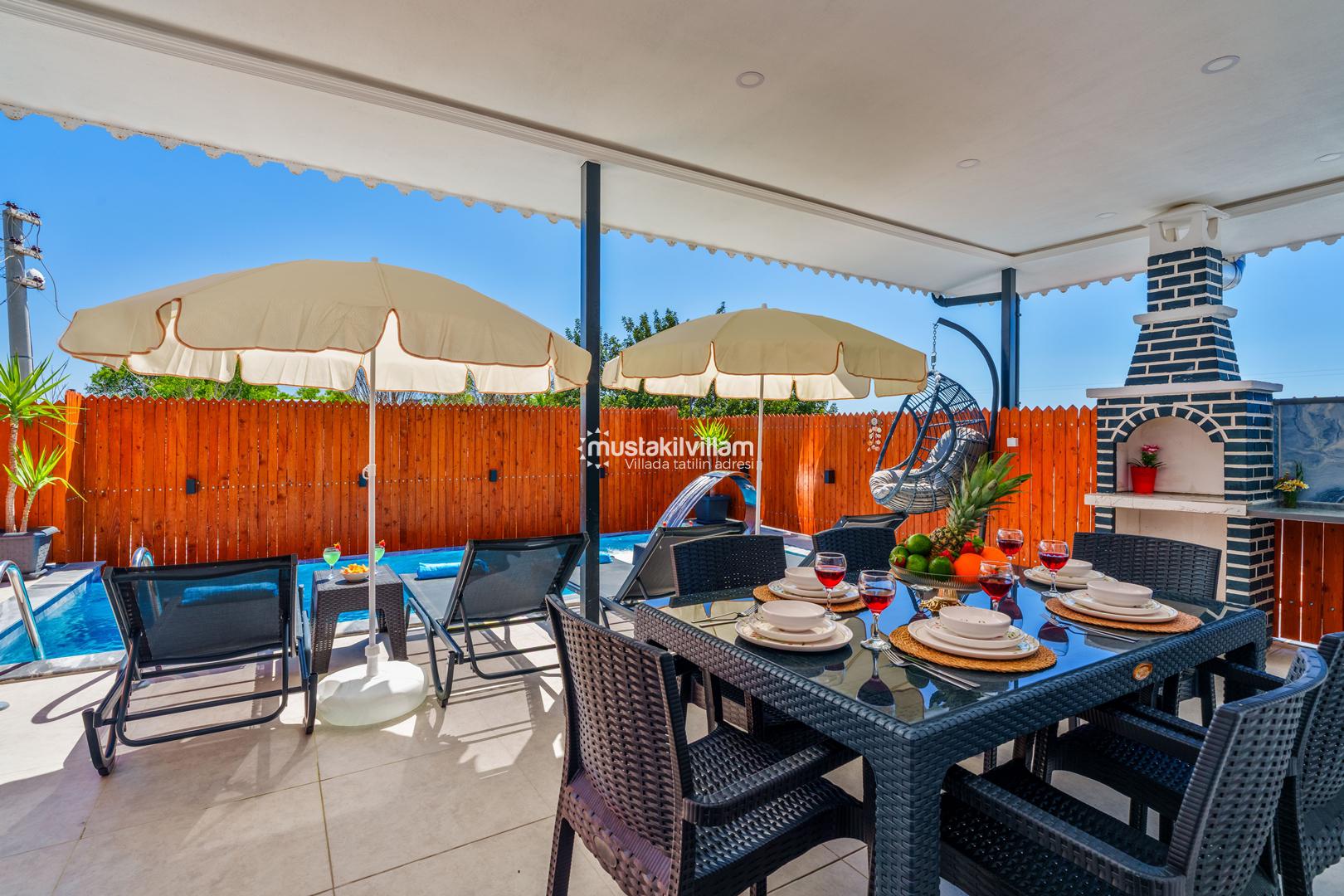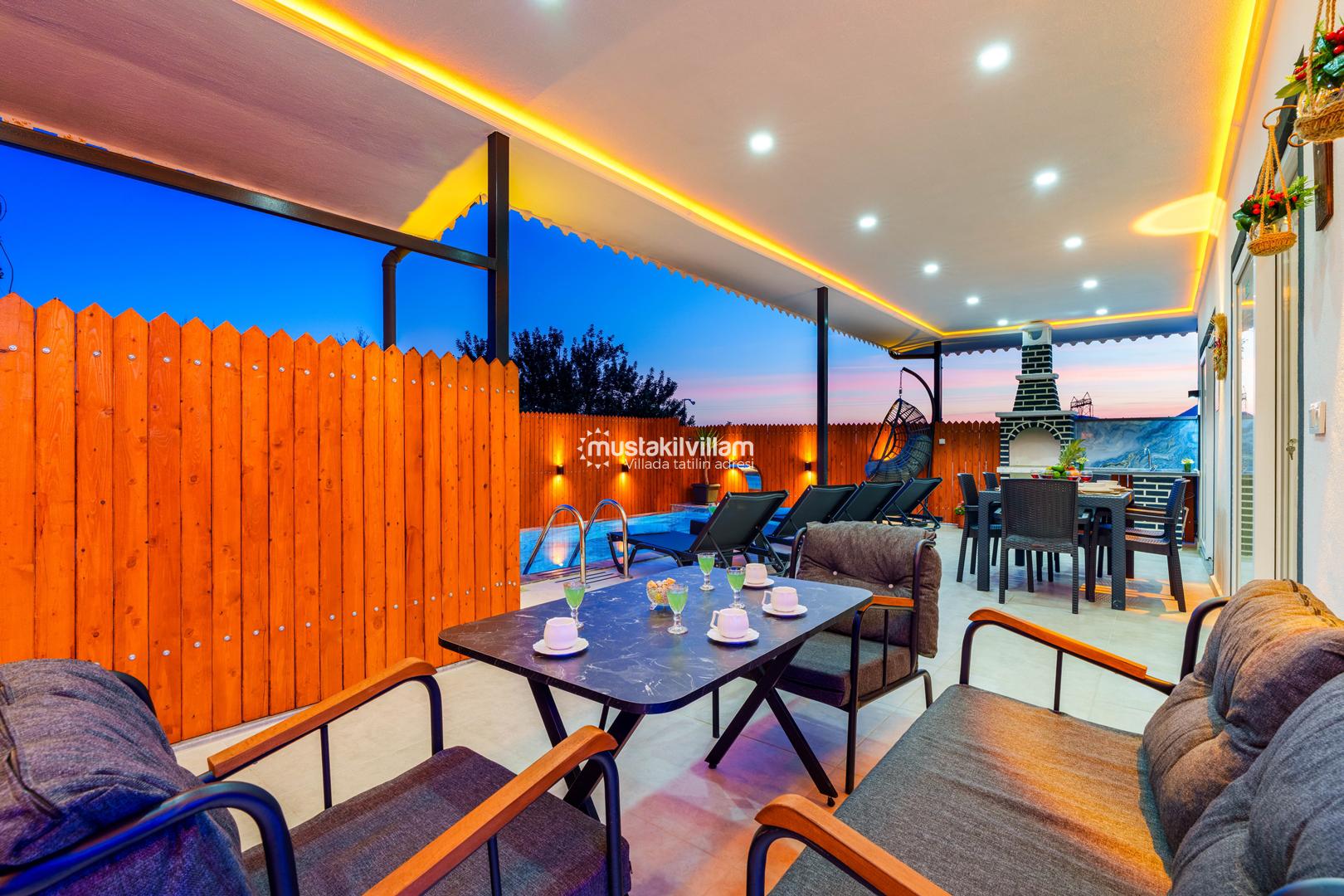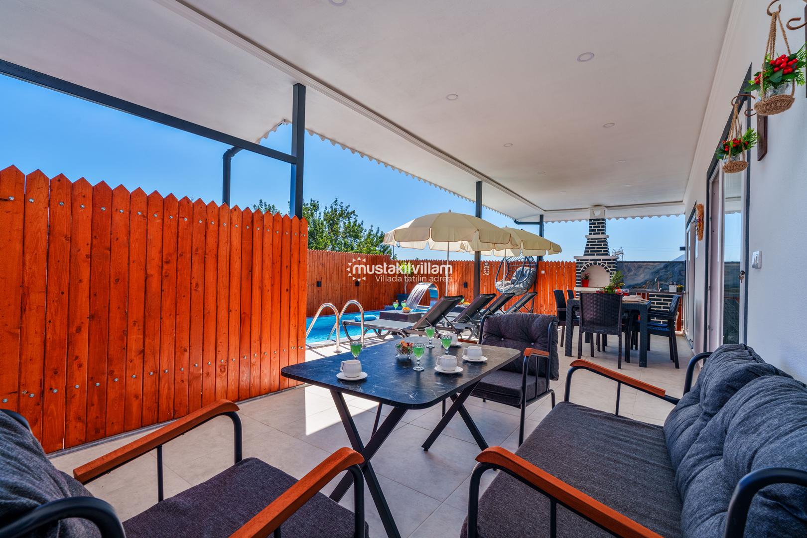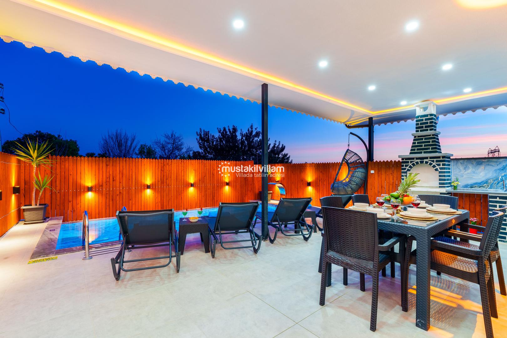 Korunaklı havuz yapısı sayesinde dışarıdan görünmeden rahatça yüzebilir ve güneşlenebilirsiniz. Geniş bahçe alanı, çocuklu aileler için güvenli bir ortam sunarken, akşamları mangal keyfi yapmak için ideal bir alan sağlar.