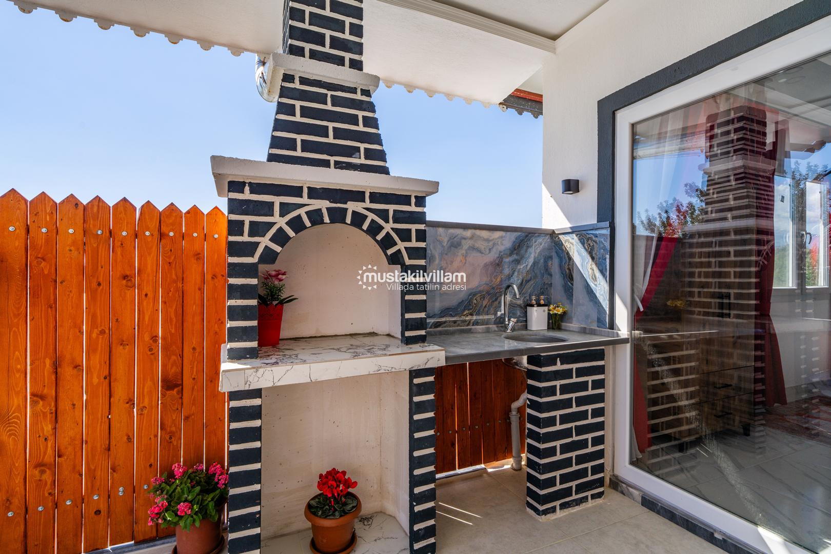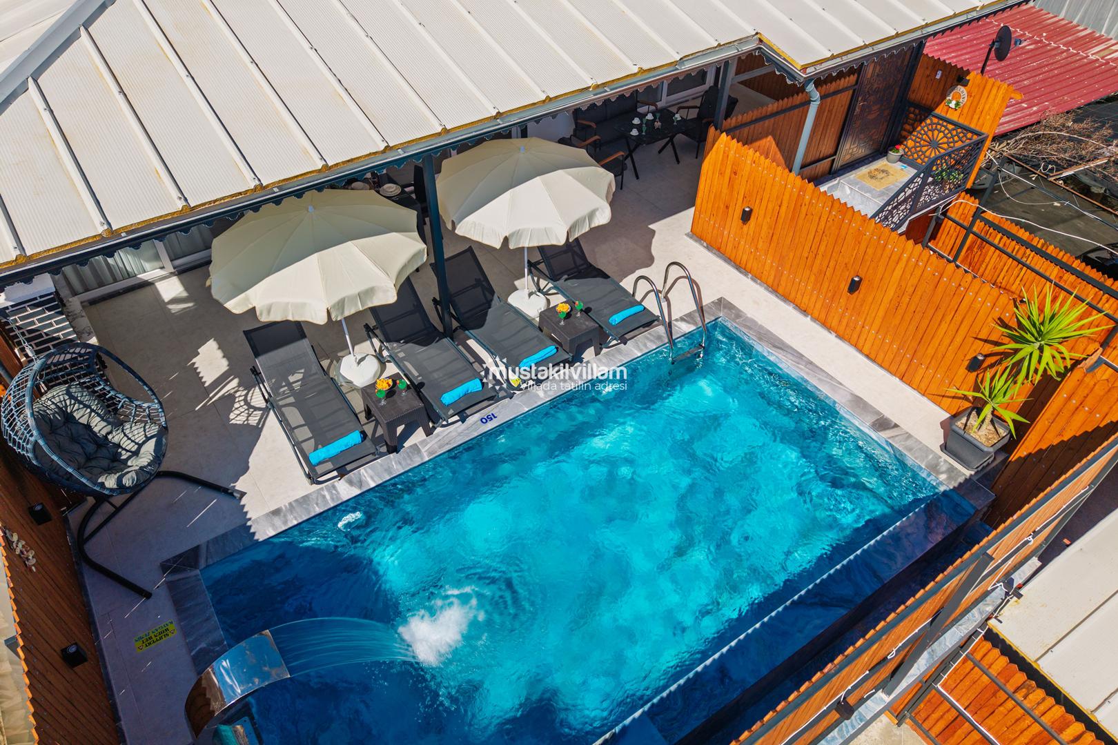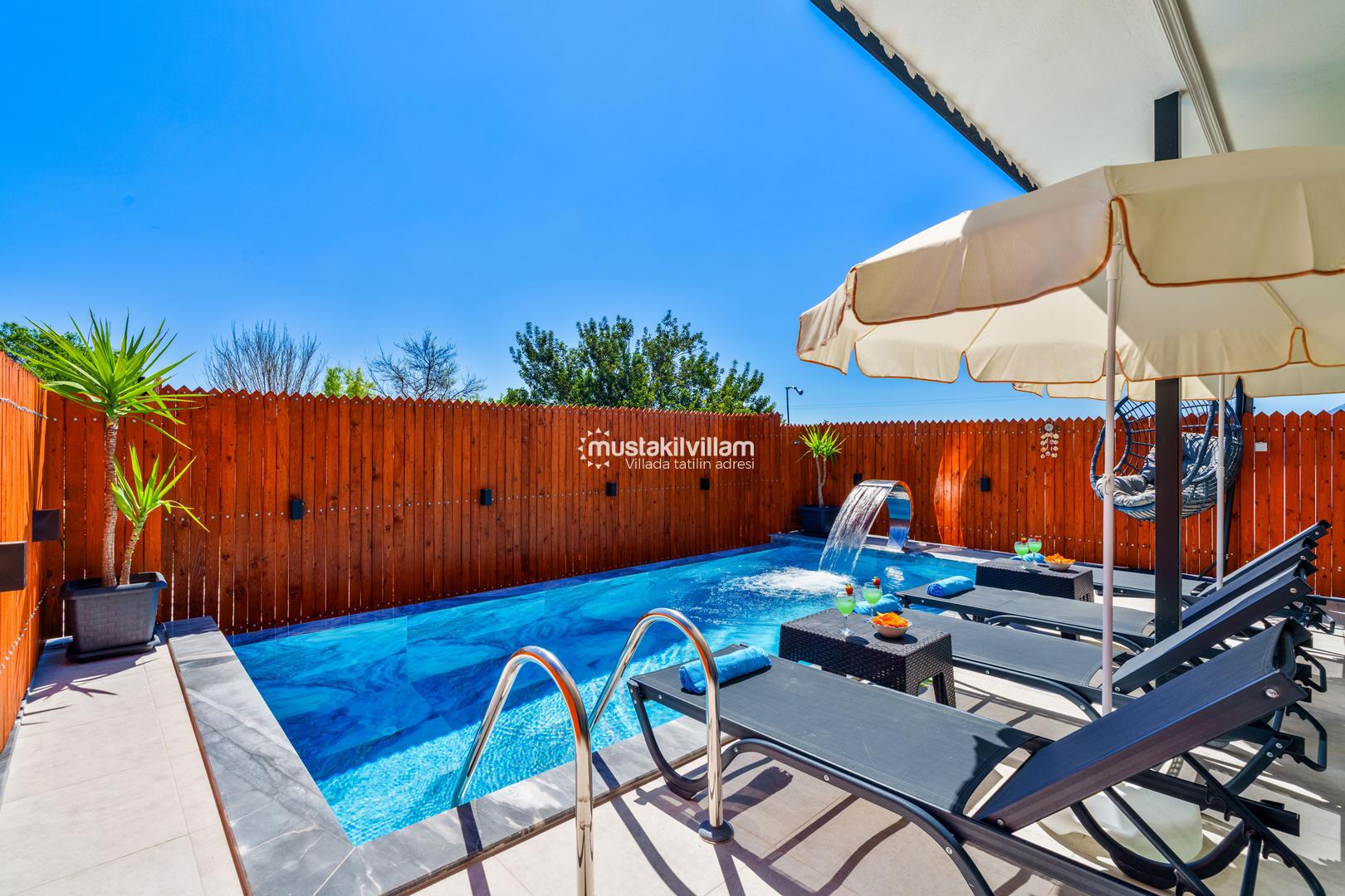 Korunaklı havuz yapısı sayesinde dışarıdan görünmeden rahatça yüzebilir ve güneşlenebilirsiniz. Geniş bahçe alanı, çocuklu aileler için güvenli bir ortam sunarken, akşamları mangal keyfi yapmak için ideal bir alan sağlar.