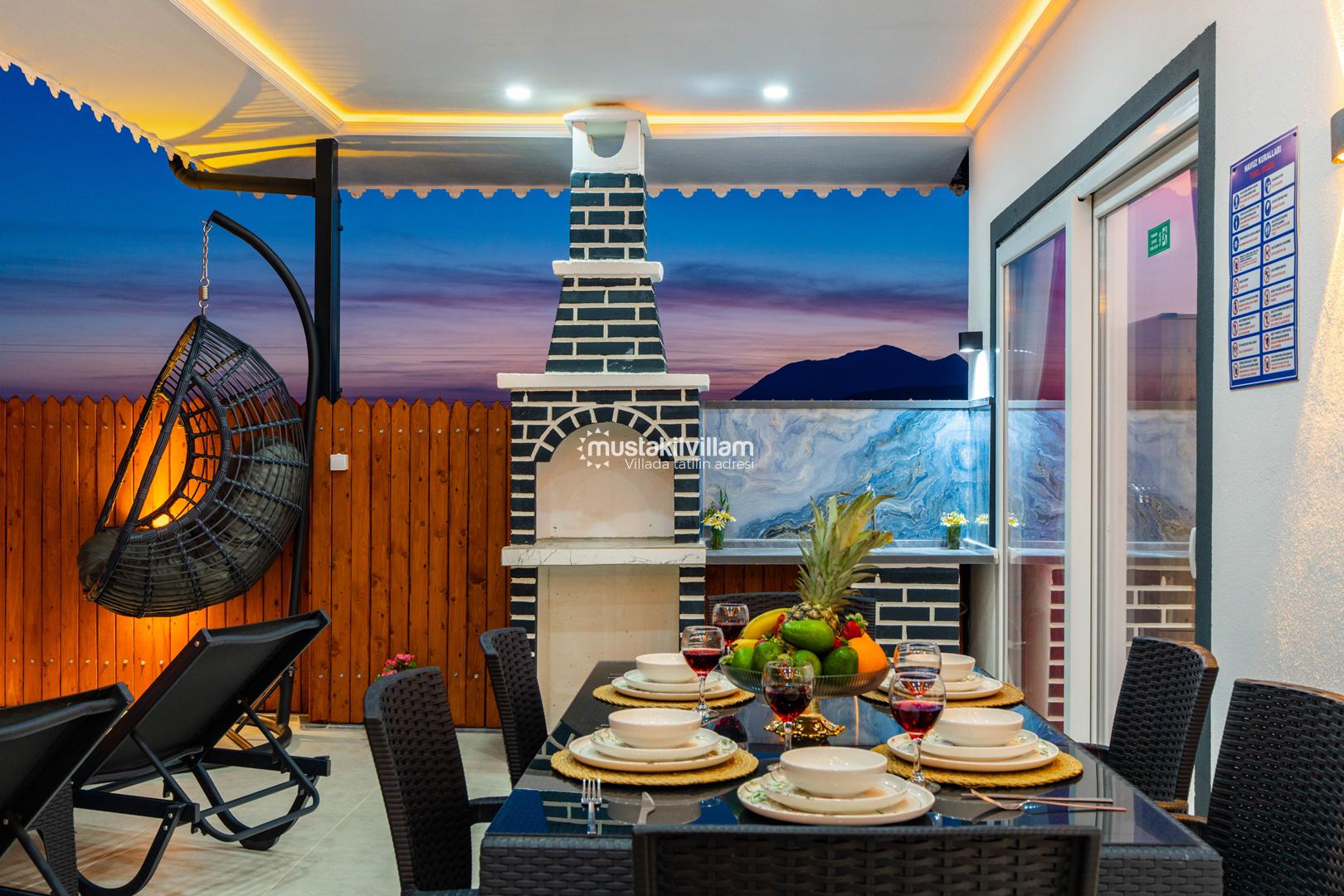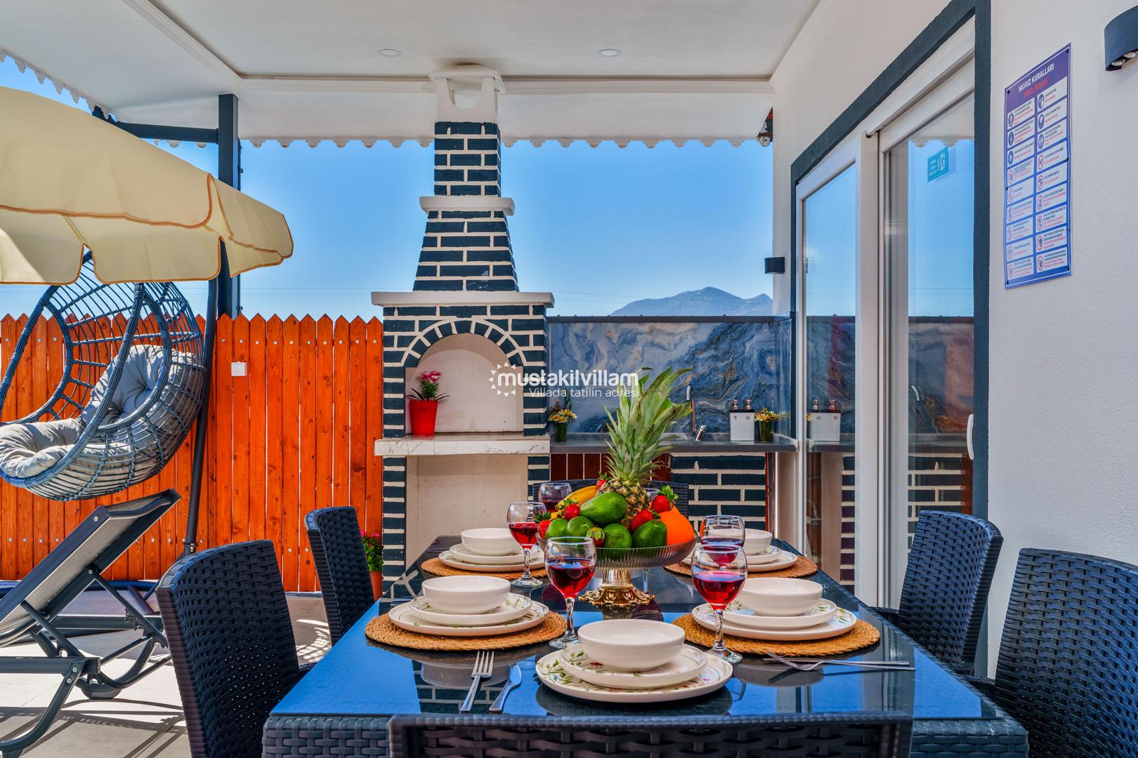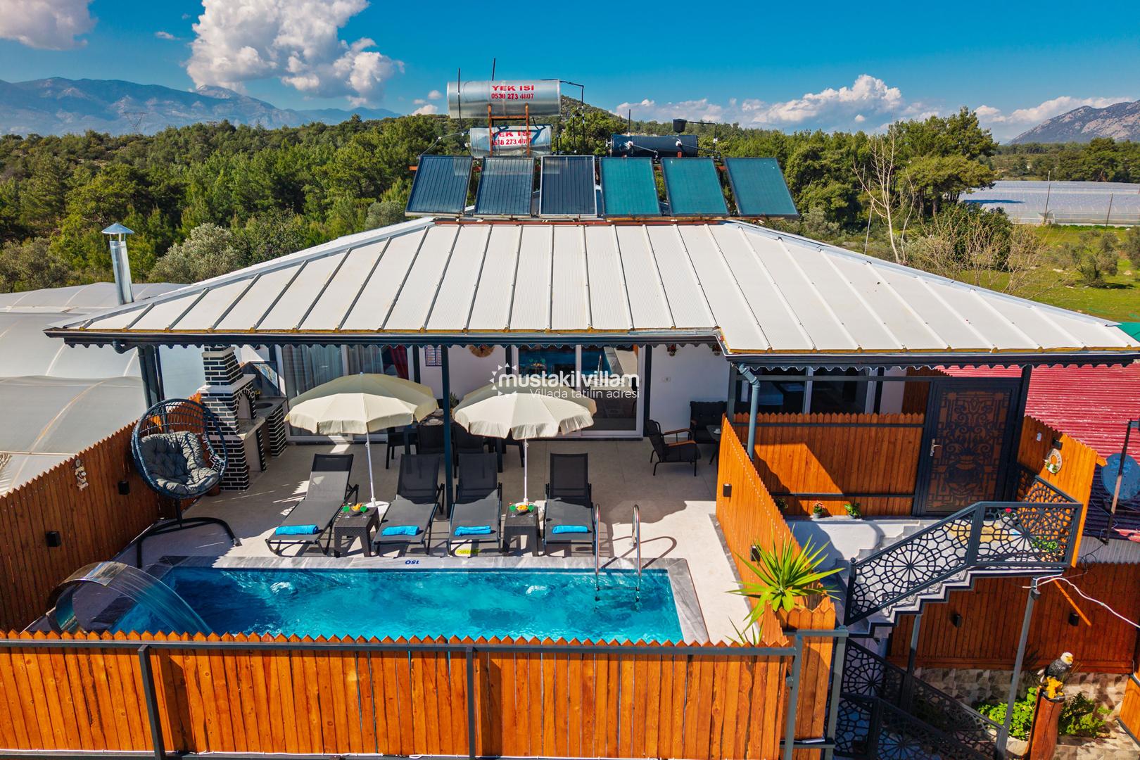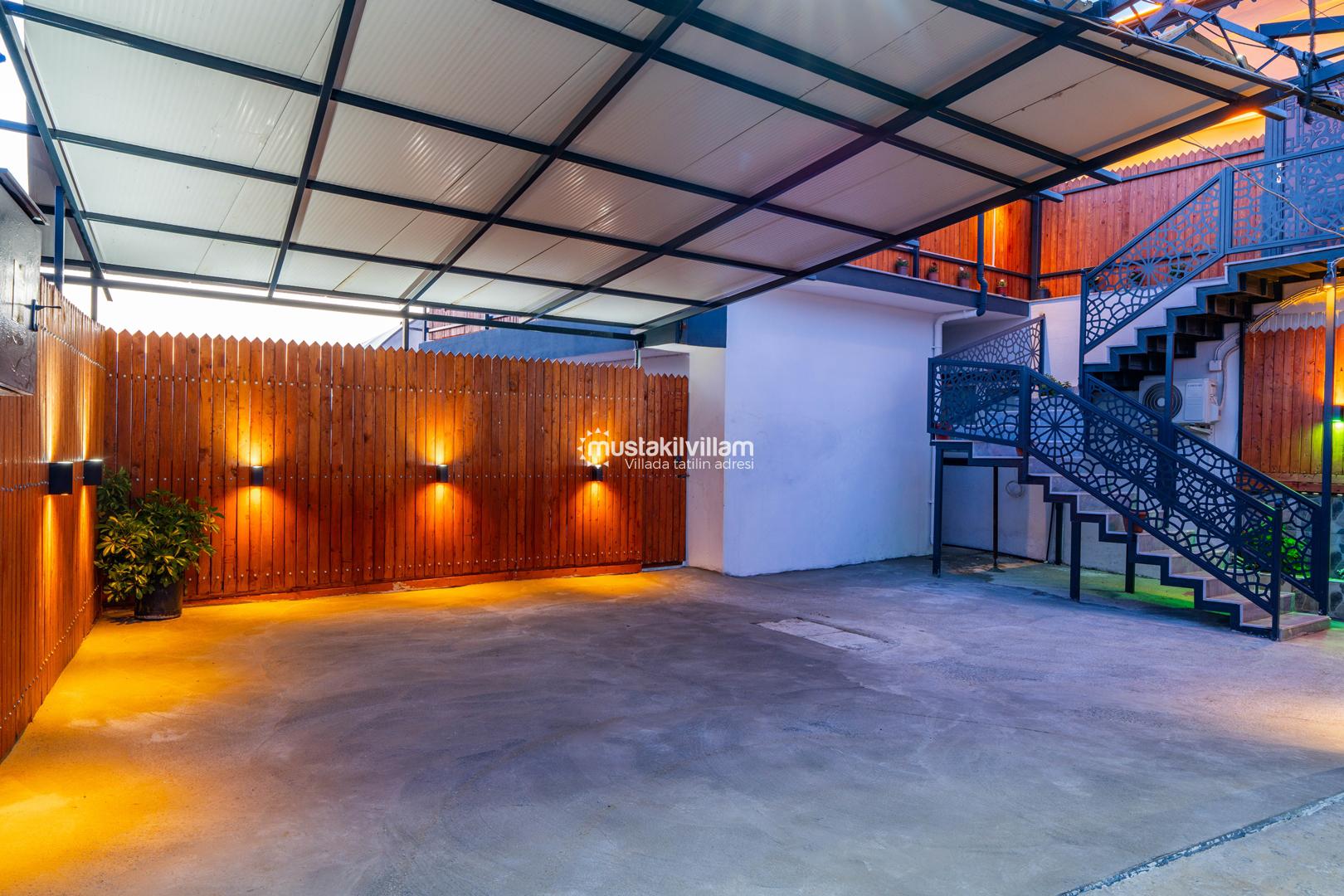 Korunaklı havuz yapısı sayesinde dışarıdan görünmeden rahatça yüzebilir ve güneşlenebilirsiniz. Geniş bahçe alanı, çocuklu aileler için güvenli bir ortam sunarken, akşamları mangal keyfi yapmak için ideal bir alan sağlar.