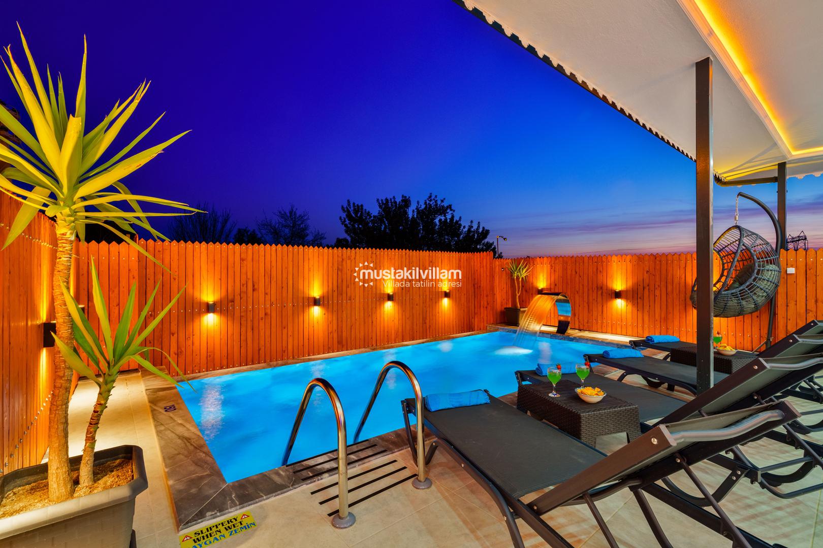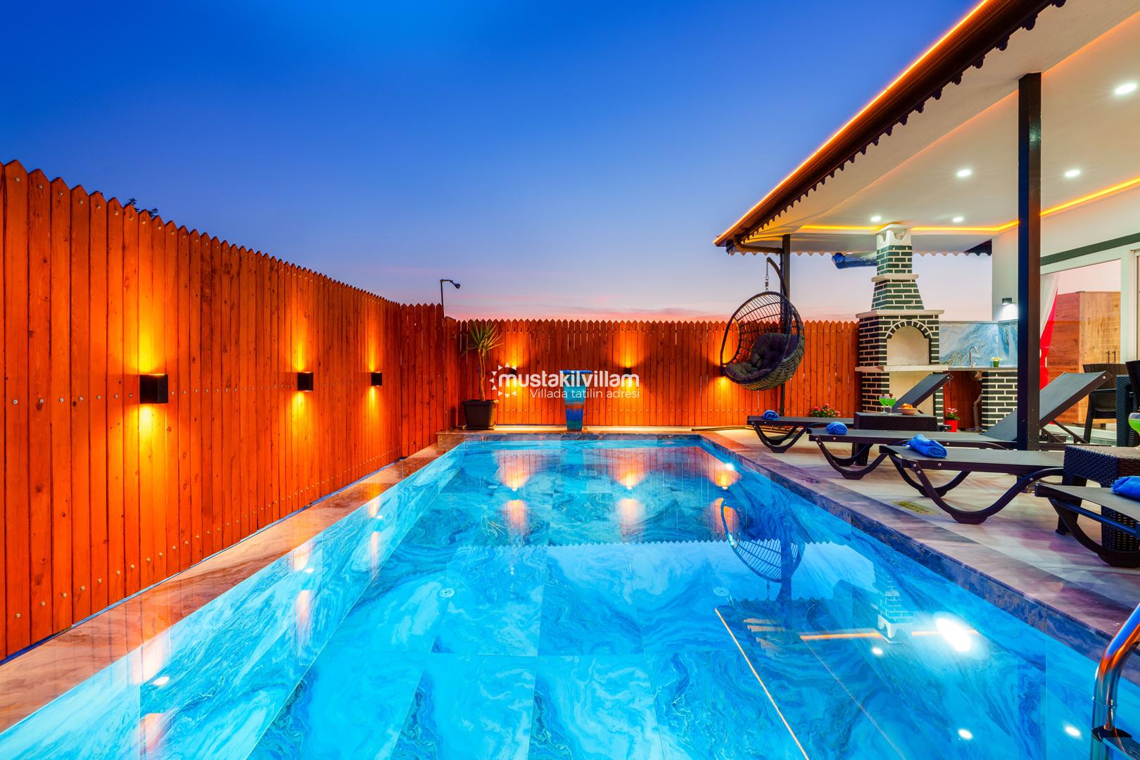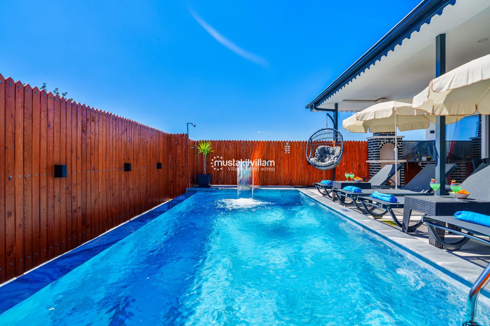 Villa Zirvem’in en dikkat çeken alanlarından biri de korunaklı havuz ve geniş bahçesidir: