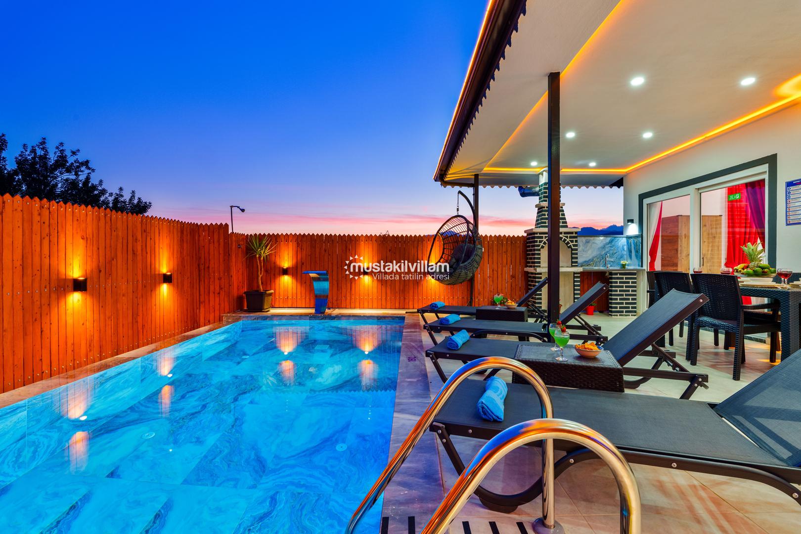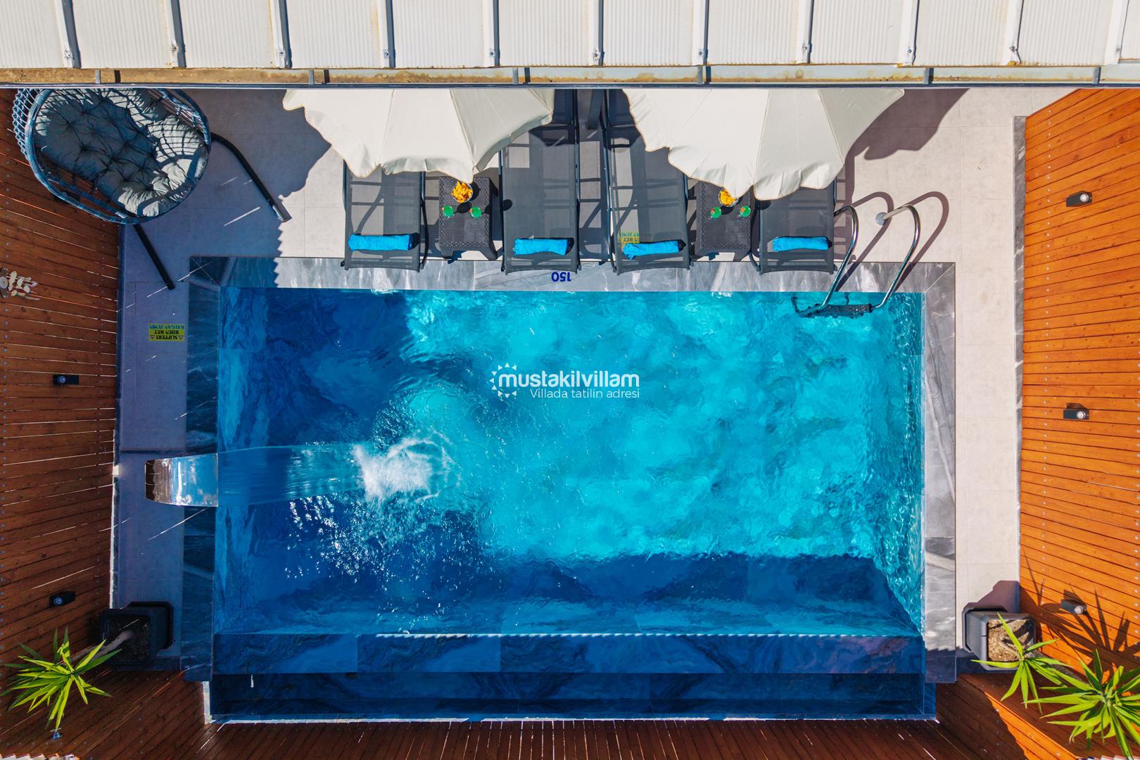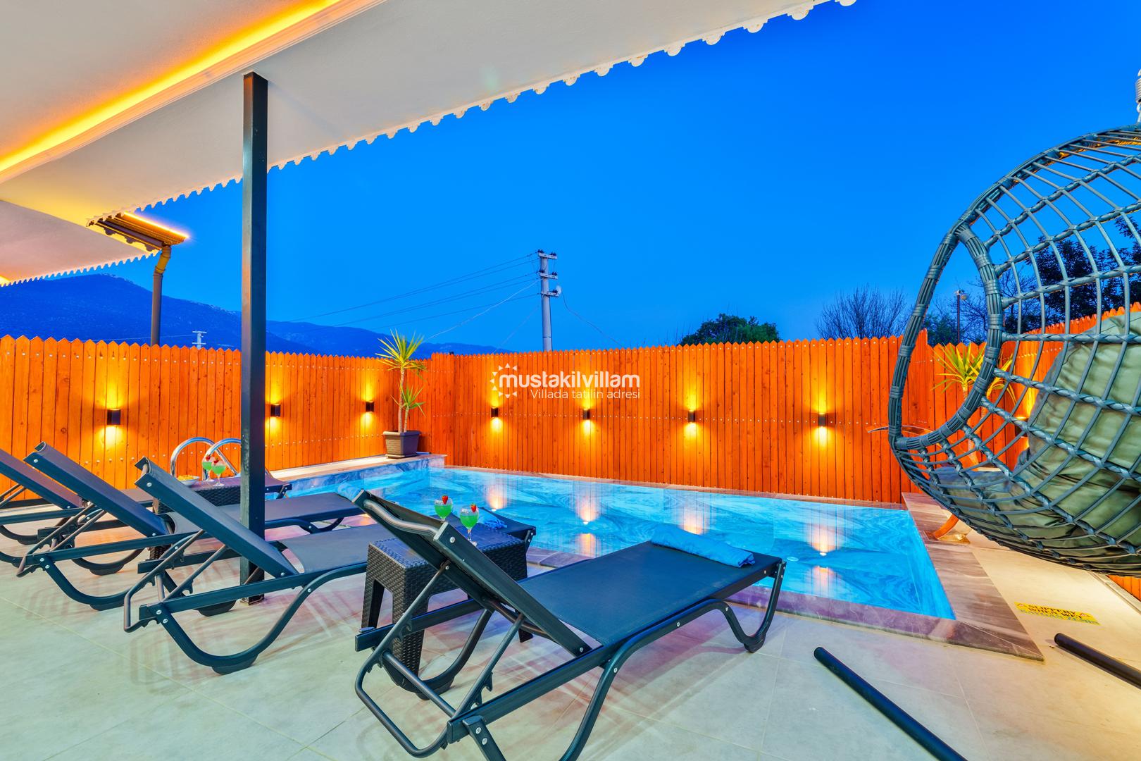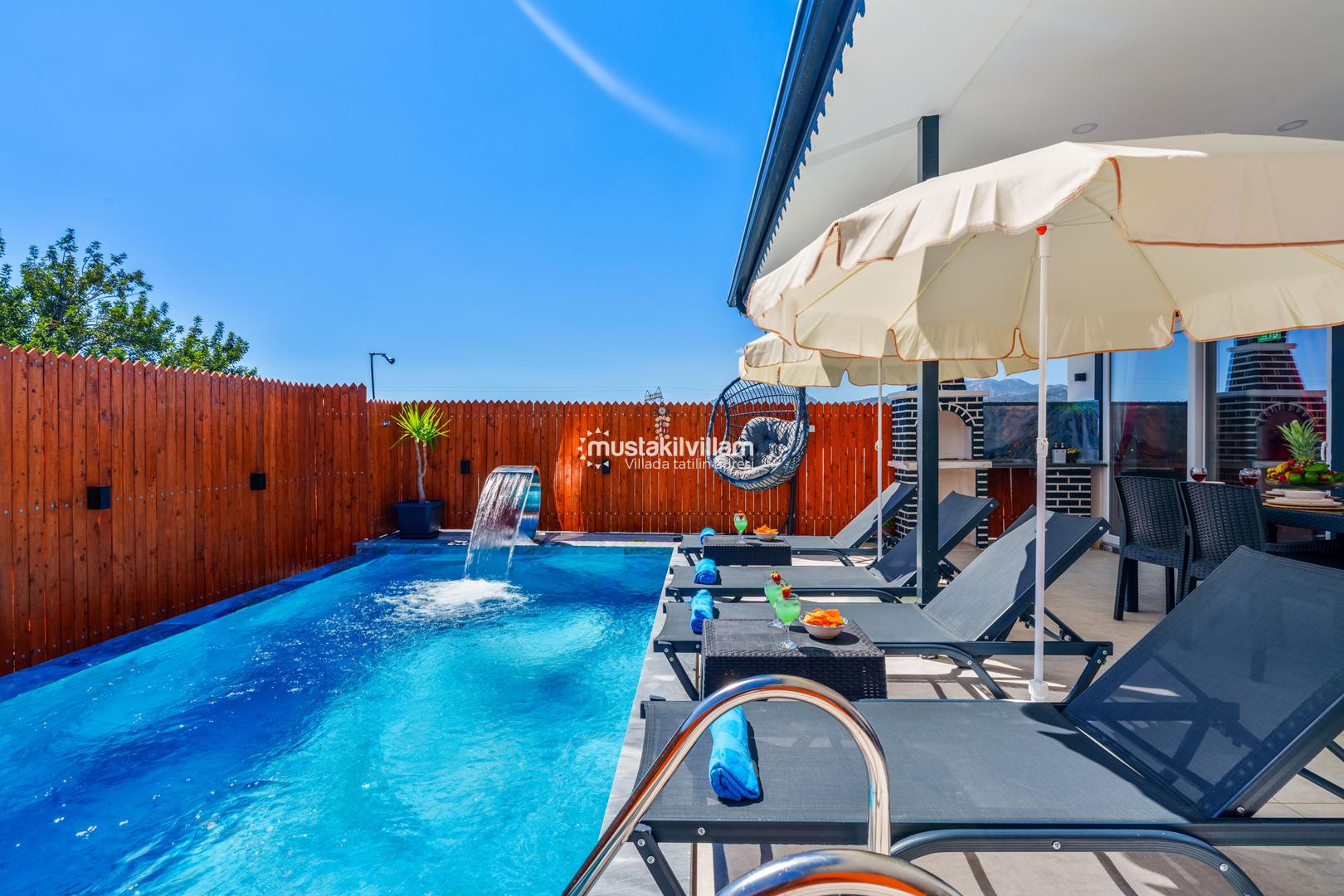 Villa Zirvem’in en dikkat çeken alanlarından biri de korunaklı havuz ve geniş bahçesidir: