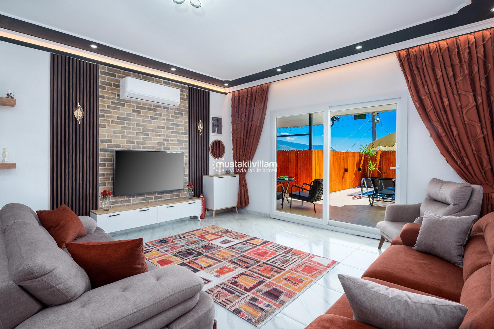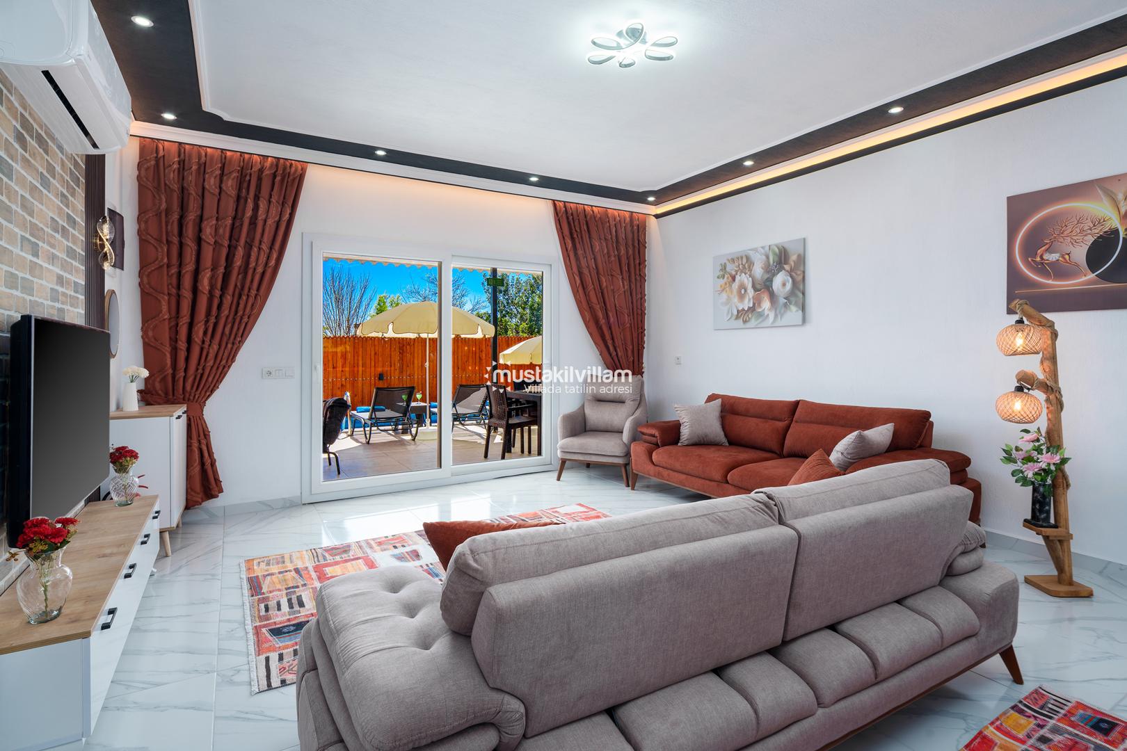Villa Zirvem’in geniş ve ferah salonu, konforlu bir yaşam alanı sunar: